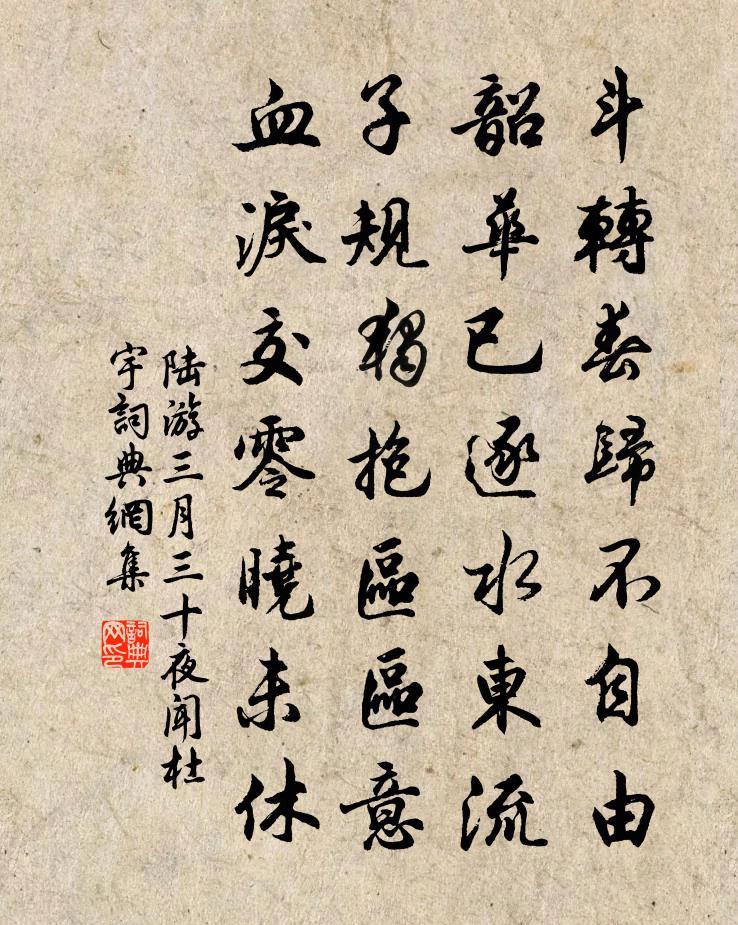 詩詞名句歷史字典書法欣賞書法字典國語詞典說文解字康熙字典古漢語字典標 題 作 者 詩 句 三月三十夜聞杜宇作者:陸游 朝代:宋代三月三十夜聞杜宇原文斗轉春歸不自由,韶華已逐水東流。子規獨抱區區意,血淚交零曉未休。詩詞問答問:三月三十夜聞杜宇的作者是誰?答:陸游問:三月三十夜聞杜宇寫於哪個朝代?答:宋代問:陸游的名句有哪些?答:陸游名句大全陸游三月三十夜聞杜宇書法欣賞三月三十夜聞杜宇書法作品詩詞推薦夕游覆釜山道士觀因登玄元廟錢起〔唐代〕冥搜過物表,洞府次溪傍。已入瀛洲遠,誰言仙路長。孤煙出深竹,道侶正焚香。鳴磬愛山靜,步虛宜夜涼。仍同五馬山李從訓〔宋代〕北山從何來,崑岷而鼻祖。並包河與江,考歷不能譜。近推連括蒼,繼乃至天姥。既而南入台,盤桓遂東下。嵯峨石上種劍蒲其脊成矣非陶隱居所謂溪蓀者耶舒岳祥〔宋代〕崑山片玉天生潤,雁盪移來手自栽。禪客久親清少病,山童勤拂淨無埃。葉端灑灑通心露,根畔疏疏引水苔。必有和陶赴假江陵夜行郊行步月作蘇軾〔宋代〕缺月不早出,長林踏青冥。犬吠主人怒,愧此閭里情。怪我夜不歸,茜袂窺柴荊。雲間與地上,待我兩友生。驚鵲黎廳相併栽柏生意可喜李石〔宋代〕一級寒階不盡登,齊腰立雪我何能。庭前柏樹君知否,便是西來兩代僧。石渠行送別福建參議李著作器之林光朝〔宋代〕我來石渠五十六,雙鬢如蓬腰未曲。豈為健筆有徐庾,自數來時六十五。誰解辛苦續子虛,長安有客四十餘。已成次韻谷口鄭東子見寄戴復古〔宋代〕閉門覓句飯牛翁,囊有新詩不怕窮。十里梅花生眼底,九峰山色滿胸中。答元郎中、楊員外喜烏見寄(四十四字成)白居易〔唐代〕南宮鴛鴦地,何忽烏來止。故人錦帳郎,聞烏笑相視。疑烏報訊息,望我歸鄉里。我歸應待烏頭白,慚愧元郎誤歡送沈元誠赴臨漳主簿陳傅良〔宋代〕誰說鄉先進,能無沈隱侯。青衫今適越,白髮竟依劉。道固為名累,人當與命謀。三台行漸近,且勿問歸舟。餞章郎中以浙東倉歸湖州魏了翁〔宋代〕武陵城中春事濃,楝花欲開未開風。常平使者謝朝列,袖有英盪吾將東。披孔翠裘上馬去,錦韉昱爚三花驄。先攜句徐似道〔宋代〕曉梵魚出聽,夜禪石點頭。壽湖南汪倉十首廖行之〔宋代〕見說奎文得歲時,杓攜天北啟天機。黃陂嗣有公侯氣,牛斗揚光曜紫微。題彌勒院章孝參〔宋代〕橋通流水綠溶溶,殿閣穹然鎮象龍。半壁石橋通雪竇,一龕麗室占雷峰。掛岩屋似六和塔,入路門如九里松。遙想書事趙蕃〔宋代〕我行一何忙,羽檄來星奔。忙行抑何事,列境備戍屯。賊犯連英郴,江右聲已宣。往年縛李金,此邦蓋晏然。而今句戚明瑞〔宋代〕舊夢不堪游螘國,生涯只合在漁舟。興慶池禊宴王庭揚〔宋代〕宗臣上已宴東池,雅俗嘉賓盛集時。禊席臨川花照耀,游車分路水逶迤。賞心唯欲居民樂,縱飲猶虞坐客疲。獨願送方蒙仲赴辟江圖分韻得既字劉克莊〔宋代〕昔忝玉麟招,主君解衣衣。於時事會來,中原方鼎沸。封侯命大謬,更仆談未既。俯仰四十年,歲月堪累欷。多壘題友人山居戴叔倫〔唐代〕四郭青山處處同,客懷無計答秋風。數家茅屋清溪上,千樹蟬聲落日中。恨徐夤〔唐代〕事與時違不自由,如燒如刺寸心頭。烏江項籍忍歸去,雁塞李陵長系留。燕國飛霜將破夏,漢宮紈扇豈禁秋。須知宴公孫倅樂語口號牟巘五〔宋代〕後先相守是鄉人,自有都梁見未曾。藥玉船中頻送酒,鏤金勝畔又行燈。雁橋舊夢猶能記,鳳闕新除自此升。一笑名句推薦短長亭子短長橋,橋外垂楊一萬條。錢枚《憶王孫·短長亭子短長橋》 峨嵋山下少人行,旌旗無光日色薄。白居易《長恨歌》 空將漢月出宮門,憶君清淚如鉛水。李賀《金銅仙人辭漢歌》 吳姬越艷楚王妃,爭弄蓮舟水濕衣。王昌齡《採蓮曲二首》 落花人獨立,微雨燕雙飛。晏幾道《臨江仙·夢後樓台高鎖》 動人以行不以言,應天以實不以文,故我清靜而人自正。房玄齡《晉書·帝紀·第六章》 陌上花開蝴蝶飛,江山猶是昔人非。蘇軾《陌上花三首》 雪虐風饕愈凜然,花中氣節最高堅。陸游《落梅》 吳洲如見月,千里幸相思。李白《送張舍人之江東》 無端和淚拭胭脂,惹教雙翅垂張泌《蝴蝶兒·蝴蝶兒》