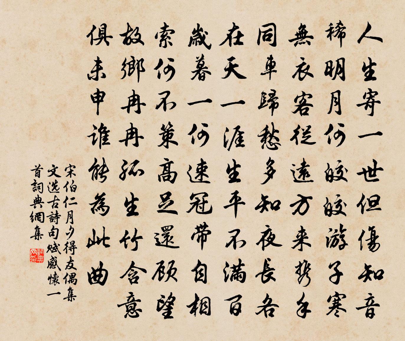 詩詞名句歷史字典書法欣賞書法字典國語詞典說文解字康熙字典古漢語字典標 題 作 者 詩 句 月夕得友偶集文選古詩句賦感懷一首作者:宋伯仁 朝代:宋代原文人生寄一世,但傷知音稀。明月何皎皎,遊子寒無衣。客從遠方來,攜手同車歸。愁多知夜長,各在天一涯。生平不滿百,歲暮一何速。冠帶自相索,何不策高足。還顧望故鄉,冉冉孤生竹。含意俱未申,誰能為此曲。詩詞問答問:《月夕得友偶集文選古詩句賦感懷一首》的作者是誰?答:宋伯仁問:該詩寫於哪個朝代?答:宋代書法欣賞月夕得友偶集文選古詩句賦感懷一首書法作品詩詞推薦梅花 其七王冕〔元代〕疏枝照清淺,一見興何饒?記得春風夜,題詩過斷橋。和鄭康道二首曹勛〔宋代〕耕隱春江水盡頭,一廛已自鄙通侯。好辭遽作春半別,歸意欲兼天際流。我尚未栽三徑竹,君能先泛五湖舟。要來秋興二首黃公度〔宋代〕秋入蒹葭霜正威,數聲歸雁塞痕微。欺人白髮蕭蕭得,未老丹楓故故飛。胡虜乾坤多戰骨,江湖風雨一蓑衣。百年贈豫章來子儀言詩曾豐〔宋代〕少年氣宇要自恢,見人賦詩謂為才,出入常將筆裝懷。中年心地要自息,見人喔詩謂為癖,起居常把口掛壁。子儀用厚後弟強甫韻劉克莊〔宋代〕素昧清真與順庵,偶然愛唱望江南。世因玉佩輕秦七,天把簑衣貴謝三。郢可憂虞成永嘆,漢方隆盛勿多談。古今會稽郡樓雪霽(一作望雪)張繼〔唐代〕江城昨夜雪如花,郢客登樓齊望華。夏禹壇前仍聚玉,西施浦上更飛沙。簾櫳向晚寒風度,睥睨初晴落景斜。數處和枕上吟趙希逢〔宋代〕夢回客枕覺衾寒,展轉憂思不一端。相逢一醉誰能辭,紛紛塵談霏屑玉。主人名閣意寓言,不飲俗客只飲仙。眼前蠟燭楊萬里〔宋代〕未夜身先臥,不春花巳開。泣殘雙淚雨,愁得寸心灰。步西湖次韻徐南卿陳造〔宋代〕水月春猶淺,攜壺記此臨。雲煙澹閒寂,魚鳥媚清深。堤路俄人海,侯家或肉林。高樓下金彈,簾影眇深沈。楊復先寄荔子仍和予昨所贈二詩因次韻晁公溯〔宋代〕林間熟丹實,葉底綴紅雲。並舍皆如事,絕甘能勸分。扣門知使至,登俎覺香聞。更與詩爭麗,紛披錦繡文。寒食文同〔宋代〕蜀客寓秦城,寒威怯夜生。火床功甚小,酒榼力何輕。月外天無色,霜中地有聲。王章龍具薄,數徹郡樓更。晦日宴高氏林亭陳嘉言〔唐代〕公子申敬愛,攜朋玩物華。人是平陽客,地即石崇家。水文生舊浦,風色滿新花。日暮連歸騎,長川照晚霞。應禪人開田求頌釋正覺〔宋代〕飄飄捉杖出煙蘿,行丐身心遽許多。針鼻細中投玉線,機頭密處度金梭。應緣片片雲成雨,分照團團月在波。底意與所盤諸君會石幡還和杜老曲江頭丘葵〔宋代〕青禽生上弄毛衣,飛來檐頭喚不歸。清景每於詩裹見,羈愁惟到海邊稀。僧回古殿山礬落,客散風齋蝙蝠飛。獨得金陵五題台城劉禹錫〔唐代〕台城六代競豪華,結綺臨春事最奢。萬戶千門成野草,只緣一曲後庭花。成都遨樂詩二十一首冬至進天慶觀會太慈寺田況〔宋代〕景至履佳辰,朝祖著國令。黃宮避潛萌,紫宇晨蔭映。陽德比君子,吾道實可慶。矧丁皇運享,遇主堯舜聖。坤維買桑鄭獬〔宋代〕出持舊粟買桑葉,滿斗才換幾十錢。桑貴粟賤不相直,老蠶仰首將三眠。前日風雨乖氣候,凍死箔卷埋中田。蠶不丙戌人日與內侄汪景淵同飲於宜晚二首陳著〔宋代〕憶昔兒嬉祖母旁,如今甲子一周強。盡窗三世親親話,分付兒孫此意長。題開元天寶遺事范成大〔宋代〕朝天車馬詔頻催,斸得新湯未敢開。忽報豬龍掀宇宙,阿瞞虛讀相書來。蘇州洋文天祥〔宋代〕一葉漂搖揚子江,白雲盡處是蘇洋。便如伍子當年苦,只少行頭寶劍裝。名句推薦賴其力者生,不賴其力者不生。墨子《墨子·32章 非樂(上)》 竹憐新雨後,山愛夕陽時。錢起《谷口書齋寄楊補闕》 防民之口,甚於防川。左丘明《國語·周語·邵公諫厲王弭謗》 殘酒憶荊高,燕趙悲歌事未消。陳維崧《南鄉子·邢州道上作》 審其名實,慎其所謂。公孫龍《公孫龍子·名實論》 歸燕識故巢,舊人看新曆。王維《春中田園作》 民為貴,社稷次之,君為輕。孟子《孟子·盡心章句下·第十四節》 慷慨惟平生,俯仰獨悲傷。陸機《門有車馬客行》 竹徑通幽處,禪房花木深。常建《題破山寺後禪院》 三五年時三五月,可憐杯酒不曾消。黃景仁《綺懷》