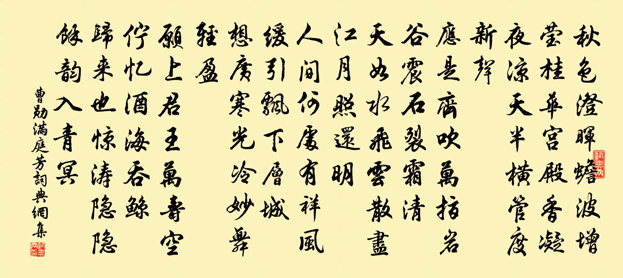 詩詞名句歷史字典書法欣賞書法字典國語詞典說文解字康熙字典古漢語字典標 題 作 者 詩 句 滿庭芳作者:曹勛 朝代:宋代滿庭芳原文秋色澄暉,蟾波增瑩,桂華宮殿香凝。夜涼天半,橫管度新聲。應是齊吹萬指,岩谷震、石裂霜清。天如水,飛雲散盡,江月照還明。人間,何處有,祥風緩引,飄下層城。想廣寒光冷,妙舞輕盈。願上君王萬壽,空佇憶、酒海吞鯨。歸來也,驚濤隱隱,餘韻入青冥。詩詞問答問:滿庭芳的作者是誰?答:曹勛問:滿庭芳寫於哪個朝代?答:宋代問:滿庭芳是什麼體裁?答:詞曹勛滿庭芳書法欣賞滿庭芳書法作品詩詞推薦秋末江行貫休〔唐代〕四顧木落盡,扁舟增所思。雲沖遠燒出,帆轉大荒遲。天際霜雪作,水邊蒿艾衰。斷猿不堪聽,一聽亦同悲。蕭巽葛敏修二學子和予食筍詩次韻答之二首黃庭堅〔宋代〕韭黃照春盤,菰白媚秋菜。惟此蒼竹苗,市上三時賣。江南家家竹,翦伐誰主宰。半以苦見疏,不言甘易壞。葛陂送朱叔止守南劍樓鑰〔宋代〕名畫法書知幾編,俸余寧復計求田。麻沙賸買新文字,歸滿米家書畫船。帝學許月卿〔宋代〕帝學須君入,天游輸我豪。君方註老子,我自讀離騷。湖上春風好,山中夜月高。山高君寄內,湖海我陶陶。秋日金陵制幕書事王同祖〔宋代〕點盡官軍點到民,三千新遣殿司兵。流移更講關防策,預結強丁戍列營。登金山寺張祜〔唐代〕古今斯島絕,南北大江分。水闊吞滄海,亭高宿斷雲。返潮千澗落,啼鳥半空聞。皆是登臨處,歸航酒半醺。潭上作張喬〔唐代〕竹島殘陽映翠微,雪翎禽過碧潭飛。人間未有關身事,每到漁家不欲歸。苦雨方回〔宋代〕擬勒移文問雨龍,麥秋忍不念吾農。黃雲萬頃成泥爛,偏與閒檐活瓦松。石左藏輓詩二首文同〔宋代〕世澤傳清范,戎韜演秘謀。雄藩未賜節,大壑忽移舟。謝氏胡床在,羊公羽扇收。光華歸令子,何恨掩泉丘。楊尉見招朱推單令與焉月色甚佳胡寅〔宋代〕南郭無緣到北城,卻因招喚得同行。四郊禾黍未全熟,滿眼雲山何限情。幸有好風能灑袂,況無閒事稱揮觥。籃輿宴坐陸游〔宋代〕鼓樂弦歌萬二千,天魔剩欲破幽禪。道人袖手心如水,一點紗燈夜悄然。南陵五松山別荀七李白〔唐代〕君即潁水荀,何慚許郡賓。相逢太史奏,應是聚寶人。玉隱且在石,蘭枯還見春。俄成萬里別,立德貴清真。野月釋惠璉〔宋代〕野月今宵滿,小庭人共瞻。卻愁人去後,殘魄獨窺檐。宿杜判官江樓郎士元〔唐代〕適楚豈吾願,思歸秋向深。故人江樓月,永夜千里心。葉落覺鄉夢,鳥啼驚越吟。寥寥更何有,斷續空城砧。仙遊楊冠卿〔宋代〕迢迢秋夜長,娟娟霜月明。隱几觀萬變,頫仰周八紘。人間厭謫墮,翳鳳騎長鯨。寥天排雲征,高步撫流星。群仙雨中過昱嶺吳錫疇〔宋代〕下輿扶杖過山蹊,雨濺征裾屐濺泥。正自不禁行路苦,一聲何處竹雞啼。張守招隱陳造〔宋代〕春風吹作萬家春,誰得聯鑣從使君。微徑問花同載酒,深堂剪燭細論文。王郎把臂簪仍蓋,嚴老呼舟首又分。安得陵陽春日(一作移攝太守寄汝洛舊遊)許渾〔唐代〕百年身世似飄蓬,澤國移家疊嶂中。萬里綠波魚戀釣,九重青漢鶴愁籠。西池水冷春岩雪,南浦花香曉樹風。縱倒污亭邵雍〔宋代〕許由為計未為深,洗耳如何不動心。到此洒然如世外,何嘗更有事來侵。春夕閒詠林逋〔宋代〕屐齒遍庭深,時為擁鼻吟。微風引竹籟,斜月轉花陰。靜賞應難極,孤懷自不禁。蒼然小池上,煙露達青岑。名句推薦笑綠鬟鄰女,倚窗猶唱,夕陽西下。蔣捷《女冠子·元夕》 莫等閒,白了少年頭,空悲切!岳飛《滿江紅·寫懷》 巧言令色,鮮矣仁。孔子弟子《論語·學而篇》 聖人之官人,猶匠之用木也,取其所長,棄其所短。司馬光《資治通鑑·周紀一》 不知庭霰今朝落,疑是林花昨夜開。宋之問《苑中遇雪應制》 長安白日照春空,綠楊結煙垂裊風。李白《陽春歌》 何處望神州?滿眼風光北固樓。辛棄疾《南鄉子·登京口北固亭有懷》 月黑見漁燈,孤光一點螢。查慎行《舟夜書所見》 百戰沙場碎鐵衣,城南已合數重圍。李白《從軍行》 將入門,問孰存。將上堂,聲必揚。李毓秀《弟子規·謹》