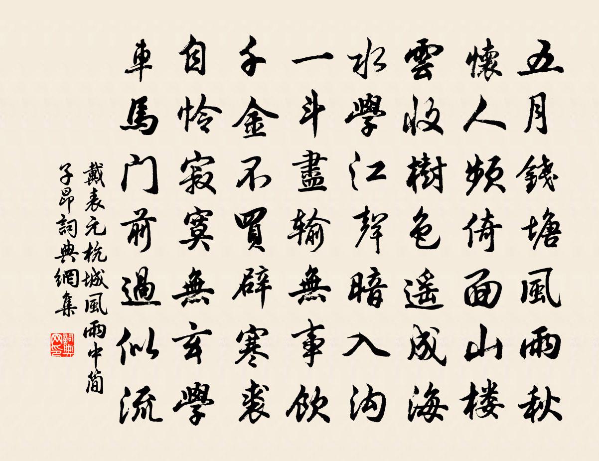 詩詞名句歷史字典書法欣賞書法字典國語詞典說文解字康熙字典古漢語字典標 題 作 者 詩 句 杭城風雨中簡子昂作者:戴表元 朝代:宋代杭城風雨中簡子昂原文五月錢塘風雨秋,懷人頻倚面山樓。雲收樹色遙成海,水學江聲暗入溝。一斗盡輸無事飲,千金不買辟寒裘。自憐寂寞無玄學,車馬門前過似流。詩詞問答問:杭城風雨中簡子昂的作者是誰?答:戴表元問:杭城風雨中簡子昂寫於哪個朝代?答:宋代戴表元杭城風雨中簡子昂書法欣賞杭城風雨中簡子昂書法作品詩詞推薦題西湖畫軸吳龍翰〔宋代〕丹青誰寫滿軸蓮,濯濯西施一段妍。汴水百年塵隔斷,可無人作畫圖傳。蕭著作宰豐城梅堯臣〔宋代〕王都二月花正開,社雨作陰迎燕子。人先春色向江南,江南春色歸春水。拍岸綠波生荻芽,晨羞聊可助甘旨。縣塗和洪司令梅花吳泳〔宋代〕結綺臨春貯麗華,吹香偶到野人家。霜明月白紗窗淨,但見梅詩不見花。香玉花張鎡〔宋代〕風雨溪山數宿,歸來盡有佳晴。小疾何妨隱几,隔窗嬌聽鶯聲。遣熱二首蘇泂〔宋代〕人生萬家室,大暑亦勞勞。滴 * 周易,臨風歌楚騷。朱丹誰復羨,斑白懶能薅。一笑問兒子,汝何催我曹。紀羅楊二子游南嶺石人峰楊萬里〔宋代〕二子同游石人峰,深行翠筱黃茅中。初嫌微徑無人蹤,行到半嶺徑亦窮。來時猶自聞雞犬,且行且語不覺遠。上頭穀雨朱槔〔宋代〕天點紛林際,虛檐寫夢中。明朝知穀雨,無策禁花風。石渚收機巧,煙蓑建事功。越禽牢閉口,吾道寄天公。奉和幸大薦福寺宋之問〔唐代〕香剎中天起,宸游滿路輝。乘龍太子去,駕象法王歸。殿飾金人影,窗搖玉女扉。稍迷新草木,遍識舊庭闈。水入岩起錄示次韻張乾佳什輒和寄之以道山居之況李彌遜〔宋代〕前山立玉水縈羅,逕竹當門一里過,管子與予成莫逆,麴生邀我到無何,老來鶴骨寒猶健,病起霜髭短更多。金印古驛艾性夫〔宋代〕舊時鄰曲各東西,野蔓荒藤壓樹低。過盡路牌無客影,一岡秋雨鷓鴣啼。再和項安世〔宋代〕湖海崢嶸老氣,風雲慘澹高情。可惜元龍雙鬢,江南江北詩聲。春夜溫故六言二十首劉克莊〔宋代〕辨才師苦死愛,文皇帝得許痴。溫韜劫陵大盜,蕭翼穿窬小兒。初夏雜詠陸游〔宋代〕屐路緣虛壁,棋軒枕小灘。玄言不媿籍,熟睡卻輸摶。咄咄書常嬾,便便腹本寬。山園時節好,杏子已微丹。游乾明分韻得山字陳造〔宋代〕一從雋軌得追攀,日日江皋倒載還。貪向諸公論友義,未容老子憶家山。酒邊鯨吸仍疇昔,筆底羊腸出險艱。莫便丙寅十四首效韋蘇州黃庭堅〔宋代〕寺古老僧靜,亭陰修竹多。萊公作州日,部曲屢經過。眾推識公面,蒼石眠綠莎。粉蝶兒慢周邦彥〔宋代〕宿霧藏春,餘寒帶雨,占得群芳開晚。艷初弄秀,倚東風嬌懶。隔葉黃鸝傳好音,喚入深叢中探。數枝新,比昨朝潤州韓維〔宋代〕雄風搖碧綠,畫角吊黃昏。一帶分江記,雙峰點海門。乾丹陽宰乞米史千〔宋代〕知君愛物與人民,敢造琴堂訴在陳。斗水果能相活否,今年猶甚去年貧。景仁欠道齋禮院予與和叔過之值其方飲引去二韓維〔宋代〕自我伏田裡,三駕游上都。其誰肯來顧,莫與夫子如。久積疏野抱,況茲病{上艹下爾}余。厚意不即報,悁勞在句悟清〔唐代〕鳥歸花影動,魚沒浪痕圓。名句推薦表獨立兮山之上,雲容容兮而在下;屈原《九歌》 勿營華屋,勿謀良田。朱柏廬《朱子家訓·全文》 可堪更近乾龍節,眼中淚盡空啼血向子諲《秦樓月·芳菲歇》 欲加之罪,其無辭乎?左丘明《左傳·僖公·僖公十年》 不用訴離觴,痛飲從來別有腸。蘇軾《南鄉子·和楊元素時移守密州》 四海十年兵不解,胡塵直到江城。陳克《臨江仙·四海十年兵不解》 欲買桂花同載酒,終不似,少年游。劉過《唐多令·蘆葉滿汀洲》 嗜欲不能勞其目,淫邪不能惑其心佚名《黃帝內經·上古天真論》 童子柳陰眠正著,一牛吃過柳陰西。楊萬里《桑茶坑道中》 紫泉宮殿鎖煙霞,欲取蕪城作帝家。李商隱《隋宮》