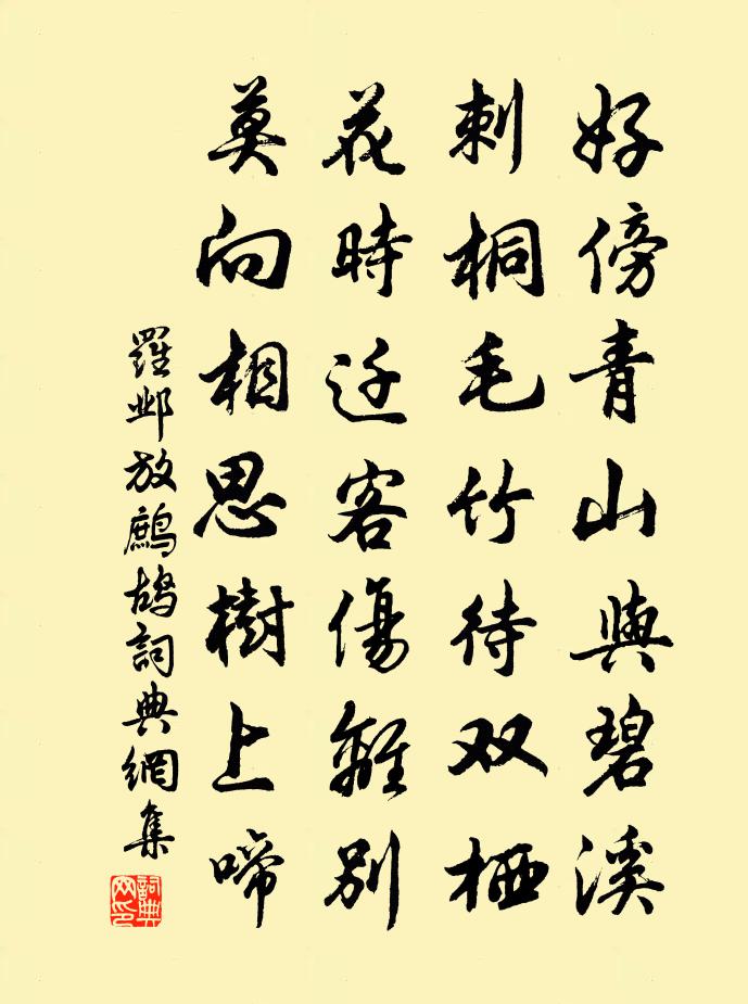 詩詞名句歷史字典書法欣賞書法字典國語詞典說文解字康熙字典古漢語字典標 題 作 者 詩 句 放鷓鴣作者:羅鄴 朝代:唐代放鷓鴣原文好傍青山與碧溪,刺桐毛竹待雙棲。花時遷客傷離別,莫向相思樹上啼。詩詞問答問:放鷓鴣的作者是誰?答:羅鄴問:放鷓鴣寫於哪個朝代?答:唐代問:放鷓鴣是什麼體裁?答:七絕羅鄴放鷓鴣書法欣賞放鷓鴣書法作品注釋全唐詩:卷654-87詩詞推薦一翁釋了惠〔宋代〕朕兆未分初,都盧只老夫。包羲太多事,胡處雙添須。惜嬰嬌侯善淵〔元代〕猛悟回頭,把塵事都忘了。急收心、速歸大道。空里尋真,向無中傳明教。最好。現丹華,迴光返照。探頤精微,再答趙汝騰〔宋代〕人間姚魏總輿台,獨占神仙上品開。絕代詞華三峽倒,當時諫草九天回。晚晴大白檐前舉,春暖小車花下來。筆補頌古三十一首釋如本〔宋代〕百丈野狐,兩耳卓朔。脫兮不昧,墮兮不落。不昧不落,何是何錯。若於當處不留情,萬里晴空步寥廓。自述蘇泂〔宋代〕交友凋零似曉星,生涯依舊短長亭。前身房琯仍名永,今代蘇耽不姓丁。兒女成行頭自白,湖山相對眼終青。還鄉秋晚矣菊猶未開小詩速之虞儔〔宋代〕問訊東籬菊,如今開未開。不應辜酒伴,寧是欠詩催。屈指秋將盡,關心日幾回。霜風不相借,何意尚徘徊。孔明徐鈞〔宋代〕草廬初志漢重興,向洛趨秦擬策勛。芒角一星如未墜,不就天下只三分。謁客林之奇〔宋代〕入門投謁吏翩翩,我非欲見禮則然。異哉賓主兩無語,客起疾如走避燃。我已不恭愧昔賢,忍使泥塗朝衣冠。人生言懷·恨乏平戎策高駢〔唐代〕恨乏平戎策,慚登拜將壇。手持金鉞冷,身掛鐵衣寒。主聖扶持易,恩深報效難。三邊猶未靜,何敢便休官?送元贊府重任龍門縣盧綸〔唐代〕二職亞陶公,歸程與夢同。柳垂平澤雨,魚躍大河風。混跡威長在,孤清志自雄。應嗤向隅者,空寄路塵中。雜曲歌辭大酺樂杜審言〔唐代〕聖后乘乾日,皇明御歷辰。紫宮初啟坐,蒼璧正臨春。雷雨垂膏澤,金錢賜下人。詔酺歡賞遍,交泰睹惟新。毗陵嘉泰三年皇后冊寶十三首佚名〔宋代〕日薰椒屋,雲靄壁門。有華瑞節,來自帝閽。統天惟乾,合德者坤。我龍受之,福祿永敏。道損司門前日過訪別且雲計程二月到郡正看暗梅堯臣〔宋代〕蜀州海棠勝兩川,使君欲賞意已猶。春露洗開千萬株,燕脂點素攢細梗。朝看不足暮秉燭,何暇更尋桃與杏。青泥庚戌冬乘浣隙謁西林寺漸老二首曾豐〔宋代〕傳衣今北秀,駐錫小西林。握手鼎相別,敲門踵見尋。溫顏塵外禮,軟語法中音。從此利名垢,那容點我降,宇文樞密輓詩魏了翁〔宋代〕人物眇然甚,天胡不憗公。北風鳴槭槭,西火亂蓬蓬。襄鄂誰專閫,江淮孰總戎。是應當饋嘆,曩日鎮江功。載酒王安石〔宋代〕載酒欲尋江上舟,出門無路水交流。黃昏獨倚春風立,看卻花開觸地愁。酬柏侍御聞與韋處士同游靈台寺見寄王建〔唐代〕西域傳中說,靈台屬雍州。有泉皆聖跡,有石皆佛頭。所出薝蔔香,外國俗來求。毒蛇護其下,樵者不可偷。古碑賀新郎(壽程於潛)洪咨夔〔宋代〕風軟簾花約。玉壺天、芙蕖欲蓋,篔簹初槊。宿靄收陰晴色定,一點星明碧落。光拍滿、浮溪岝β。銀櫛鐵冠風物次韻和天章范待製上元從幸會靈觀晏殊〔宋代〕春鶯欲滿枝,荷橐從游時。旭日生華蓋,靈風入羽旗。酒含雕玉淺,香度博山遲。共識天顏近,都忘尺漏移。暑退方回〔宋代〕逆旅朝難夕,更生暑忽涼。自能捐嗜欲,足可看奔忙。即恐來鴻雁,翻成畏雪霜。去年幾人健,同與嗅秋香。名句推薦未必素娥無悵恨,玉蟾清冷桂花孤。晏殊《中秋月》 風住塵香花已盡,日晚倦梳頭。李清照《武陵春·春晚》 不須更上新亭望,大不如前灑淚時。虞集《挽文丞相》 報導山中去,歸時每日斜皎然《尋陸鴻漸不遇》 凡與敵戰,其將愚而不知變,可誘之以利。佚名《百戰奇略·第五卷·利戰》 戒惕弗棄,智勇弗顯。來俊臣《羅織經·事上卷第二》 時人不識凌雲木,直待凌雲始道高。杜荀鶴《小松》 智者畏禍,愚者懼刑;言以誅人,刑之極也。來俊臣《羅織經·刑罰卷第十一》 石欄斜點筆,桐葉坐題詩杜甫《重過何氏五首》 亂碧萋萋,雨後江天曉。梅堯臣《蘇幕遮·草》
