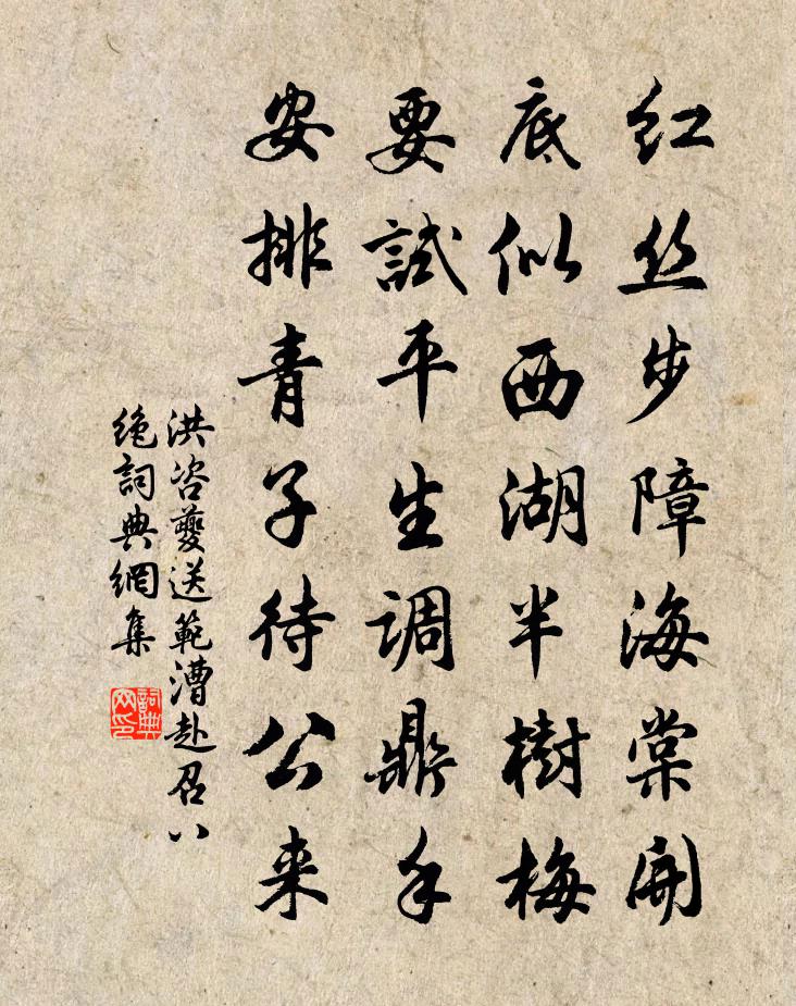 詩詞名句歷史字典書法欣賞書法字典國語詞典說文解字康熙字典古漢語字典標 題 作 者 詩 句 送范漕赴召八絕作者:洪咨夔 朝代:宋代送范漕赴召八絕原文紅絲步障海棠開,底似西湖半樹梅。要試平生調鼎手,安排青子待公來。詩詞問答問:送范漕赴召八絕的作者是誰?答:洪咨夔問:送范漕赴召八絕寫於哪個朝代?答:宋代洪咨夔送范漕赴召八絕書法欣賞送范漕赴召八絕書法作品詩詞推薦千秋歲(和人)李之儀〔宋代〕中秋才過,又是重陽到。露乍冷,寒將報。綠香催渚芰,黃密攢庭草。人未老,藍橋謾促霜砧搗。照影蘭缸暈,破玉樓春(擬宮詞)高觀國〔宋代〕幾雙海燕來金屋。春滿離宮三十六。春風翦草碧纖纖,春雨浥花紅撲撲。衛姬鄭女腰如束。齊唱陽春新制曲。曲終初秋閒記園池草木范成大〔宋代〕一株蕭索倚宣華,東苑香風屬內家。丹碧屠蘇銀燭照,平生奇絕象山花。自愛仇遠〔宋代〕金淵豈愛我,我自愛金淵。似蜜醪尤美,如珠米更圓。攜家逾八口,竊祿又三年。書冊盈歸篋,毋嫌載月船。送吟卷還趙萬里潘璵〔宋代〕吟中蜚依聲,太白是前身。風月無非我,江山得主人。冰梭織古錦,廟瑟奏陽春。洗眼觀新稿,客懷清絕塵。夜半觀潮錢時〔宋代〕月夜舟如天上坐,極目更無山一個。海神夜半忽出奇,雷鼓長驅雪山過。蠟燭鄭谷〔唐代〕仙漏遲遲出建章,宮簾不動透清光。金闈露白新裁詔,畫閣春紅正試妝。淚滴杯盤何所恨,燼飄蘭麝暗和香。多情春日絕句陸游〔宋代〕門前喚擔買芳菲,白髮猶堪插一枝。舊厭蛙聲今喜聽,牆陰特地作盆池。贈易數胡一鑒易士達〔宋代〕學本先天造化中,希夷康節與磨礲。光明照破人心事,一片靈台不是銅。獻淮南李相公趙嘏〔唐代〕傅岩高靜見台星,廟略當時討不庭。萬里有雲歸碧落,百川無浪到滄溟。軍中老將傳兵術,江上諸侯受政經。聞道滿庭芳佚名〔宋代〕良月霜清,小春寒淺,瑞庭蓂莢雙飛。嶺梅香度,初發向南枝。此際高門襲慶,真金降、金璧生輝。傳瀛海向歆父草書歌陸游〔宋代〕吾廬宛在水中沚,車馬喧囂那到耳。一堂翛然臥虛曠,蟬聲未斷蟲聲起。有時寓意筆硯間,跌宕奔騰作詼詭。徂徠挽林聞遠黃公度〔宋代〕曾向文闈屈壯圖,羞將華發傍戎車。平生自致千金產,投老相辜一卷書。有子克家追羯末,何人會葬盡嚴徐。青天禪人並化主寫真求贊釋正覺〔宋代〕山肥擁雲,水明濯月。動隨偏正往來,靜見離微出沒。得萬像之根源,識諸緣之窠窟。相隨來也,不遺毫忽。代賀皇太子生日曾豐〔宋代〕運轉黃河舊,波澄少海清。菊籬浮喜色,蘭殿沸歡聲。岐嶷親王羨,聰明左右驚。英姿涵玉裕,冊禮建蠻精。入省憫旱王之道〔宋代〕食貧那識小槽紅,回也簞瓢久屢空。翹候載芟歌濟濟,忍看雲漢嘆燭燭。困窮轉覺蓬心隘,憔悴猶憐菜頰豐。坐對詠槐宋庠〔宋代〕萬物迎春兔目開,亭亭圓影覆莓苔。孤根信得全身地,可待山中養不材。奉酬臞菴李侍郎白玉蟾〔宋代〕南枝才放兩三花,雪裡吹香弄粉些。淡淡著煙濃著月,深深籠水淺籠沙。題汪水雲詩卷十首胡斗南〔宋代〕篋里新詩意不傳,飄蓬白髮地行仙。江南江北都看了,更往西湖一百年。哭雲泉俞君汪炎昶〔宋代〕踏雪相過似語離,幾俄在已可勝悲。賣臣富貴天慳興,買誼才名眾誤期。奉養慈闈產有弟,流傅家學更無兒。贏驂名句推薦初驚河漢落,半灑雲天裡。李白《望廬山瀑布水二首》 輕舟泛月尋溪轉,疑是山陰雪後來李白《東魯門泛舟二首》 家童掃蘿徑,昨與故人期。錢起《谷口書齋寄楊補闕》 唯願當歌對酒時,月光長照金樽里。李白《把酒問月·故人賈淳令予問之》 馬蹄踏水亂明霞,醉袖迎風受落花。劉因《山家·馬蹄踏水亂明霞》 群臣見素,則大君不蔽矣。韓非及後人《韓非子·二柄》 芳草無情,更在斜陽外范仲淹《蘇幕遮·懷舊》 治亂之藥石,刑罰為重;興平之梁肉,德教為先。程登吉《幼學瓊林·卷四·訟獄》 何事東君,解將芳思,巧綴一斛春冰。朱晞顏《一萼紅·盆梅》 握手西風淚不乾,年來多在別離間。納蘭性德《於中好·送梁汾南還為題小影》