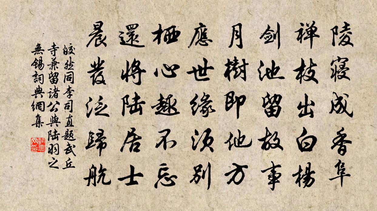 詩詞名句歷史字典書法欣賞書法字典國語詞典說文解字康熙字典古漢語字典標 題 作 者 詩 句 同李司直題武丘寺兼留諸公與陸羽之無錫作者:皎然 朝代:唐代原文陵寢成香阜,禪枝出白楊。劍池留故事,月樹即他方。應世緣須別,棲心趣不忘。還將陸居士,晨發泛歸航。詩詞問答問:《同李司直題武丘寺兼留諸公與陸羽之無錫》的作者是誰?答:皎然問:該詩寫於哪個朝代?答:唐代問:該詩是什麼體裁?答:五律書法欣賞同李司直題武丘寺兼留諸公與陸羽之無錫書法作品注釋全唐詩:卷818-45詩詞推薦送范啟東牟融〔唐代〕楊柳春江上,東風一棹輕。行囊歸客興,尊酒故人情。畫史名當代,聲華重兩京。臨岐分手處,無奈別離生。三日侍華光殿曲水宴代人應詔詩 二謝朓〔南北朝〕中葉遭閔。副內多違。悠悠靈貺。爰有適歸。於昭睿後。撫運天飛。凝居中縣。神動外畿。詠眠窩艾性夫〔宋代〕獨榻孤扉木幾雙,小窩可受北風降。帶霜楓葉寒供火,隨月梅梢瘦入窗。夢熟不知衾似鐵,睡醒何用酒盈缸。近山郴江百詠並序擷芳園阮閱〔宋代〕萬萼千枝二月春,只愁風雨便成塵。不知誰擷香英去,自有尋芳拾翠人。村姑二首宋伯仁〔宋代〕翠鬢雙妥未梳頭,紡緯車邊坐欲羞。幾度採桑歸較晚,阿孃疑看落花愁。乍歸九首劉克莊〔宋代〕孚若如天馬,軒昂不可羈。為貧疏飲客,因病出名姬。謝送蠟梅三首曾幾〔宋代〕天將何物染江梅,白玉花成栗玉開。一種暗香全似舊,小罌和雪送春來。過靜林寺用琳老韻作四絕句毛滂〔宋代〕寒溪只數尺,炯炯涵晴空。寄目誰與論,翠芊牽春風。送同少野赴華藏寺二首陳著〔宋代〕絮帽蒙頭太白峰,忽然霹靂起虛空。遁庵強出本心退,荼毒高遷好樣同。南北雲山十年夢,東西浙水一家風。無邊滿庭芳(九日用淵明二詩作)趙鼎〔宋代〕靡靡流光,淒淒風露,小園草木初凋。杳然塵影,爽氣界天高。愛此佳名重九,隨宜對、秋菊持醪。登臨處,哀蟬題秦州城許棠〔唐代〕聖澤滋遐徼,河堤四向通。大荒收虜帳,遺土復秦風。亂燒迷歸路,遙山似夢中。此時懷感切,極目思無窮。老景陸游〔宋代〕老景雖無幾,為農尚有餘。曾傳種魚術,新得相牛書。黍酒時留客,菱歌或起予。平生湖海志,高枕看嚴徐。王希武通判輓詞范成大〔宋代〕事契從先世,姻聯亦近親。遽為重壤去,淒斷十年鄰。物理真飄忽,家聲正隱轔。門闌可三戟,何止駟車雲。贈旴江張平仲真德秀〔宋代〕去聖既雲遠,至理日以冥。言道指虛玄,語性雜精靈。正傳久蕪沒,異學得魁橫。卓哉周程張,磊隗三代英。妙蘊春旱二首張耒〔宋代〕風雲閒益高,旱色起諸嶺。施生澤未渥,曉氣挾余冷。飛沙磣桃李,碧草思耿耿。麥根不走地,稻壟臥陳梗。蛟龍聚星堂雪蘇軾〔宋代〕窗前暗響鳴枯葉,龍公試手初行雪。映空先集疑有無,作態斜飛正愁絕。眾賓起舞風竹亂,老守先醉霜松折。恨無南鄉子(和黃侍郎疇若見貽生日韻)魏了翁〔宋代〕萬里載浮名。憶昔從容下帝京。冉冉七年如昨夢,分明。贏得存存夜氣清。誰使濫專城。有罪當誅尚薄刑。細數當送雲泉入山真山民〔宋代〕薜蘿叢里郁青青,別是幽棲一段清。水色山光皆畫本,蟬聲禽語亦吟情。人今不改衣冠古,道重方知富貴輕。為語仰和皇太了殿下明禋慶成詩韻馬廷鸞〔宋代〕聖主精禋格,明廷對月深。元良贊宸極,盛德享天心。白石榴許及之〔宋代〕花開水晶瓶,葉排青瑣窗。枝紅立白幟,蝶陣垂翅降。名句推薦人間之水污濁,在野外者清潔,俱為一水,源從天涯,或濁或清,所在之勢使之然也。王充《論衡·卷二·率性篇》 山中相送罷,日暮掩柴扉。王維《送別 / 山中送別 / 送友》 益者三友,損者三友。友直、友諒、友多聞,益矣;友便辟、友善柔、友便佞,損矣。孔子弟子《論語·季氏篇》 巧笑倩兮,美目盼兮,素以為絢兮。孔子弟子《論語·八佾篇》 想烏衣年少,芝蘭秀髮,戈戟雲橫。葉夢得《八聲甘州·壽陽樓八公山作》 置酒望白雲,商飆起寒梧。李白《登單父陶少府半月台》 問元戎早晚,鳴鞭徑去,解天山箭。元好問《水龍吟·從商帥國器獵於南陽同仲澤鼎玉賦此》 殘燈明滅枕頭欹,諳盡孤眠滋味。范仲淹《御街行·秋日懷舊》 小處不滲漏,暗處不欺隱,末路不怠荒,才是真正英雄。洪應明《菜根譚·概論》 士有妒友,則賢交不親;君有妒臣,則賢人不至。荀子《荀子·大略》