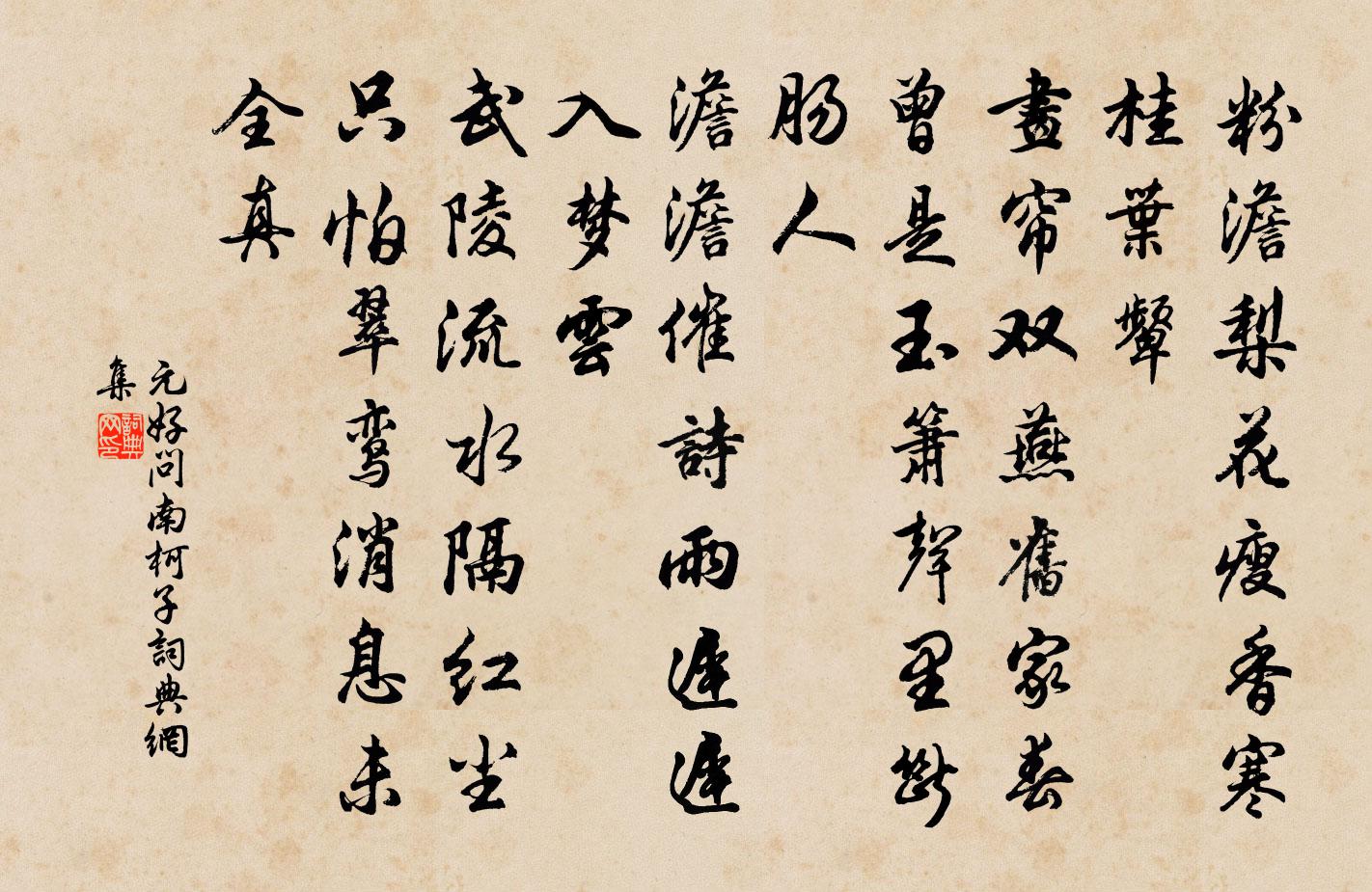 詩詞名句歷史字典書法欣賞書法字典國語詞典說文解字康熙字典古漢語字典標 題 作 者 詩 句 南柯子作者:元好問 朝代:金代南柯子原文粉澹梨花瘦,香寒桂葉顰。畫簾雙燕舊家春。曾是玉簫聲里斷腸人。澹澹催詩雨,遲遲入夢雲。武陵流水隔紅塵。只怕翠鸞訊息未全真。詩詞問答問:南柯子的作者是誰?答:元好問問:南柯子寫於哪個朝代?答:金代問:南柯子是什麼體裁?答:詞問:元好問的名句有哪些?答:元好問名句大全元好問南柯子書法欣賞南柯子書法作品詩詞推薦偈頌五十一首釋大觀〔宋代〕痴痴兀兀,乖乖崖崖。水乳和同,肝膽楚越。共倚闌乾舒笑眼,四山松桂動秋風。頌德上賈常侍賈島〔唐代〕邊臣說使朝天子,發語轟然激夏雷。高節羽書期獨傳,分符絳郡滯長材。啁啾鳥恐鷹鸇起,流散人歸父母來。自顧登城樓陳師道〔宋代〕城郭春容晚,因行可當游。飛來雙蛺蝶,目盡一浮鷗。峽嶮山將合,江平水郤流。同來端興盡,且為小遲留。張子房黎廷瑞〔宋代〕早見滄海君,晚師黃石公。力士不得力,驅使芒碭龍。仁義以為椎,氣蓋百代雄。一擊函谷碎,再擊烏江空。從容郊廟歌辭。享太廟樂章。承光舞佚名〔唐代〕金相載穆,玉裕重輝。養德清禁,承光紫微。乾宮候色,震象增威。監國方永,賓天不歸。孝友自衷,溫文性與。華之高壽魯齋先生七十金履祥〔宋代〕翼翼王子,教行於東。思樂東州,舞雩之風。內直晨出便赴奉慈齋宮馬上口占歐陽修〔宋代〕凌晨更直九門開,驅馬悠悠望禁街。霜後樓台明曉日,天寒煙霧著宮櫰。山林未去猶貪寵,◇酒何時共放懷。已覺入梅陸游〔宋代〕今年面入梅日,面雲腳垂到面地。芬香小麥面,展轉北面睡。甲夜聞雨聲,起拜造物賜。三登於此卜,一飽可坐致春欲暮雪作不已簡子新家鉉翁〔宋代〕和平心事春三月,淡泊生涯水一杯。老矣只余歸夢在,世間萬事付心灰。和李致政花石山詩魏了翁〔宋代〕春風挽征衣,淑景薦蓮實。山中之奇觀,變態紛襞積。或劃然以舒,或蒙然以密。或嫵如修眉,或突如巨跡。或鷙閏月二日雨三日復雨寄斯遠三首趙蕃〔宋代〕大雨固滂霈,小雨更霢霂。蕭然涼已生,隱若雷未伏。前時歷月陰,邇日連朝暴。早田有愁乾,菜本亦恐縮。居閒二十二日山行項安世〔宋代〕秋日更山行,朝朝入畫屏。雨看如水墨,晴喚似丹青。示祖元禪人釋宗杲〔宋代〕萬仞岩頭解放知,起來依舊卻惺惺。飢餐渴飲渾無事,那論昔人非昔人。點絳唇 先生鎖門及十旬。將啟戶,又以梨一王哲〔元代〕食之。既啟戶了,唯鈺舍家緣做弟子,至此耳,又以詞贈之。十化分梨,我於前歲生機構。二人翁母。待教作*雲題稙庵陳掞〔宋代〕季鷹雅志本江湖,胡為入洛誠計疏。一杯蓴羹入歸夢,歲晚僅飽松江鱸。何如王郎十畝宅,一生江頭枕江碧。西風贈王寂蘇軾〔宋代〕與君暫別不須嗟,俯仰歸來鬢未華。記取江南煙雨里,青山斷處是君家。刺安南事詩懿宗朝舉〔唐代〕南荒不擇吏,致我交趾覆。聯綿三四年,致我交趾辱。懦者斗則退,武者兵益黷。軍容滿天下,戰將多金玉。颳得步過仙霞嶺李洪〔宋代〕迢遞南詢過百城,五漿先饋不須驚。侵尋老境凋雙鬢,耿介孤忠有寸誠。入眼越山多秀色,背人閩水大無情。扶筇贈所知許渾〔唐代〕因釣鱸魚住浙河,掛帆千里亦相過。茅檐夜醉平階月,蘭棹春歸拍岸波。湖日似陰鼉鼓響,海雲才起蜃樓多。明時陸機宅楊備〔宋代〕陸家兄弟頗能文,入洛仍將筆硯焚。舊宅荊榛狐兔窟,機雲無復有昆雲。名句推薦行雲卻在行舟下,空水澄鮮,俯仰留連,疑是湖中別有天。歐陽修《採桑子·畫船載酒西湖好》 羈旅長堪醉,相留畏曉鍾。戴叔倫《客夜與故人偶集 / 江鄉故人偶集客舍》 欲祭疑君在,天涯哭此時。張籍《沒蕃故人》 一一書來報故人,我欲因之壯心魄。李白《赤壁歌送別》 信言不美,美言不信。善者不辯,辯者不善。知者不博,博者不知。老子《老子·德經·第八十一章》 年年負卻花期!過春時,只合安排愁緒送春歸。張惠言《相見歡·年年負卻花期》 夜戰桑乾北,秦兵半不歸。許渾《塞下曲》 念佳人、音塵別後,對此應解相思。晁端禮《綠頭鴨·詠月》 孤芳一世,供斷有情愁,消瘦損,東陽也,試問花知否曹組《驀山溪·梅》 石門流水遍桃花,我亦曾到秦人家。李白《下途歸石門舊居》