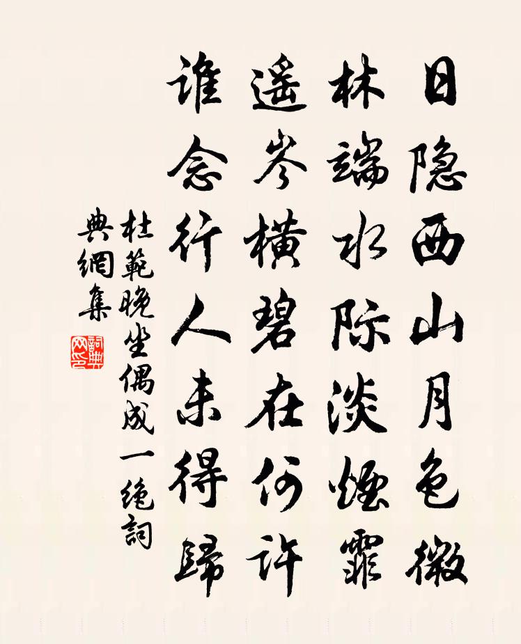 詩詞名句歷史字典書法欣賞書法字典國語詞典說文解字康熙字典古漢語字典標 題 作 者 詩 句 晚坐偶成一絕作者:杜范 朝代:宋代晚坐偶成一絕原文日隱西山月色微,林端水際淡煙霏。遙岑橫碧在何許,誰念行人未得歸。詩詞問答問:晚坐偶成一絕的作者是誰?答:杜范問:晚坐偶成一絕寫於哪個朝代?答:宋代杜范晚坐偶成一絕書法欣賞晚坐偶成一絕書法作品詩詞推薦再題鍾賢良詠歸堂劉克莊〔宋代〕伏戲以來凡幾年,六經之外凡幾書。人間簡冊渺煙海,君以約法包無餘。往年華轂臨敝廬,舌端霆卷俄電舒。平欺山居獨酌黃庶〔宋代〕山寒未放春訊息,獨把單醪慰寂寥。書對聖賢為客主,竹兼風雨似鹹詔。醉鄉城郭燈前到,愁賊戈予盞底銷。野菜三十六陂曾極〔宋代〕渺然三十六陂春,石黛潮生歲歲新。楊柳杏花渾好在,吟邊只欠跨驢人。詠楊司業觀菊圖趙良坡〔宋代〕寄傲南窗罷草玄,寥寥三徑菊花前。春風自足繁桃李,為愛秋香到晚妍。水天月歌汪莘〔宋代〕朝立寒溪東,暮立寒溪西。一到神頓領,熟視眼更迷。水光不見水,但見青天無表裹。天光不見天,但見一片清煙悶成華岳〔宋代〕勿憂李廣不封侯,廣不封侯未足憂。漢鼎不烹曹操肉,吳鉤空斷伍員頭。鴻門自昔推屠狗,虎帳於今愧沐猴。千萬寄題上饒周儀仲西疇姚勉〔宋代〕聞君負北郭,築室扁西疇。綠水人家曉,黃雲穡事秋。吾生如有此,外物更何求。堪卜東鄰否,耕余著釣舟。郊廟歌辭。梁太廟樂舞辭。皇帝行佚名〔唐代〕莫高者天,攀躋弗克。隮天有方,累仁積德。祖宗隆之,子孫履之。配天明祀,永永孝思。四月六日同江朝宗花下飲吳芾〔宋代〕十分擬共醉花枝,底事君來苦後期。芍藥階前猶爛熳,酴醾回上已離披。春歸又是辜杯酒,老去還應惜歲時。今日首尾吟邵雍〔宋代〕堯夫非是愛吟詩,詩是天津竚立時。有意水聲千古在,無情山色四邊圍。孤鴻遠入晴煙去,雙鷺斜穿禁柳飛。景物掃徑郭印〔宋代〕陰森百畝林,所向無不好。俗客豈曾來,幽處通蓬島。一色盡琅玕,堅潤真可寶。天風時脫葉,滿徑堆殘槁。適然題山寺壁董遘〔宋代〕寺中荊棘老侵雲,惡木猙獰野外村。原上狐狸走白日,水邊魑魁立黃昏。二月二十三日南雄解舟二首楊萬里〔宋代〕昨夜新雷九地鳴,今朝春漲一篙清。順流更借江風便,此去韶州只兩程。山墅閒題韋莊〔唐代〕邐迤前岡厭後岡,一川桑柘好殘陽。主人饋餉炊紅黍,鄰父攜竿釣紫魴。靜極卻嫌流水鬧,閒多翻笑野雲忙。有名避地傷春六絕句葛立方〔宋代〕一年春事又闌珊,可惜芳菲愁裹看。慎勿掃花供餵馬,惱人秀色自堪餐。依修多羅立往生正信偈釋遵式〔宋代〕稽首蓋西方安樂蓋剎,彌陀蓋世主大慈尊。我依種種修多羅,成就往生決定信。住大乘者清淨心,十念念彼無量壽湧泉閣釋紹曇〔宋代〕肆無礙辯若懸河,尺水能興萬丈波。平地無端立層級,登高人少逐流多。田家三詠葉紹翁〔宋代〕田因水壞秧重插,家為蠶忙戶緊關。黃犢歸來莎草闊,綠桑采盡竹梯閒。九月十一日疾小間夜賦陸游〔宋代〕病後衣巾盡覺寬,挈提裘領喟然嘆。孤燈不焰熒熒碧,小雨無聲慘慘寒。只道清心災自退,豈知非意病相干。平生九月二十七日曉起書夢舒岳祥〔宋代〕老去無營百念寬,只余故紙未忘鑽。小窗坐寐含幽夢,夢涉寒波賦楚蘭。名句推薦富貴多憂,貧窮自在。佚名《增廣賢文·上集》 升沉應已定,不必問君平。李白《送友人入蜀》 幾多情,無處說,落花飛絮清明節。魏承班《漁歌子·柳如眉》 歲暮百草零,疾風高岡裂。杜甫《自京赴奉先縣詠懷五百字 / 自京赴奉先詠懷五百字》 三杯兩盞淡酒,怎敵他、晚來風急?李清照《聲聲慢·尋尋覓覓》 眾口鑠金,積毀銷骨。司馬遷《史記·張儀列傳》 黃沙百戰穿金甲,不破樓蘭終不還。王昌齡《從軍行七首·其四》 君子食無求飽,居無求安,敏於事而慎於言,就有道而正焉。可謂好學也已。孔子弟子《論語·學而篇》 兒童強不睡,相守夜歡嘩。蘇軾《守歲》 轉眼葵肌初繡,又紅欹欄角。陳維崧《好事近·分手柳花天》