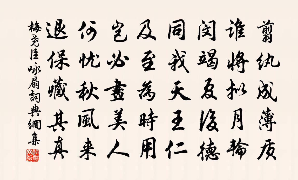 詩詞名句歷史字典書法欣賞書法字典國語詞典說文解字康熙字典古漢語字典標 題 作 者 詩 句 詠扇作者:梅堯臣 朝代:宋代詠扇原文翦紈成薄質,誰將擬月輪。閔竭夏後德,同我天王仁。及至為時用,豈必畫美人。何憂秋風來,退保藏其真。詩詞問答問:詠扇的作者是誰?答:梅堯臣問:詠扇寫於哪個朝代?答:宋代問:梅堯臣的名句有哪些?答:梅堯臣名句大全梅堯臣詠扇書法欣賞詠扇書法作品詩詞推薦絕句楊冠卿〔宋代〕東閣官梅已退妝,遠村沙柳發新黃。遙知歸去西江路,定有飛花觸地香。鴛鴦祖無擇〔宋代〕水宿雲飛無定期,雄雌兩兩鎮相隨。到頭不會天何意,卻使人生有別離。處士妻十首劉克莊〔宋代〕當日獻皇后,逃生屋壁間。何如伴龐老,同入鹿門山。草書屏風韓偓〔唐代〕何處一屏風,分明懷素蹤。雖多塵色染,猶見墨痕濃。怪石奔秋澗,寒藤掛古松。若教臨水畔,字字恐成龍。鳳棲梧尹志平〔元代〕岩上春光將欲暮。可惜春光,無計留連住。春去秋來分四序。一來一去成寒暑。歲計謾人人不悟。得喪悲歡,儘是又成父弟往餘干謁趙叔遂至池陽廬陵謁二周先趙蕃〔宋代〕歸我山中未一年,兩回題子送行篇。況今客踐飛紅葉,不比春風啼杜鵑。東閣翹材嗟久闊,長沙夜席已喧傳。子行丁亥生日紀事五首方回〔宋代〕先君俊譽早飈馳,晚落蠻陬禍事奇。六十年前生子日,三千里外憶親時。霍光擅漢人皆恐,侯景歸梁國欲危。埋骨首尾吟邵雍〔宋代〕堯夫非是愛吟詩,詩是堯夫詫劍時。當煅煉時分勁節,到磨礱處發光輝。長蛇封豕休撩亂,狡兔妖狐莫陸離。此器次韻劉卿任飲散感秋之作二首葛立方〔宋代〕雲子登場賽鼓歡,村南村北盡黃冠。幾聲乾葉下碧甃,數尺瘦山浮畫欄。水落野橋魚網掛,月懸煙浦鵲枝寒。新秋訪慶老不值李邴〔宋代〕惠遠過溪應送陸,玉川入寺不逢曦。夕陽半嶺鴉棲樹,拄杖尋山步步遲。贈東鄰王十三白居易〔唐代〕攜手池邊月,開襟竹下風。驅愁知酒力,破睡見茶功。居處東西接,年顏老少同。能來為伴否?伊上作漁翁。和文與可洋川園池三十首 荻蒲蘇軾〔宋代〕雨折霜乾不耐秋,白花黃葉使人愁。月明小艇湖邊宿,便是江南鸚鵡洲。餞吳長文司理用修持賢業教無欠為韻裘萬頃〔宋代〕過從資直諒,夫豈勢利交。謂朋黨者誰,仁人姑聽教。狂題二首司空圖〔唐代〕草堂舊隱猶招我,煙閣英才不見君。惆悵故山歸未得,酒狂叫斷暮天雲。須知世亂身難保,莫喜天晴菊並開。長短閒說王建〔唐代〕桃花百葉不成春,鶴壽千年也未神。秦隴州緣鸚鵡貴,王侯家為牡丹貧。歌頭舞遍回回別,鬢樣眉心日日新。鼓動清平樂(問訊梅花)趙長卿〔宋代〕楚梅嬌小。好是霜天曉。宿酒惱人香暗繞。浸影碧波池沼。生成素淡芳容。不須抹黛勻紅。準擬凝成陰結子,莫教醜奴兒令(促養直赴雪夜溪堂之約)康與之〔宋代〕馮夷剪碎澄溪練,飛下同雲。著地無痕。柳絮梅花處處春。山陰此夜明如晝,月滿前村。莫掩溪門。恐有扁舟乘興句諶祜〔宋代〕宮大阿房行日月,關通函谷混車書。留題唐棲寺周弼〔宋代〕僧房十日相留戀,為怯生寒未到家。插岸斷冰妨盪槳,入檐飛雪助煎茶。香台穴碎逃秋蟻,古殿巢翻失暮鴉。惟有酬諸公宿鏡水宅嚴維〔唐代〕倖免低頭向府中,貴將藜藿與君同。陽雁叫霜來枕上,寒山映月在湖中。詩書何德名夫子,草木推年長數公。聞道名句推薦洞庭青草,近中秋,更無一點風色。張孝祥《念奴嬌·過洞庭》 漢月垂鄉淚,胡沙費馬蹄。岑參《磧西頭送李判官入京》 富貴不離其身,然後能保其社稷,而和其民人。孔子及其弟子《孝經·諸侯》 九曲黃河萬里沙,浪淘風簸自天涯。劉禹錫《浪淘沙·九曲黃河萬里沙》 聞道皇華使,方隨皂蓋臣。王維《送李判官赴東江》 愛之如父母, 仰之如日月,敬之如鬼神,畏之如雷霆姚察、姚思廉《梁書·列傳·卷三十八》 白雪卻嫌春色晚,故穿庭樹作飛花。韓愈《春雪》 濛柳添絲密,含吹織空羅。李世民《詠雨》 窮且益堅,不墜青雲之志。王勃《滕王閣序》 綠萼添妝融寶炬,縞仙扶醉跨殘虹曹雪芹《詠紅梅花得“紅”字》