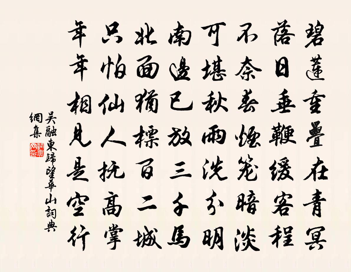 詩詞名句歷史字典書法欣賞書法字典國語詞典說文解字康熙字典古漢語字典標 題 作 者 詩 句 東歸望華山作者:吳融 朝代:唐代東歸望華山原文碧蓮重疊在青冥,落日垂鞭緩客程。不奈春煙籠暗淡,可堪秋雨洗分明。南邊已放三千馬,北面猶標百二城。只怕仙人撫高掌,年年相見是空行。詩詞問答問:東歸望華山的作者是誰?答:吳融問:東歸望華山寫於哪個朝代?答:唐代問:東歸望華山是什麼體裁?答:七律吳融東歸望華山書法欣賞東歸望華山書法作品注釋全唐詩:卷687-34詩詞推薦次韻酬吳彥珍見寄二首王安石〔宋代〕篁竹荒茅五畝余,生涯山蕨與泉魚。家貧殖貨羞端木,鄉里傳書比仲舒。白日憶君聊遠望,青林嗟我似逃虛。春風日出引曹勛〔宋代〕雲冥冥,風淒淒。綺疏未白雞已啼,角聲才斷辟朱扉。辟朱扉,款朝日。君王劍佩朝諸侯,赫赫明明光萬國。臨江仙 真人訓馬先生,法名通一,字全道,王哲〔元代〕栗子味招全道子,芋頭滋味引回頭。名人吃並無憂。四三通十二,個個下重樓。*得過時冰是水,水中雨點浮漚。望蓬萊譚處端〔元代〕行大道,認取坎和離。一點來時顛倒處,兩般訊息與搜披。玄妙不難知。休外覓,識取自菩提。有相身中成鍛鍊,送荔浦蔣明府赴任杜牧〔唐代〕路長春欲盡,歌怨酒多酣。白社蓮塘北,青袍桂水南。驛行盤鳥道,船宿避龍潭。真得詩人趣,煙霞處處諳。代壽某帥二首陳宗遠〔宋代〕勳業從來簡帝聰,東溟還復奏膚公。庭前修竹添新綠,洞裡蟠桃依舊紅。野渡橫舟人未老,大川作楫路將通。願觀曹娥江石林〔宋代〕一點冥通未兆前,乾坤虛鑒已昭然。爛銀宮裡擎屍出,萬古傳聲浪拍天。十月二十八夜至此悵然繼和蘇泂〔宋代〕病馬猶依櫪,飢鴻更著行。深宵風雨後,萬里道途長。骨立難看鏡,愁來怕舉觴。少年輕聚散,曾笑客思鄉。齊天樂(餘閒書院擬賦蟬)王易簡〔宋代〕翠雲深鎖齊姬恨,纖柯暗翻冰羽。錦瑟重調,綃衣乍著,聊飲人間風露。相逢甚處。記槐影初涼,柳陰新雨。聽盡齋中有獸皮茵偶成詠羊士諤〔唐代〕逸才豈凡獸,服猛愚人得。山澤生異姿,蒙戎蔚佳色。青氈持與藉,重錦裁為飾。臥閣幸相宜,溫然承宴息。王倅成老輓詩二首王炎〔宋代〕珠玉山淵潤,仁人久里居。低徊嘗結綬,強健即垂車。長厚皆堪法,循良亦可書。惜哉懷遠業,小試只題輿。冬夜讀几案間雜書得六言二十首劉克莊〔宋代〕橫議遊俠四出,清流標榜自賢。血染瓜田方止,屍投濁河可憐。憶龐之道司馬光〔宋代〕疇昔兩垂髫,知音結久要。何言半塗別,不待歲寒彫。幸有才名在,非隨氣運消。英靈猶仿佛,宿草已蕭蕭。夜泊英州楊萬里〔宋代〕旅病情先惡,愁眠夢更驚。犬須終夕吠,月到五更明。未解波頭意,偏來枕底聲。平生厭行路,投老正追程。先幾吟邵雍〔宋代〕先幾能識是吾儕,慎勿輕為世俗咍。把似眾中呈醜拙,爭如靜里且談諧。奇花萬狀皆輸眼,明月一輪長入懷。似此慶元戊午重九天氣晴和侍七兄提舉監丞早集清周必大〔宋代〕午風和氣借春來,雨足黃花越節開。要識重陽真富貴,弟兄一日曆三台。複次韻四首陳造〔宋代〕昔上瞿塘灩預堆,盤渦如井放船開。山行歡喜今非錯,備見梢濆撆漩來。金陵羅公升〔宋代〕江左諸人未易輕,馳驅猶欲致中興。後人只說清談誤,並與清談已不能。頌古四十五首釋如珙〔宋代〕你若學他看,牛皮真箇穿。長年橫案上,字義自然圓。路中上田尚書王建〔唐代〕去路何詞見六親,手中刀尺不如人。可憐池閣秋風夜,愁綠嬌紅一遍新。名句推薦往者不可諫,來者猶可追。孔子弟子《論語·微子篇》 萬里不惜死,一朝得成功。高適《塞下曲》 勿言草卉賤,幸宅天池中沈約《詠新荷應詔》 慊慊思歸戀故鄉,君為淹留寄他方。曹丕《燕歌行》 在家不會迎賓客,出門方知少主人。佚名《增廣賢文·上集》 偷彈清淚寄煙波,見江頭故人,為言憔悴如許。袁去華《劍器近·夜來雨》 對酒捲簾邀明月,風露透窗紗。蘇軾《少年游·潤州作》 一苗露水一苗草,一朝天子一朝臣。佚名《增廣賢文·下集》 來歲長安春事早,勸杏花、斷莫相思死。龔自珍《金縷曲·癸酉秋出都述懷有賦》 鴛鴦密語同傾蓋,且莫與、浣紗人說。張炎《疏影·詠荷葉》