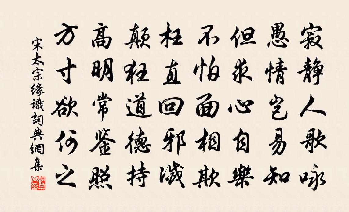 詩詞名句歷史字典書法欣賞書法字典國語詞典說文解字康熙字典古漢語字典標 題 作 者 詩 句 緣識作者:宋太宗 朝代:宋代緣識原文寂靜人歌詠,愚情豈易知。但求心自樂,不怕面相欺。枉直回邪滅,顛狂道德持。高明常鑒照,方寸欲何之。詩詞問答問:緣識的作者是誰?答:宋太宗問:緣識寫於哪個朝代?答:宋代宋太宗緣識書法欣賞緣識書法作品詩詞推薦題王詵都尉畫山水橫卷三首蘇轍〔宋代〕我昔得罪遷南夷,性命頃刻存篙師。風吹波盪到官舍,號呼誰復相聞知。小園畜蟻防桶蠹,空庭養蜂收蜜脾。讀書將至妙喜寺徐凝〔唐代〕清風裊裊越水陂,遠樹蒼蒼妙喜寺。自有車輪與馬蹄,未曾到此波心地。義役汪師旦〔宋代〕管窺當世務,如見肺與肝。惟有差役法,立判最為難。姑以一鄉論,利病胡可殫。地里有寬狹,戶籍有耗繁。富者挽蜀帥張公珏劉壎〔宋代〕玉壘雲浮五十秋,關西虓將勇無儔。三吳甑墮猶堅守,八柱唇亡不耐愁。滬水捷收勞驃褭,夔門機伏失兜鍪。吾君下章安杜瀆七首姚寬〔宋代〕平生顧挹山 * ,種竹栽花越水東。海角天涯心未穩,吳頭楚尾信難通。次韻張著作文潛休日不出二首晁補之〔宋代〕文史平昔契,淮山別離心。省中並日直,天上青春深。買屋近城塢,往來成竹林。詩模黃著作,吾亦意駸駸。六言二首劉子翬〔宋代〕黃卷篋中昆友,白醪杯裹聖賢。我願長閒足矣,人憐獨處蕭然。頌古三十一首釋玿〔宋代〕無直路,卻縈紆。趙州東壁上,依書掛葫蘆。有張公吃村酒,李公醉不醒。面南看北斗。答仲屯田次韻蘇軾〔宋代〕秋來不見渼陂岑,千里詩盟忽重尋。大木百圍生遠籟,朱弦三嘆有遺音。清風捲地收殘暑,素月流天掃積陰。欲遺香閨十詠扶玉倚張玉孃〔宋代〕繡罷南窗睡思催,花生銀海玉山頹。東風斜倚妖無力,夢入湘江隔楚台。偈頌三十六首釋如珙〔宋代〕糞堆頭上,無人覷著。萬法紛紜,自起自滅。答王詹叔見寄韓維〔宋代〕詹叔好古者,卓立自既冠。有如騏驥兒,一縱不可絆。近聞治周易,顛倒爻象彖。此書號精微,義與天地貫。吾知浣溪沙元好問〔金代〕修竹移陰未出牆。好風斜綽露荷香。壺中六月也清涼。不放靈椿仙客□,要有丹桂滿林芳。天教光景為人長。放浪釋文珦〔宋代〕放浪一虛舟,江湖七十秋。見聞遺耳目,生死付浮休。寧有機心在,唯同造物游。脫然不境外,無喜亦無憂。聊行王安石〔宋代〕聊行弄芳草,獨坐隱團蒲。問客茅檐日,君家有此無。元奉宗宰績溪楊億〔宋代〕游梁度幾春,時譽藹天倫。家寄汀苹久,名題桂籍新。溪鱗清可數,澤雉到應馴。黟歙非難治,民風自古淳。城西別元九白居易〔唐代〕城西三月三十日,別友辭春兩恨多。帝里卻歸猶寂寞,通州獨去又如何。亦好園四詠亦好亭喻良能〔宋代〕亦好新亭小,登臨意緒長。清流依檻曲,明月逐檐方。送滕教婦二首陳淳〔宋代〕本是山林一陋蒙,何心馳騖利名中。只因尺檄來蓬戶,故策駑才入藻宮。既爾薰陶知厚德,又於歷練熟頹風。區區送金竟陵入蜀崔信明〔唐代〕金門去蜀道,玉壘望長安。豈言千里遠,方尋九折難。西上君飛蓋,東歸我掛冠。猿聲出峽斷,月彩落江寒。從今名句推薦舊曲梅花唱,新正柏酒傳。孟浩然《歲除夜會樂城張少府宅》 人人親其親、長其長而天下平。孟子《孟子·離婁章句上·第十一節》 昨夜吳中雪,子猷佳興發。李白《答王十二寒夜獨酌有懷》 可憐今夜月,不肯下西廂。王庭筠《絕句·竹影和詩瘦》 一晌凝情無語,手捻梅花何處。王之道《如夢令·一晌凝情無語》 事先敗而後成,曰失之東隅,收之桑榆;事將成而終止,曰為山九仞,功虧一簣。程登吉《幼學瓊林·卷一·地輿》 歌聲未盡處,先淚零周邦彥《綺寮怨·上馬人扶殘醉》 知君獨坐青軒下,此時結念同所懷。李白《早秋單父南樓酬竇公衡》 不為燥濕輕重,不為窮達易節。范曄《後漢書·列傳·周黃徐姜申屠列傳》 乍暖還輕冷。張先《青門引·春思》
