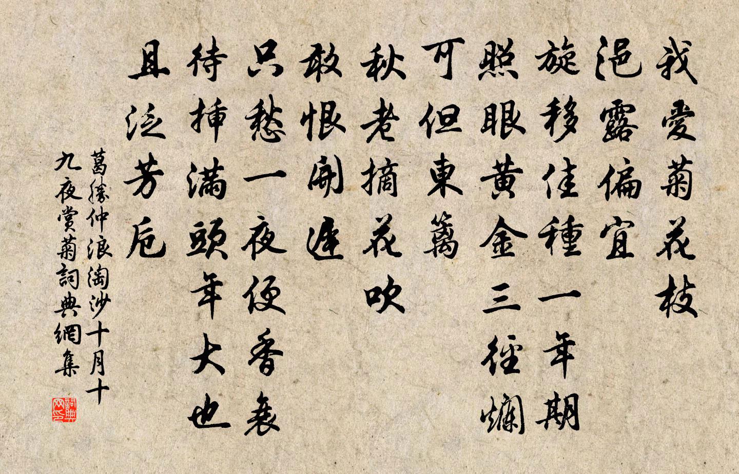 詩詞名句歷史字典書法欣賞書法字典國語詞典說文解字康熙字典古漢語字典標 題 作 者 詩 句 浪淘沙(十月十九夜賞菊)作者:葛勝仲 朝代:宋代浪淘沙(十月十九夜賞菊)原文我愛菊花枝。浥露偏宜。旋移佳種一年期。照眼黃金三徑爛,可但東籬。秋老摘花吹。敢恨開遲。只愁一夜便香衰。待插滿頭年大也,且泛芳卮。詩詞問答問:浪淘沙(十月十九夜賞菊)的作者是誰?答:葛勝仲問:浪淘沙(十月十九夜賞菊)寫於哪個朝代?答:宋代問:浪淘沙(十月十九夜賞菊)是什麼體裁?答:詞葛勝仲浪淘沙(十月十九夜賞菊)書法欣賞浪淘沙(十月十九夜賞菊)書法作品詩詞推薦洞仙歌朱彝尊〔清代〕明湖碧浪,枉枉帆尋遍。咫尺仙源路非遠,訝杜蘭香去,已隔多時,又誰料佳約三年還踐。纖腰無一把,飛入懷中春思三絕洪咨夔〔宋代〕細草荒煙古墓田,知經寒食幾年天。雪條花下翩翩紙,疑是曾分白打錢。神弦別曲李賀〔唐代〕巫山小女隔雲別,春風松花山上發。綠蓋獨穿香徑歸,白馬花竿前孑孑。蜀江風澹水如羅,墮蘭誰泛相經過。南山酬勾評事劉兼〔唐代〕閒庭奇支枕正悲秋,忽覺新編浣遠愁。才薄只愁安雁戶,年高空憶復漁舟。鷺翹皓雪臨汀岸,蓮裊紅香匝郡樓。對浣溪沙姜夔〔宋代〕翦翦寒花小更垂。阿瓊愁里弄妝遲。東風燒燭夜深歸。落蕊半黏釵上燕,露黃斜映鬢邊犀。老夫無味已多時。適趣趙崇嶓〔宋代〕賦資在山林,適趣非任放。乾坤入我牖,得此一昭曠。雨露日以深,禾黍日以長。妻兒喜相謂,一飽知可望。飯蔬懶翁釋紹曇〔宋代〕口生白醭怕開言,幾度抬身又困眠。佛法從教陳爛卻,權衡不在老夫邊。千秋歲晁端禮〔宋代〕飛雲驟雨。草草成暌阻。寸腸結盡千千縷。別離誰是沒,惟我於中苦。最苦是,看奴未足拋奴去。一句臨歧語。忍聲聲慢(賦紅梅)李曾伯〔宋代〕紅綃剪就,絳蠟熔成,天然一種仙姿。竹外家風,淒涼儉薄為宜。東君苦憐消瘦,強教伊、傅粉勻脂。較量盡,勝秋夕露坐作陸游〔宋代〕銀河半落露華清,南斗闌乾北斗明。冉冉方悲老將至,纖纖又嘆月初生。酒床細滴香浮瓮,衣杵相聞聲滿城。萬卷五更仇遠〔宋代〕爐藏火尚紅,雪映窗已白。夢遊無 * ,不知身是客。夏日偶題周文璞〔宋代〕溪友相呼上釣舟,藕花菱葉思悠悠。好詩已在前山寺,寫放參寥石井頭。堤上行二首劉禹錫〔唐代〕酒旗相望大堤頭,堤下連檣堤上樓。日暮行人爭渡急,槳聲幽軋滿中流。江南江北望煙波,入夜行人相應歌。《桃初夏范成大〔宋代〕清晨出郭更登台,不見余春只麽回。桑葉露枝蠶向老,菜花成莢蝶猶來。沁園春(寄都城趙閱道·般涉調)張先〔宋代〕心膂良臣,帷幄元勛,左右萬幾。暫武林分閫,東南外翰,錦衣鄉社,未滿瓜時。易鎮梧台,宣條期歲,又西指夷讀文山集林景熙〔宋代〕黑風夜撼天柱折,萬里飛塵九溟竭。誰欲扶之兩腕絕,英淚浪浪滿襟血。龍庭戈鋋爛如雪,孤臣生死早已決。綱常奉送卿二翁統節度鎮軍還江陵杜甫〔唐代〕火旗還錦纜,白馬出江城。嘹唳吟笳發,蕭條別浦清。寒空巫峽曙,落日渭陽明。留滯嗟衰疾,何時見息兵。孟子心官則思陳普〔宋代〕心嚴內主役群形,百體欽承順令行。若失所思隨欲動,反為形役自紛爭。水調歌頭辛棄疾〔宋代〕方人也實施字相公倦台鼎,要伴赤松游。高牙千里東下,笳鼓萬貔貅。試問東山風月,更著中年絲竹,留得謝公不公擇客於玉山簿尉之館忽有挽為宜黃之行者公趙蕃〔宋代〕我裾未洗閩山土,君駕柴車過茅宇。相從僅作一夕留,冒雨衝風何自苦。如君人才豈終滯,瑚璉要為清廟器。宜黃名句推薦如今但暮雨,蜂愁蝶恨,小窗閒對芭蕉展。呂渭老《薄倖·青樓春晚》 昔時賢文,誨汝諄諄。佚名《增廣賢文·上集》 采菱人語隔秋煙,波靜如橫練。王惲《平湖樂·采菱人語隔秋煙》 喚起一天明月,照我滿懷冰雪,浩蕩百川流。辛棄疾《水調歌頭·和馬叔度游月波樓》 今夜月明江上、酒初醒。黃庭堅《南歌子·槐綠低窗暗》 知人者智,自知者明。勝人者有力,自勝者強。知足者富。強行者有志。老子《老子·道經·第三十三章》 浮雲暮南征,可望不可攀。杜甫《前出塞九首》 姑蘇台上烏棲時,吳王宮裡醉西施。李白《烏棲曲》 本理則國固,本亂則國危。管仲《管子·霸言》 相望試登高,心隨雁飛滅。孟浩然《秋登蘭山寄張五》