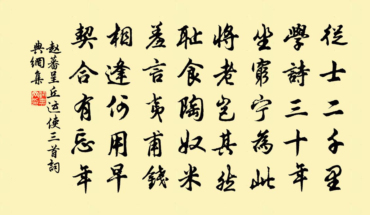 詩詞名句歷史字典書法欣賞書法字典國語詞典說文解字康熙字典古漢語字典標 題 作 者 詩 句 呈丘運使三首作者:趙蕃 朝代:宋代呈丘運使三首原文從士二千里,學詩三十年。坐窮寧為此,將老豈其然。恥食陶奴米,羞言夷甫錢。相逢何用早,契合有忘年。詩詞問答問:呈丘運使三首的作者是誰?答:趙蕃問:呈丘運使三首寫於哪個朝代?答:宋代趙蕃呈丘運使三首書法欣賞呈丘運使三首書法作品詩詞推薦題壁南陽驛婦〔宋代〕流落南來自可嗟,避人不敢御鉛華。卻憐當日鶯鶯事,獨立春風露鬢斜。朝二首梅堯臣〔宋代〕鵝鴨出欄去,兒童臨水驅。欲開花泫露,聚噪鳥窺廚。秣馬刈抯草,買薪嫌五銖。錢刀豈今古,村叟一何愚。夜讀翁逢龍〔宋代〕官事歸來夜雪埋,兒曹燈火小茅齋。人家不必問貧富,但有讀書聲便佳。初入大峨范成大〔宋代〕煙霞沉痼不須醫,此去真同汗漫期。曾款上清臨大面,仍從太白問峨眉。山中緣法如今熟,世上功名自古痴。剩作春蔭方岳〔宋代〕玲瓏碧樹巧臨池,影在窗前作麽移。水墨畫圖春淡淡,鶯花庭院日遲遲。不妨明月重相憶,怎許浮雲浪得知。一片舊懸道中二首趙蕃〔宋代〕昨日風既止,今晨風未收。浮波羨幽鳥,喚雨怕鳴鳩。遺寺荒村里,貞祠古渡頭。登高謝能賦,物色漫分留。和史志道侍郎游朝陽岩曾協〔宋代〕興來小渡喚方舟,霽色天教足勝游。但覺賞心追昔事,不知飛詔下皇州。班行便覺九天近,登覽何辭一日留。懸想又和六首劉克莊〔宋代〕四山猶被亂雲封,臥聽檐聲洗病悰。焦谷萌芽非爾力,晚花膏沐為誰容。水田渺渺飛雙鷺,暘谷徐徐起六龍。莫道寄題趙十四知縣聽雨堂薛師石〔宋代〕誰彈石上琴,涓涓流水響。主人性清曠,靜夜發幽想。何心指蓬閬,取近對湫盪。應有可人來,煙蓑曳雙槳。再酬湯無邪廖行之〔宋代〕少陵自嘆休問天,高歌杜曲希陶潛。兩翁潔身如清漣,流行坎止停則淵。不肯相邀事趣走,相望異世俱稱賢。又如採桑子沈端節〔宋代〕昔年曾記尋芳處,短帽沖寒。竹外江乾。玉麵皮兒月下觀。而今老大風流減,百事心闌。谷底林間。坐對橫枝祗鼻次韻子由所居六詠蘇軾〔宋代〕先生飯土塯,無物與劉叉。何以娛醉客,時嗅砌下花。井水分西鄰,竹陰借東家。蕭然行腳僧,一身寄天涯。再和張栻〔宋代〕閉門謝客少過從,獨倚修篁傲碧空。忽喜千條發瓊蕊,紛如萬鶴出樊籠。與君前日徘徊久,得句懸知慘澹中。胸次出都來陳,所乘船上有題小詩八首,不知何人蘇軾〔宋代〕舟人苦炎熱,宿此喬木灣。清月未及上,黑雲如頹山。登闔閭古城武元衡〔唐代〕登高望遠自傷情,柳發花開映古城。全盛已隨流水去,黃鸝空囀舊春聲。和段相公登武擔寺西台楊汝士〔唐代〕清淨此道宮,層台復倚空。偶時三伏外,列席九霄中。平視雲端路,高臨樹杪風。自憐榮末座,前日別池籠。題周恭帝陵李淑〔宋代〕弄楯牽車挽鼓催,不知門外倒戈回。荒墳斷隴才三尺,猶認房陵半仗來。自貽杜牧〔唐代〕杜陵蕭次君,遷少去官頻。寂寞憐吾道,依稀似古人。飾心無彩繢,到骨是風塵。自嫌如匹素,刀尺不由身。孟子王安石〔宋代〕沉魄浮魂不可招,遺編一讀想風標。何妨舉世嫌迂闊,故有斯人慰寂寥。夜雨暴至陸游〔宋代〕堂中虛窗雨氣入,堂前叢竹雨聲急;山童束縕走求火,屋漏惟愁打書濕。秋風罷亞九千頃,此夕真成傾玉粒。蹋歌名句推薦因依老宿發心初,半學修心半讀書。王建《寄舊山僧》 清明又近也,卻天涯為客。曹組《憶少年·年時酒伴》 馬蹀閼氏血,旗裊可汗頭。岳飛《送紫岩張先生北伐》 海畔風吹凍泥裂,枯桐葉落枝梢折。陳羽《從軍行》 雲山萬重兮歸路遐,疾風千里兮揚塵沙。蔡文姬《胡笳十八拍》 桑野就耕父,荷鋤隨牧童。孟浩然《田家元日》 選賢於野,則治身業弘;求士子朝,則飾智風起。沈約《宋書·列傳·卷五十五》 楚江湄,湘娥乍見,無言灑清淚周密《繡鸞鳳花犯·賦水仙》 大樹無枝向北風,十年遺恨泣英雄。高啟《吊岳王墓》 坐愁群芳歇,白露凋華滋。李白《秋思》