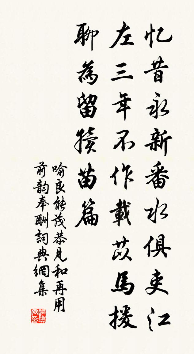 詩詞名句歷史字典書法欣賞書法字典國語詞典說文解字康熙字典古漢語字典標 題 作 者 詩 句 茂恭見和再用前韻奉酬作者:喻良能 朝代:宋代茂恭見和再用前韻奉酬原文憶昔永新番水,俱吏江左三年。不作載苡馬援,聊為留犢苗篇。詩詞問答問:茂恭見和再用前韻奉酬的作者是誰?答:喻良能問:茂恭見和再用前韻奉酬寫於哪個朝代?答:宋代喻良能茂恭見和再用前韻奉酬書法欣賞茂恭見和再用前韻奉酬書法作品詩詞推薦洞仙歌周紫芝〔宋代〕江梅吹盡,更幽蘭香度。可惜濃春為誰住。最嫌他、無數輕薄桃花,推不去,偏守定、東風一處。病來應怕酒,□菩薩蠻(又名子夜歌、巫山一片雲、重疊金)李曄〔唐代〕登樓遙望秦宮殿,茫茫只見雙飛燕。渭水一條流,千山與萬丘。遠煙籠碧樹,陌上行人去。安得有英雄,迎歸大內雜感陸游〔宋代〕禍福雖雲不可猜,人生要豈願為才。髑髏正使非不樂,犧象何疑是木災。祝英台近(薔薇)史達祖〔宋代〕綰流蘇,垂錦綬。煙外紅塵逗。莫倚莓牆,花氣釅如酒。便愁醺醉青虬,蜿蜿無力,戲穿碎、一屏新繡。謾懷舊。門前路陸龜蒙〔唐代〕門前向城路,一直復一曲。曲去日中還,直行日暮宿。何必日中還,曲途荊棘間。勸學示子元夫姚勉〔宋代〕事業功名在讀書,聖賢妙處著工夫。區區只為潭潭府,不敢如韓訓阿符。端嘉雜詩二十首劉克莊〔宋代〕說向丁男與小姑,各勤耕織了軍需。莫教塞北同文軌,卻為江南減賦輸。偶作連文鳳〔宋代〕少年場屋苦奔波,每對書檠讀不多。三十年來書好讀,可鄰老眼費摩挲。寫懷二首曾鞏〔宋代〕荒城絕所之,歲暮浩多思。病眼對湖山,孤吟寄天地。用心長者間,已與兒女異。況排千年非,獨抱六經意。終非次韻聞善黃庭堅〔宋代〕扶醉三竿日,題詩一研埃。張羅門帶雪,投轄井生苔。待得成丘隴,誰能把酒杯。常應 * 畔,悵望白衣來。白蓮池泛舟白居易〔唐代〕白藕新花照水開,紅窗小舫信風回。誰教一片江南興,逐我殷勤萬里來?月李嶠〔唐代〕桂滿三五夕,蓂開二八時。清輝飛鵲鑒,新影學蛾眉。皎潔臨疏牖,玲瓏鑒薄帷。願言從愛客,清夜幸同嬉。回渡荷葉浦張鎡〔宋代〕宿雨驚眠變早涼,喜成負便放歸航。山雲野樹水墨暗,蘆葉荷花文繡香。藉枕冰藤醒倦思,打簾珠浪發清狂。天圍贊李源圓澤圖釋法薰〔宋代〕昭昭靈靈,未脫生死。等閒狹路相逢,無奈這冤家子。天竺山前招角歌,至今餘韻在松蘿。折柳詞趙崇嶓〔宋代〕行人須折柳,折取最長條。明日天涯路,無人看舞腰。登謝屐亭贈謝行之葉紹翁〔宋代〕君家靈運有山癖,平生費卻幾兩屐。從人喚渠作山賊,內史風流定誰識。西窗小憩足力疲,夢賦池塘春草詩。只今次韻王待制讀東坡詩兼述韓歐之美一首喻良能〔宋代〕文章端與時高下,列國有風周有雅。建安氣質混不傷,齊梁紛紛堪斗量。先唐詩人子韓子,落筆洗空千古士。篇章先天易吟三十首方回〔宋代〕嗜慾損為益,榮華降是升。圓圖觀起處,生意伏陰凝。詠史上周公陳普〔宋代〕仲尼齒髮正強時,夜夜神交似故知。話到子孫郊禘處,幾回對榻共攢眉。山圃梅潘璵〔宋代〕舊種梅盈圃,山居未是貧。臘前春訊息,林下玉精神。水月西湖夢,風霜晚歲身。分明隱君子,不肯惹紅塵。名句推薦我本不棄世,世人自棄我。李白《送蔡山人》 曾把芳心深相許。故夢勞詩苦。史達祖《留春令·詠梅花》 諫爭輔拂之人,社稷之臣也,國君之寶也,明君之所尊厚也荀子《荀子·臣道》 曉月過殘壘,繁星宿故關。司空曙《賊平後送人北歸》 白髮漁樵江渚上,慣看秋月春風。楊慎《臨江仙·滾滾長江東逝水》 酹酒蒼茫,倚歌平遠,亭上玉虹腰冷。吳文英《十二郎·垂虹橋》 心者修裔之根,未有根不植而枝葉榮茂者。洪應明《菜根譚·概論》 尚憐終南山,回首清渭濱。杜甫《奉贈韋左丞丈二十二韻》 人生無根蒂,飄如陌上塵。陶淵明《雜詩》 玉容寂寞淚闌乾,梨花一枝春帶雨。白居易《長恨歌》