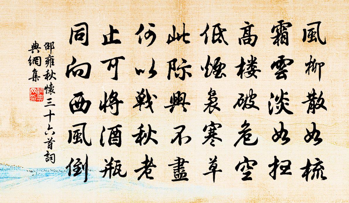 詩詞名句歷史字典書法欣賞書法字典國語詞典說文解字康熙字典古漢語字典標 題 作 者 詩 句 秋懷三十六首作者:邵雍 朝代:宋代秋懷三十六首原文風柳散如梳,霜雲淡如掃。高樓破危空,低煙裊寒草。此際興不盡,何以戰秋老。止可將酒瓶,同向西風倒。詩詞問答問:秋懷三十六首的作者是誰?答:邵雍問:秋懷三十六首寫於哪個朝代?答:宋代邵雍秋懷三十六首書法欣賞秋懷三十六首書法作品詩詞推薦泊舟有懷良史偉長〔宋代〕渺渺復迢迢,楓林帶板橋。沙寒初上月,浦暗已回潮。霜葦多先折,江花或後凋。今宵何處雁,相伴宿蘭橈。欲游龍山鹿苑有作齊己〔唐代〕龍山門不遠,鹿苑路非遙。合逐閒身去,何須待客招。年華殘兩鬢,筋骨倦長宵。聞說峰前寺,新修白石橋。自府中歸寄西庵行詳王安石〔宋代〕意衰難自力,扶路便思還。強逐蕭 * ,遙看慘澹山。行尋香草遍,歸漾晚雲間。西崦分明見,幽人不可攀。幽棲陸游〔宋代〕誰謂幽棲陋,茅茨足庇床。雨便梧葉大,風度練花香。浴佛兒童喜,繅絲婦女忙。朅來三十載,吾鬢固宜霜。送客至望雲門外陸游〔宋代〕冬溫頻作雨,晨冷頓催晴。嫩日滿江驛,淡煙籠郡城。憂民懷凜凜,謀己恥營營。投檄真須決,鄰翁約耦耕。次韻程弟方岳〔宋代〕柴門雖設不曾開,俗面向人三寸埃。卻是前溪雙白鷺,門關不住又飛來。食新有感黎廷瑞〔宋代〕盡道豐年好,停餐意惘然。離離洛都黍,莽莽建州田。湖山十景段橋殘雪王洧〔宋代〕望湖亭外半青山,跨水修梁影亦寒。待伴痕邊分草色,鶴驚碎玉吸闌乾。尚長道十年離索杯酒話舊,憮然若隔世,醉筆楊萬里〔宋代〕竹間露重午方乾,松里雲深復亦寒。只道一溪無十里,為誰百屈更千盤。落第口號艾性夫〔宋代〕萬里長風鷁退飛,自澆澗水濺征衣。滿身只有梅花影,不帶西湖柳色歸。內機知府郎官再和示教清拔遒美手不能置用韻程公許〔宋代〕愛間天示許君間,國步扶持奠鼎安。千古淮淝一棋局,土山盟在未應寒。寄送石鈞父二首李流謙〔宋代〕再見非無分,相逢自昔緣。牛峰留滿歲,鶴嶠別經年。師友今尤惜,書題遠尚傳。蔡山連越嶲,細認落鴻邊。余既題畲齋有聞紙田之說而笑者復作長篇戴表元〔宋代〕學農無年尤可待,學儒無成祗益餒。羨君終歲作書痴,聚室嗷嗷窮不悔。客來問計何所出,一飽自懸饘粥外,平生訪慧林寺僧因有詩戴復古〔宋代〕故人有約訪鄉僧,少坐西林待晚晴。雙燕護雛更出入,群鴉攫肉斗飛鳴。長溪積水流無盡,古木號風訴不平。一段漢廣亭曾鞏〔宋代〕悠悠漢水長,剡剡楚山密。若與心目期,爭從窗戶出。太守樸鄙人,迂無適時術。治民務不煩,得以偷暇日。北城自西園登山宿方廣寺林用中〔宋代〕登山極目望,梵宇自鮮明。風度閒花落,雲低野樹清。夜長人不寐,地僻月初生。明發又歸去,何能已此情。日南長至小飲於雙清樓坐客九人皆一時名勝各王志道〔宋代〕一杯春酒對湖山,遠勝夷猶綠水間。覓句未工天欲暮,碧動飛滿舍前灣。和彭教諭論詩陳杰〔宋代〕平生於二南,百過在芣莒。不知孰舞蹈,但覺烏可已。煌煌古人心,民與不死傳。天和本發中,世味或食耳。全明受用劉克莊〔宋代〕阮遙集平生幾屐,晏平仲半世一裘。禿翁受用能多少,槲葉為衣荷蓋頭。吊友人朱子大周文璞〔宋代〕與君昔並丹陽船,形容惘愴俱可憐。自說宅囿及百年,藏三小山出雲煙。土伯小廟自題扁,持照清池分醜妍。吁嗟名句推薦語來江色暮,獨自下寒煙。李白《尋雍尊師隱居》 易醉扶頭酒,難逢敵手棋。賀鑄《南歌子·疏雨池塘見》 歷覽千載書,時時見遺烈。陶淵明《癸卯歲十二月中作與從弟敬遠》 魚澤灘頭嘶獵馬,省嵬城畔看黃河。石茂華《九月九日登長城關》 困花壓蕊絲絲雨,不堪只共愁人語。徐燦《菩薩蠻·春閨》 好風憑藉力,送我上青雲。曹雪芹《臨江仙·柳絮》 杖劍對尊酒,恥為遊子顏。陸龜蒙《別離》 八佾舞於庭,是可忍也,孰不可忍也?孔子弟子《論語·八佾篇》 雨橫風狂三月暮,門掩黃昏,無計留春住。歐陽修《蝶戀花·庭院深深深幾許》 為害常因不察,致禍歸於不忍。來俊臣《羅織經·閱人卷第一》