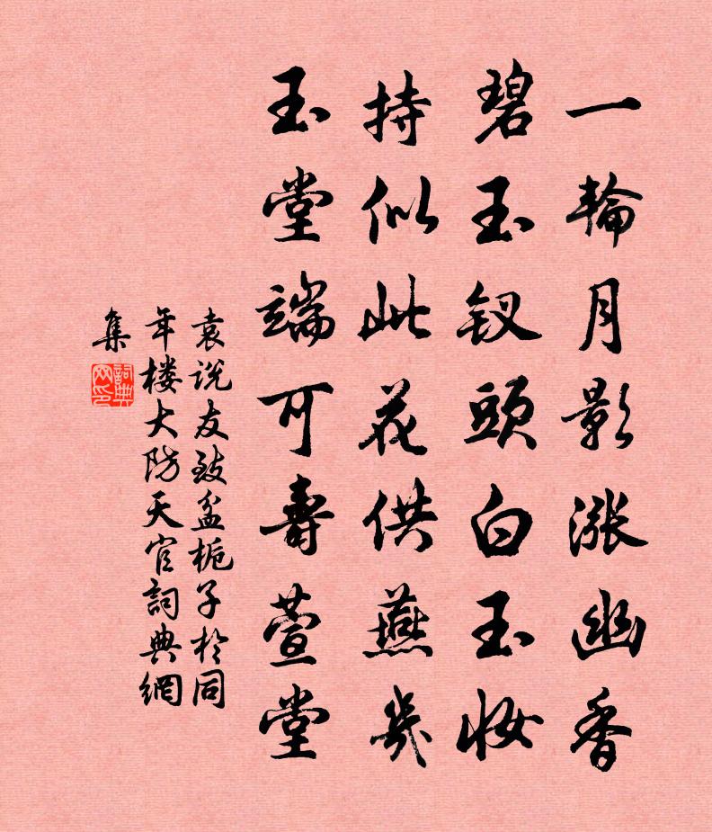 詩詞名句歷史字典書法欣賞書法字典國語詞典說文解字康熙字典古漢語字典標 題 作 者 詩 句 致盆梔子於同年樓大防天官作者:袁說友 朝代:宋代致盆梔子於同年樓大防天官原文一輪月影漲幽香,碧玉釵頭白玉妝。持似此花供燕几,玉堂端可壽萱堂。詩詞問答問:致盆梔子於同年樓大防天官的作者是誰?答:袁說友問:致盆梔子於同年樓大防天官寫於哪個朝代?答:宋代袁說友致盆梔子於同年樓大防天官書法欣賞致盆梔子於同年樓大防天官書法作品詩詞推薦江上別李秀才韋莊〔唐代〕前年相送灞陵春,今日天涯各避秦。莫向尊前惜沈醉,與君俱是異鄉人。蜀王入大慈寺聽講(天復三年作)貫休〔唐代〕玉節金珂響似雷,水晶宮殿步裴回。只緣支遁談經妙,所以許詢都講來。帝釋鏡中遙仰止,魔軍殿上動崔巍。千重水調歌頭 次東坡韻張玉娘〔元代〕 * 煉雲液,萬籟靜秋天。瓊樓無限佳景,都道勝前年。桂殿風香暗度,羅襪銀床立盡,冷浸一鉤寒。雪浪翻銀屋廬墓有感李景文〔宋代〕流水繞門去,愁雲壓徑斜。無人燒柏子,有客問梅花。橘熟猿窺樹,池空鳥啄沙。自傷寒穀日,不及照昏鴉。鷓鴣天晁端禮〔宋代〕八彩眉開喜色新。邊陲來奏捷書頻。百蠻洞穴皆王土,萬里戎羌盡漢臣。丹轉轂,錦拖紳。充庭列貢集珠珍。宮花減字木蘭花葛勝仲〔宋代〕葛山仙隱。尚有餘膏留舊鼎。十里梅花。夾道爭看袞繡華。人間妙麗。並侍黃扉開國貴。僻壤孤芳。羞澀尊前不敢和因格非見寄二首王之道〔宋代〕兀坐時看屋,閒居晝掩門。吳吟聊遣興,楚些欲招魂。否泰宜周易,行藏付魯論。不須傷老大,眠食度朝昏。用韻雜興廖行之〔宋代〕夏葛冬裘等一衫,飛黃跛鱉謾同驂。人情展轉憐風月,世路沈迷泣北南。我已灰心忘厚味,誰其緘口罷游談。如今題道宗上人十韻白居易〔唐代〕如來說偈贊,菩薩著論議。是故宗律師,以詩為佛事。一音無差別,四句有詮次。欲使第一流,皆知不二義。精潔寄題休寧趙氏雲屋省心翠侍問道亭有有堂五首方回〔宋代〕不品官班但品人,深雲藏屋屋藏身。就中別有難藏者,名震京師鄭子真。雙鳧觀(在葉縣)蘇軾〔宋代〕王喬古仙子,時出觀人寰。常為漢郎吏,厭世去無還。雙鳧偶為戲,聊以驚世頑。不然神仙跡,羅網安能攀。紛紛會覽亭三首張嵲〔宋代〕野岸平林對郡城,登臨領要在斯亭。江吞荊楚流空闊,山入興洋翠杳冥。剛晚雲煙昏近甸,沙晴鷗鷺滿前汀。杖藜贈聞人子進曹勛〔宋代〕丹地清江若有期,卜居仍俯小漣漪。頗憐松竹無多地,只頓琴書已近籬。久雨不妨田要潤,暫涼真與病相宜。何當聞雁施樞〔宋代〕飛盡沙田到水鄉,年年來往為誰忙。只貪月夜蘆花宿,不是將身傍稻粱。游山白玉蟾〔宋代〕廬山山下倒芳樽, * 人家煙水村。千尺雲崖春上蘚,幾重月樹夜啼猿。人騎黃鶴去不返,草沒丹爐今尚存。攜子曹路分贈詩次韻一首劉克莊〔宋代〕古來詩律推曹氏,不數河梁與董逃。唐季三家松最勝,建安七子植尤高。短檠尚課兒精選,老筆真堪仆命騷。極欲寒夜思飲酒不果與律同噉藥渣魚戲作陸游〔宋代〕我老畏作病,杯酒久不持;讀書寒雨中,比夕頗思之。呼童欲洗酌,顧以病自疑。清坐嘆寂寞,痛飲愁淋漓。三爵用韻答厲輔卿二首洪咨夔〔宋代〕坐窮無過客,失喜得吾儕。材逸類淮海,詩清如簡齋。山明知玉氣,水涸見霜涯。期子進此道,為親生好懷。王書記以近詩三篇相示各摭其意以詩賡之投司馬光〔宋代〕聖俞精為詩,堅重比白玉。於寶識之希,未必庇眾目。應辰仰高風,跂從自西蜀。平生示相識,歉歉不自足。薄游義寧產蓴菜中秋大熟副以六絕送楊伯子曾豐〔宋代〕吳人縷玉作常烹,南粵相逢眼卻生。張翰思歸食忘味,鑑湖震澤見於羹。名句推薦今年海角天涯。蕭蕭兩鬢生華。李清照《清平樂·年年雪裡》 江皋樓觀前朝寺,秋色入秦淮。徐再思《人月圓·甘露懷古》 天山三丈雪,豈是遠行時。李白《獨不見》 遙想江口依然,鳥啼花謝,今日誰為主。王瀾《念奴嬌·避地溢江書於新亭》 嫁女擇佳婿,毋索重聘;娶媳求淑女,勿計厚奩。朱柏廬《朱子家訓·全文》 夕陽西下,斷腸人在天涯。馬致遠《天淨沙·秋思》 一夕輕雷落萬絲,霽光浮瓦碧參差。秦觀《春日》 萬事不由人做主,一心難與命爭衡。羅貫中《三國演義·第一百十三回》 唯有閒愁將不去,依舊住,伴人直到黃昏雨。段克己《漁家傲·詩句一春渾漫與》 只知逐勝忽忘寒,小立春風夕照間。楊萬里《最愛東山晴後雪》