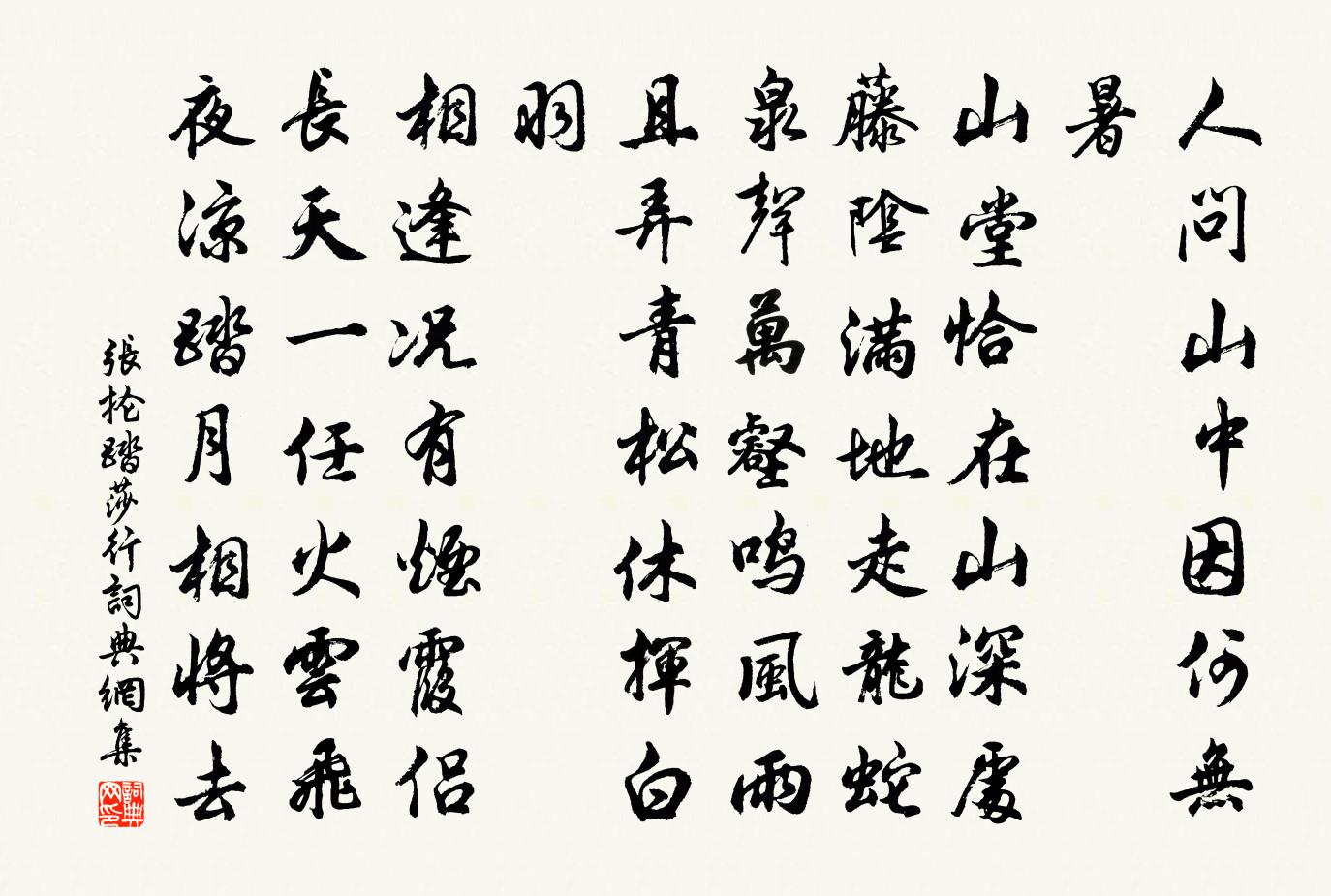 詩詞名句歷史字典書法欣賞書法字典國語詞典說文解字康熙字典古漢語字典標 題 作 者 詩 句 踏莎行作者:張掄 朝代:宋代踏莎行原文人問山中,因何無暑。山堂恰在山深處。藤陰滿地走龍蛇,泉聲萬壑鳴風雨。且弄青松,休揮白羽。相逢況有煙霞侶。長天一任火雲飛,夜涼踏月相將去。詩詞問答問:踏莎行的作者是誰?答:張掄問:踏莎行寫於哪個朝代?答:宋代問:踏莎行是什麼體裁?答:詞張掄踏莎行書法欣賞踏莎行書法作品詩詞推薦和胡教授蒙太守策試諸生蘇轍〔宋代〕著籍初同闕里多,采芹先致魯風和。欲將大策觀胸膽,盡召中堂列雁鵝。終日正言何忌諱,幾人餘力尚委蛇。豈惟導引佚名〔宋代〕霜月苦、宮鼓冬冬。霓旐啟、鶴闈空。洞簫聲斷知何處,海山依約五雲東。玉符龍節參神閟,昭聖眷、慘天容。千宮詞一百首岳珂〔宋代〕夜深雪壓內門前,一榻還驚四璧天。上相傳觴妻擁炭,歸來{右鼻右乾}息頓安眠。田司空入朝張籍〔唐代〕西來將相位兼雄,不與諸君覲禮同。早變山東知順命,新收濟上立殊功。朝官敘謁趨門外,恩使喧迎滿路中。閶闔訓世孝弟詩十一首邵雍〔宋代〕每日清晨一炷香,謝天謝地謝三光。所求處處田禾熱,惟願人人壽命長。國有賢臣安社稷,家無逆子惱爹娘。四方頌古九十八首釋印肅〔宋代〕無量光圓不動尊,亘今亘古語奚論。普雲彌布香芬馥,周行無住海幢門。句晏殊〔宋代〕江城嘉號木芙蓉,金蕊瓊萼綻蓼風。再登岳陽樓感慨賦詩陳與義〔宋代〕岳陽壯觀天下傳,樓陰背日堤綿綿。草木相連南服內,江湖異態欄乾前。乾坤萬事集雙鬢,臣子一謫今五年。欲題寄許八張說〔唐代〕萬類春皆樂,徂顏獨不怡。年來人更老,花發意先衰。乳鵲穿壇畫,巢蜂觸網絲。平生美容色,宿昔影中疑。遠道答王定國問疾蘇轍〔宋代〕五年竄南荒,頑質不伏病。吸清吐濁穢,氣練骨隨勁。澹然久忘歸,寂寂就遐屏。國恩念流落,牽挽畀鄰境。葉舟建元寺西院寄李員外縱聯句皇甫曾〔唐代〕寄隱霜台客,相思粉署人。 ——崔子向誠知阡陌近,無奈別離頻。 ——皇甫曾夜色迷雙樹,鐘聲警四鄰。 —寒食日答李公擇三絕次韻蘇軾〔宋代〕巡城已困塵埃眯,執撲仍遭蟣虱緣。欲脫布衫攜素手,試開病眼點黃連。下第歸故園薛嵎〔宋代〕扁舟搖盪水心村,幾度煙波入夢魂。猨鶴認名聽號令,淦樵報禮敘寒溫。浮生多事景逾促,自古求人道不尊。莫為尋花劉言史〔唐代〕遊春未足春將度,訪紫尋紅少在家。借問流鶯與飛蝶,更知何處有幽花。孤山和李鶴田汪元量〔宋代〕湖上悲風舞白楊,英雄凋盡只堪傷。花飛廢苑憐銅馬,草沒荒墳臥石羊。人在醉中春已晚,客於愁處日偏長。林西遣懷釋紹嵩〔宋代〕抱瘵便秋晚,無言祗自知。是身多落寞,半世足飄離。靜閱王維畫,閒圍李遠棋。慨然嘆時命,轉覺命堪疑。壽定叟弟張栻〔宋代〕聞說清朝對紫宸,君王側席屢諮詢。惟應民瘼開陳切,故遣分符驗撫循。偶題翁卷〔宋代〕綠樹何稠疊,清風稍羨餘。枕縈雲片片,簾透雨疎疎。修筧通泉壑,殘碑出野鋤。丘陵知幾變,耕稼學陶漁。雨夜四鼓起坐至明陸游〔宋代〕門巷冷如冰,生涯淡似僧;小窗愁夜雨,孤影怯秋燈。林鵲棲仍起,山童喚不應。悠然坐待旦,息倦倚書縢。宮詞王珪〔唐代〕花里宮鶯曉未啼,千牛仗下報班齊。銀袍五百趨龍尾,天子臨軒賜御題。名句推薦奈何今之人,雙目送飛鴻。李白《鞠歌行》 莫笑農家臘酒渾,豐年留客足雞豚。陸游《游山西村》 近寒食人家,相思未忘苹藻香。史達祖《壽樓春·尋春服感念》 人有逆天之時,天無絕人之路。馮夢龍《醒世恆言·卷三十二》 彩扇紅牙今都在,恨無人、解聽開元曲。蔣捷《賀新郎·夢冷黃金屋》 閨中風暖,陌上草薰江淹《別賦》 天地之性,人為貴。 人之行,莫大於孝。孔子及其弟子《孝經·聖治》 等閒老去年華促。只有江梅伴幽獨。孫道絢《滴滴金·梅》 金帶連環束戰袍,馬頭沖雪度臨洮。馬戴《出塞詞》 常人安於故習,學者溺於所聞。商鞅《商君書·更法》