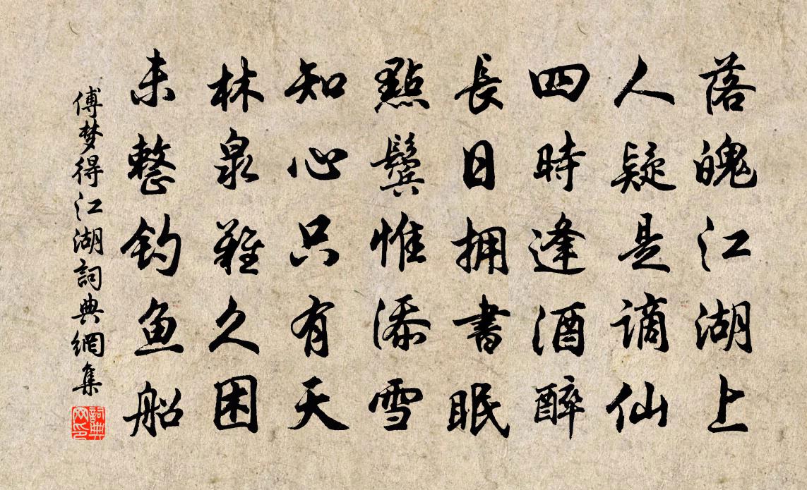 詩詞名句歷史字典書法欣賞書法字典國語詞典說文解字康熙字典古漢語字典標 題 作 者 詩 句 江湖作者:傅夢得 朝代:宋代江湖原文落魄江湖上,人疑是謫仙。四時逢酒醉,長日擁書眠。點鬢惟添雪,知心只有天。林泉難久困,未整釣魚船。詩詞問答問:江湖的作者是誰?答:傅夢得問:江湖寫於哪個朝代?答:宋代傅夢得江湖書法欣賞江湖書法作品詩詞推薦幽谷晚飲歐陽修〔宋代〕一逕入蒙密,已聞流水聲。行穿翠筱盡,忽見青山橫。山勢抱幽谷,谷泉含石泓。旁生嘉樹林,上有好鳥鳴。鳥語君山石祖文〔宋代〕遠邇朝宗勢拱辰,名高豈特為春申。孤峰堆阜無多地,一水仙凡隔幾塵。簪履三千誰念楚,山河百二漫夸秦。雲煙寒食夜崔道融〔唐代〕滿地梨花白,風吹碎月明。大家寒食夜,獨貯望鄉情。首尾吟邵雍〔宋代〕堯夫非是愛吟詩,詩是堯夫樂靜時。藥里君臣慵點對,琴中文武倦更移。鼎間龍虎忘看守,棋上山河廢指揮。亦恐早桃花方回〔宋代〕劉郎異種出天台,雪裡夭夭解早開。鄰舍覓花聊折送,只應遙認是紅梅。詠懷魏野〔宋代〕靜顧身兼世,何須哂復吁。境牽情各有,道斷事皆無。拜少腰寧負,眠多眼不辜。權豪任相笑,適性自為娛。拔灘方岳〔宋代〕大灘嶅嶅,小灘嘈嘈。石芒犖犖容刀,崩洪斗落與石鏖。風聲悲壯波聲豪,勢如萬馬之奔、群熊之嗥。並船欲上牽讀三學士人論事三書戴復古〔宋代〕黃屋見聞遠,朱門富貴忙。屠沽思報國,樵牧解談王。能轉禍為福,毋令聖作狂。草茅垂白叟,尚擬見時康。阮郎歸晏幾道〔宋代〕舊香殘粉似當初,人情恨不如。一春猶有數行書,秋來書更疏。衾鳳冷,枕鴛孤,愁腸待酒舒。夢魂縱有也成虛,送李密學赴亳州梅堯臣〔宋代〕倦輸關內粟,遂請潁川符。治績可稱最,士民將以蘇。譙都君命重,苦縣祖風殊。仙檜留陰在,甘棠即化敷。行舟同七兄及崧上人自墳莊還寺張耒〔宋代〕和風快人意,岸幘晚襟涼。日落野痕碧,月生淮際光。論詩得靈運,靜語屬支郎。不是耽閒散,從來懶性長。雜詠十首方鳳〔宋代〕瑞世鳳鳴陽,司晨雞鳴醜。呶呶取人憎,亂蟬合緘口。謁子真祠王遂〔宋代〕漢朝容默獨危言,吳市逃名恥自全。千古無人知此意,浪將姓字作梅仙。念奴嬌(荷葉浦雪中作)王千秋〔宋代〕扁舟東下,正歲華將晚,江湖清絕。萬點寒鴉高下舞,凝住一天雲葉。映筱漁村,衡茅酒舍,淅瀝鳴飛雪。壯懷興竹{左鼠右留}王禹偁〔宋代〕商嶺多修篁,蒼翠連山谷。有鼠生其中,薦食無厭足。春筍齧生犀,秋筠折寒玉。飫飽致肥腯,優遊恣蕃育。林密催梅林景熙〔宋代〕參橫月落幾相思,第一春風向此期。乘興竹筇霜後路,寄聲籬落水邊枝。禁中鼓絕花奴老,海上宮深鳥使遲。獨抱殘菊史鑄〔宋代〕天地方收肅殺功,菊權傾倒不成叢。碎金狼藉不堪摘,圖得人知色是空。偈頌六十五首釋普濟〔宋代〕大道無門,十方有路。無門不可不入,有路不可不到。阿呵呵,參禪,不說教。飽飯熟睡游談,三毒無明浩浩。北偈頌一百四十一首釋師範〔宋代〕一拽石,二搬土。三分甜,七分苦。糞箕拈起兩肩擔,颺下钁頭地覓處。山茶郭印〔宋代〕嚴冬能獨秀,渾不藉春風。葉自經霜碧,花應斗日紅。望中幾眩眼,高處欲燔空。安得栽培手,移根向邑中。名句推薦未怪平陽客,雙淚落、笛中哀曲周邦彥《大酺·春雨》 二月黃鶯飛上林,春城紫禁曉陰陰。錢起《贈闕下裴舍人》 採蓮南塘秋,蓮花過人頭。佚名《西洲曲》 凡事皆須務本。國以人為本,人以衣食為本吳兢《貞觀政要·卷八·論務農》 嗚呼!楚雖三戶能亡秦,豈有堂堂中國空無人!陸游《金錯刀行》 君子素其位而行,不願乎其外。子思《中庸·第十四章》 威宜自嚴而寬,先寬後嚴者人怨其酷。洪應明《菜根譚·概論》 愁凝處,渺渺殘照紅斂吳文英《宴清都·秋感》 東邊日出西邊雨,道是無晴卻有晴。劉禹錫《竹枝詞二首·其一》 寒禽與衰草,處處伴愁顏。司空曙《賊平後送人北歸》