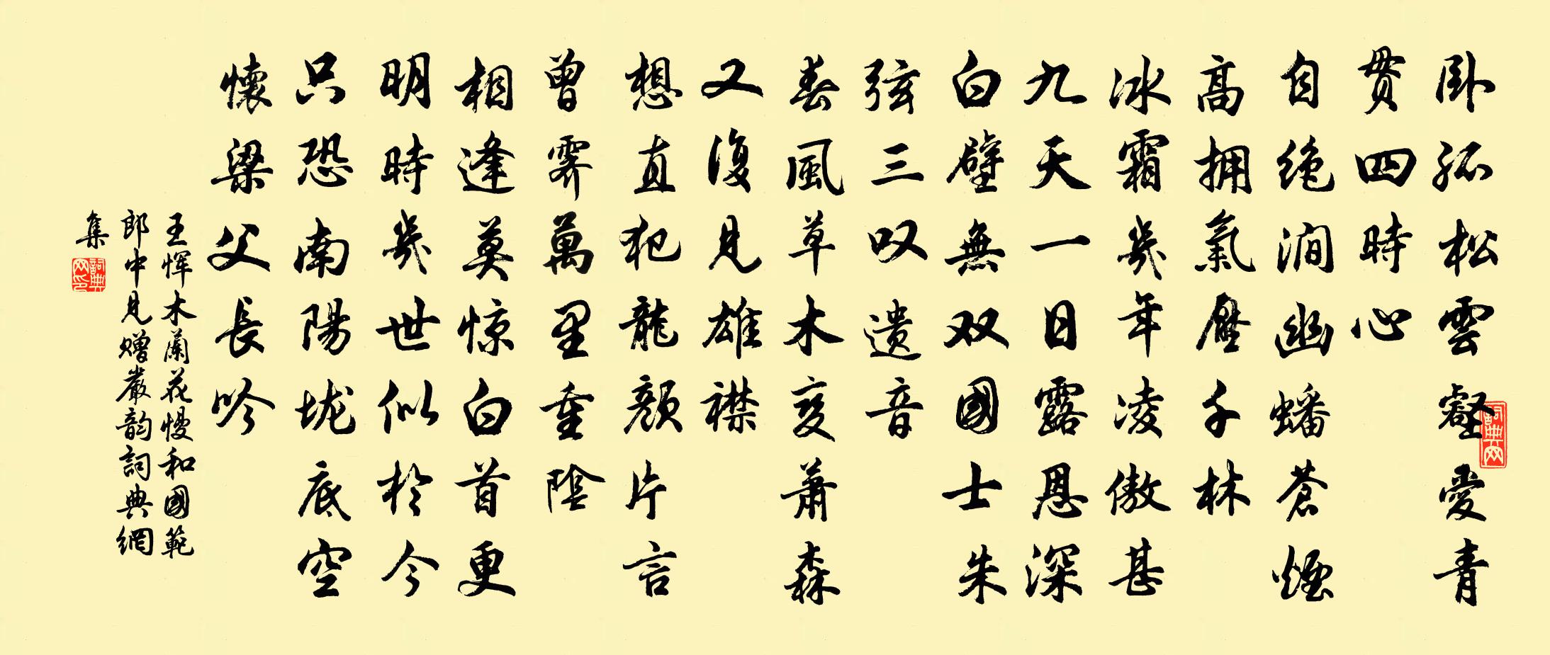 詩詞名句歷史字典書法欣賞書法字典國語詞典說文解字康熙字典古漢語字典標 題 作 者 詩 句 木蘭花慢 和國范郎中見贈嚴韻作者:王惲 朝代:元代原文臥孤松雲壑,愛青貫,四時心。自絕澗幽蟠,蒼煙高擁,氣壓千林。冰霜幾年凌傲,甚九天、一日露恩深。白壁無雙國士,朱弦三嘆遺音。春風草木變蕭森。又復見雄襟。想直犯龍顏,片言曾霽,萬里重陰。相逢莫驚白首,更明時、幾世似於今。只恐南陽壠底,空懷梁父長吟。詩詞問答問:《木蘭花慢 和國范郎中見贈嚴韻》的作者是誰?答:王惲問:該詩寫於哪個朝代?答:元代問:該詩是什麼體裁?答:詞書法欣賞木蘭花慢 和國范郎中見贈嚴韻書法作品詩詞推薦擬古釋文珦〔宋代〕事往不可追,愁來不可掃。悠悠百年間,一身孰能保。昔為席上珍,今作路傍草。倚伏理則然,寧復有當道。古者來燕堂聯句謝絳〔宋代〕賢侯謝郡歸,從遊樂吾黨。林泉富餘地,卜築疏陳莽。是時春正中,來燕音下上。若賀大廈成,喜留眾賓賞。得名承甫兄生朝項安世〔宋代〕鶴雲絲雨弄春柔,鳳蠟龍薰淑氣浮。頌柏杯盤連月尾,夢蘭時節占年頭。吹開郗桂千花上,斂退堯蓂一莢留。好個同水心吊薛子舒墓戴栩〔宋代〕自劚青雲去,長途墜玉鑣。有名天所吝,無病藥為妖。月斧千家寂,霓梭五色銷。夢靈虛吐鳳,數短實如鴞。筦庫送稅官仇副使詩十首熊禾〔宋代〕世事良可見,浩蕩書生心。先民亦會計,儒道終當行。戲答仲儀口號歐陽修〔宋代〕弊居回看如蛙穴,華宇來棲若燕身。敢望笙歌行樂事,只憂無米過來春。情詩其一倉央嘉措〔清代〕東山崔嵬不可登,絕頂高天明月生,紅顏又惹相思苦,此心獨憶是卿卿。大風不能出戶陸游〔宋代〕昨日欲出病見留,今日可出風復作。室虛窗白爐火暖,閉戶幸有圖書樂。一杯淡粥飽則已,下箸豈復思藜藿。山禽抒懷張蠙〔唐代〕幾齣東堂謝不才,便甘閒望故山回。翻思未是離家久,更有人從外國來。崇仙觀吳鎰〔宋代〕浮丘仙袂風中挹,子晉吹笙月下聞。翠蓋霓裳君過我,尻輿神馬我從君。謝林景思和韻樓鑰〔宋代〕黃昏門外六花飛,困倚胡床醉不知。凍合玉樓猶強項,擁衾方詠雪巢詩。婆羅門引 辛卯中秋望月張之翰〔元代〕宦遊南北,月明何處不相隨。十年九賦新詞。今夜清光如許。無以侑金*。想叨居此職,著甚推辭。臨風再思。是偶題裴廷裕〔唐代〕微雨微風寒食節,半開半合木蘭花。看花倚柱終朝立,卻似淒淒不在家。有聞若管吹者意兒童為之問之乃鳥有名竹管者趙蕃〔宋代〕蠶絲百箔舊曾聞,未說新絲價爾分。卒歲我無裘褐計,早知勸爾勿多雲。頌證道歌證道歌釋印肅〔宋代〕非色非心非行業,休指黃花並綠葉。說時似有證時無,從此家邦大字貼。書冷泉亭壁周端臣〔宋代〕一酌野泉香,翛然俗慮忘。靜聽山鳥話,如笑世人忙。近水苔常濕,無風樹亦涼。老僧閒似我,清坐到斜陽。武陵春·桃李風前多嫵媚辛棄疾〔宋代〕桃李風前多嫵媚,楊柳更溫柔。喚取笙歌爛熳游。且莫管閒愁。好趁春晴連夜賞,雨便一春休。草草杯盤不要收。虢州獻楊抑卿二首姚鵠〔唐代〕蓋世英華更有誰,賦成傳寫遍坤維。名科累中求賢日,苦節高標守郡時。樓上叫雲秋鼓角,林間宿鶴夜旌旗。征歸雜感陸游〔宋代〕老境睡多行立少,浮生會少別離多。安得此身重壯健,一杯朋舊共高歌?偈頌一百零一首釋慧性〔宋代〕春山青,春水綠。草葺葺,花簇簇。若能喪盡目前機,便見廬山真面目。名句推薦人以自是,反以相誹。呂不韋《呂氏春秋·覽·慎大覽》 相思血,都沁綠筠枝。姜夔《小重山令·賦潭州紅梅》 驚回千里夢,已三更。起來獨自繞階行。岳飛《小重山·昨夜寒蛩不住鳴》 將失權,不操其勢,亦如魚龍脫於江湖,欲求游洋之勢,奔濤戲浪,何可得也。諸葛亮《將苑·卷一·兵權》 問訊湖邊春色,重來又是三年。張孝祥《西江月·問訊湖邊春色》 洛陽城裡春光好,洛陽才子他鄉老。韋莊《菩薩蠻》 漢家天馬出蒲梢,苜蓿榴花遍近郊。李商隱《茂陵》 擁紅妝,翻翠蓋,花影暗南浦。高觀國《祝英台近·荷花》 上窮碧落下黃泉,兩處茫茫皆不見。白居易《長恨歌》 起來搔首,梅影橫窗瘦。汪藻《點絳唇·新月娟娟》