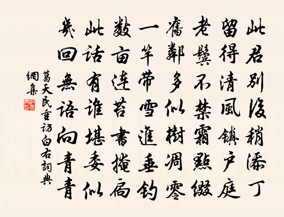 詩詞名句歷史字典書法欣賞書法字典國語詞典說文解字康熙字典古漢語字典標 題 作 者 詩 句 重訪白右作者:葛天民 朝代:宋代重訪白右原文此君別後稍添丁,留得清風鎮戶庭。老鬢不禁霜點綴,舊鄰多似樹凋零。一竿帶雪進垂釣,數畝連苔書掩扃。此話有誰堪委似,幾回無語向青青。詩詞問答問:重訪白右的作者是誰?答:葛天民問:重訪白右寫於哪個朝代?答:宋代葛天民重訪白右書法欣賞重訪白右書法作品詩詞推薦紅薔薇花方回〔宋代〕月桂金沙各斗春,薔薇紅透更精神。雖然面似佳人笑,滿體鋒鋩解刺人。秋日雜興敖陶孫〔宋代〕客從湘中來,問我手中松。當時一雨根,翥霄作鸞龍。子可爇我鼎,肪可澤我容。松今已如此,而況種樹翁。寄聲端午帖子皇后閣周必大〔宋代〕筒黍嘗思時獻稑,彩絲擊處憶親蠶。女紅躬儉今猶昔,應有詩人賦二南。九日奉陪侍郎登白樓盧綸〔唐代〕碧霄孤鶴髮清音,上宰因添望闕心。睥睨三層連步障,茱萸一朵映華簪。紅霞似綺河如帶,白露團珠菊散金。此日海棠春(郊行)吳潛〔宋代〕天涯芳草迷征路。還又是、匆匆春去。烏兔里光陰,鶯燕邊情緒。雲梢霧末,溪橋野渡,儘是春愁落處。把酒勸斜偈頌七十一首釋了惠〔宋代〕這些業種自何來,雖不同門共一家。連累山僧至今日,一重枷上又添枷。聖俞詩名聞固久矣加有好事者時傳新什至此每杜衍〔宋代〕李杜詩垂不配名,君能刻意繼芳馨。清才綽綽臻神妙,逸韻飄飄入杳冥。動與四方明得失,時教萬物被丹青。斯文過賈似道葛嶺舊居釋文珦〔宋代〕順逆 * 心,成敗翻覆手。鬼神不相容,子孫豈能守。昔者過此門,歌鐘會群醜。今者過此門,闐然已豐蔀。羞死句任希夷〔宋代〕綠柳陰中獅子巷,白平亭畔駱駝橋。贈青濰將謝承制蘇軾〔宋代〕吾皇有意縛單于,槌破銅山鑄虎符。驍將新除三十六,精兵共領五千都。周王常德須攘狄,漢帝雄才亦尚儒。君學偈頌四十一首釋普寧〔宋代〕諸方安居結制,靈岩結制安居。雖是一般規矩,於中大有差殊。趙州東壁掛葫蘆。還鄧覺民詩卷孫嵩〔宋代〕南山竹機笛,北山桐可琴。得如聽松風,中有太古音。送王存之文同〔宋代〕野水冰生薄似綿,短亭梅發大於錢。想君歸到江陽日,欲話今時已去年。上廣東漕使黃郎中曾豐〔宋代〕三春彭兮,和氣弸兮。季於孟仲,和之英兮。至英收凝,天相丕乎。公生裕裕,集春之成。醉花陰楊無咎〔宋代〕捧杯不管餘酲惡。玉腕寬金約。宛轉一聲清,戛玉敲冰,渾勝鳴弦索。朱唇淺破桃花萼。重注鸕鶿杓。夜永醉歸來都下次韻謝松陽沈術人二首項安世〔宋代〕向來定遠太平平,自殿銀袍五百英。觜距不堪夸度席,齒牙無復近鄉評。重探虎穴顏何厚,忽見稽山眼暫明。賴有早春殘雪裴虔餘〔唐代〕霽日雕瓊彩,幽庭減夜寒。梅飄餘片積,日墮晚光殘。零落偏依桂,霏微不掩蘭。陰林披霧縠,小沼破冰盤。曲檻戴道士得四字代作蘇軾〔宋代〕少小家江南,寄跡方外士。偶隨白雲出,賣藥彭城市。雪霜侵鬢髮,塵土污冠袂。賴此三尺桐,中有山水意。自從題碧藻軒唐寅〔明代〕畫堂基構畫船通。碧水漣漪碧藻叢。波弄日光翻上棟。窗含煙景直浮空。簾垂菡萏花開上。魚戲欄桿倒影中。試倩以筍送諸公二首趙蕃〔宋代〕昔聞市上三時賣,今已春深見未嘗。莫道寒歷只寒相,及時也復事分張。名句推薦松竹翠蘿寒,遲日江山暮。曹組《卜運算元·蘭》 刻薄不賺錢,忠厚不折本。馮夢龍《醒世恆言·卷三》 東城漸覺風光好。宋祁《玉樓春·春景》 賈傳自憐多感慨,東門何意泥孤虛。王惲《送姬仲實隱士北還》 夫禮之初,始諸飲食戴聖《禮記·禮運》 佳辰強飲食猶寒,隱几蕭條戴鶡冠。杜甫《小寒食舟中作》 莫愁前路無知己,天下誰人不識君。高適《別董大二首》 其出不出,間不容髮。班固《漢書·傳·賈鄒枚路傳》 寂寂柴門村落里,也教插柳記年華。趙鼎《寒食》 山遠翠眉長。高處淒涼。菊花清瘦杜秋娘。吳文英《浪淘沙·九日從吳見山覓酒》