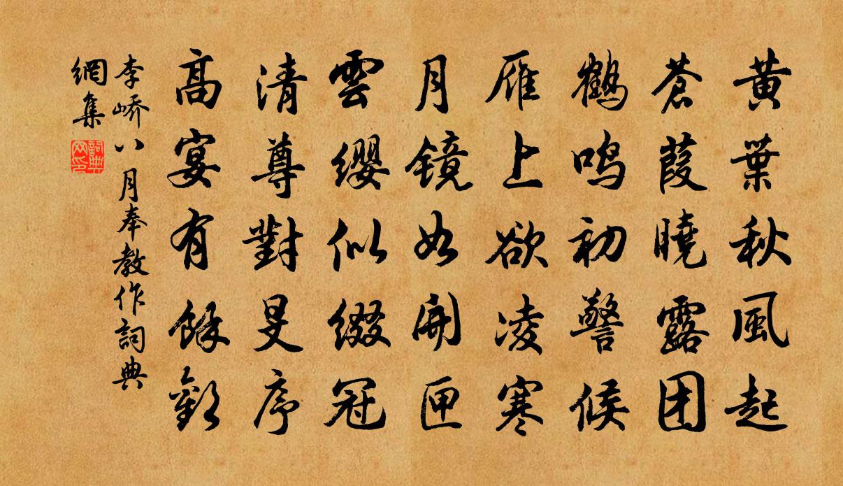 詩詞名句歷史字典書法欣賞書法字典國語詞典說文解字康熙字典古漢語字典標 題 作 者 詩 句 八月奉教作作者:李嶠 朝代:唐代八月奉教作原文黃葉秋風起,蒼葭曉露團。鶴鳴初警候,雁上欲凌寒。月鏡如開匣,雲纓似綴冠。清尊對旻序,高宴有餘歡。詩詞問答問:八月奉教作的作者是誰?答:李嶠問:八月奉教作寫於哪個朝代?答:唐代李嶠八月奉教作書法欣賞八月奉教作書法作品詩詞推薦祖餞三山趙茂實二首程公許〔宋代〕煌煌洛陽城,衢術萬國通。車塵日交鶩,襟期那易同。目成者誰歟,言笑春怡融。我自商聲歌,群亦手絲桐。西風晚春青門林亭燕集耿湋〔唐代〕都門連騎出,東野柳如絲。秦苑看山處,王孫逐草時。歡游難再得,衰老是前期。林靜鶯啼遠,春深日過遲。落花殿中楊監見示張旭草書圖杜甫〔唐代〕斯人已雲亡,草聖秘難得。及茲煩見示,滿目一悽惻。悲風生微綃,萬里起古色。鏘鏘鳴玉動,落落群松直。連山洞仙歌(答何君元壽詞)何夢桂〔宋代〕天涯何處,望蒼江渺渺。縱算解飛人不到。笑雙丸烏兔,兩鬢霜蓬,聊爾耳,那是人間三島。黃梁初夢覺,起看孤贈海州使君夏竦〔宋代〕天衢未得便,假道海邊城。任大才勝器,官間不稱名。勸農吟少暇,憂物睡常輕。見說行春處,和風滿旆旌。與伯順飯於文緯大光出宋漢傑畫秋山陳與義〔宋代〕焚香消午睡,開畫逢秋山。皇都馬聲中,有此四士閒。離離南國樹,閃閃湘水灣。悠悠孤鳥去,澹澹晨輝還。屐士余既和樂天詩而喜於年及之心猶不能自已又復吳芾〔宋代〕新歲妻孥慶七旬,遍賙鄰里及孤貧。高年滿座有醉客,丐者塞塗無餒人。平日要同人喜樂,此時寧間物疏親。餘生虞美人佚名〔宋代〕悲商吹盡枝間綠。絳萼含冰玉。為誰攙早冒寒開。應念天涯憔悴、挽春回。玉壺自酌清漪滿。又識東風面。夜深斜題尤使君郡圃十二詩樂山堂李庚〔宋代〕青山如避世,詎肯詣公府。仁人如好賢,招邀入庭戶。拄笏對朝氣,捲簾當暮雨。是中有佳趣,莫與兒輩語。和通山尹張松坡夢遊廬山吟余宏孫〔宋代〕我行匡廬鬢青青,往往大醉琵琶亭。歸來老我二十載,惟有夢寐勞神形。有時遍歷開先寺,老僧禪定齁齁睡。有時飯牛圖王冕〔元代〕君不見百里奚飯牛而牛肥,胸中經緯無人知;又不見老甯戚時不時兮長嘆息。偶爾君臣稱際會,伯道相高非盛德。范忠宣南都帖贊岳珂〔宋代〕符佑戰,九河溢,砥柱植兮。珪確競,天地昏,清風滌兮。大中之道,關百聖而不熄兮。用之不失其時,公獨得兮次韻同年楊廷秀使君寄題石湖范成大〔宋代〕儀凰當瑞九韶成,何事棲鸞滯碧城?公退蕭然真吏隱,文名藉甚更詩聲。句從月脅天心得,筆與冰甌雪碗清。書到寄晦岩佛光法師釋智愚〔宋代〕對文箋釋通人到,破名舂科作者難。不見澧陽焚鈔者,棒頭拈出尚寒酸。垂絲海棠范成大〔宋代〕春工葉葉與絲絲,怕日嫌風不自持。曉鏡為誰妝未辦,沁痕猶有淚臙脂。酬贈徐璣徐照〔宋代〕每到齋門敲始應,池禽雙戲動清波。愛閒卻道無官好,信僻如嫌有客多。字學晉碑終日寫,詩成唐體要人磨。山民招隱堂寄題樂郎中梅堯臣〔宋代〕日喔招隱詩,日誦歸田賦。未嘗見芸人,勇拋冠冕去。今聞緱山陰,身退效疏傅。一旦從犢車,歡言友田父。復來杭山八景章鑒〔宋代〕一邦佳景萃峰頭,宇宙鍾靈自有由。銀竹霏霏山氣盛,火輪顆顆水光浮。年逢旱澇他方苦,世際豐穰此處優。瞻望送趙中丞自司金郎轉官參山南令狐僕射幕府劉禹錫〔唐代〕綠樹滿褒斜,西南蜀路賒。驛門臨白草,縣道入黃花。相府開油幕,門生逐絳紗。行看布政後,還從入京華。峽路山行即事十首袁說友〔宋代〕跳山踏草笑迎逢,要識新侯過眼中。寄語山翁吾老矣,冬裘夏葛與伊同。名句推薦燎沉香,消溽暑。周邦彥《蘇幕遮·燎沉香》 黃鶴樓前日欲低,漢陽城樹亂烏啼李夢陽《夏口夜泊別友人》 朱門酒肉臭,路有凍死骨。杜甫《自京赴奉先縣詠懷五百字 / 自京赴奉先詠懷五百字》 日入室中暗,荊薪代明燭。陶淵明《歸園田居·其五》 兩行疏柳,一絲殘照,萬點鴉棲。劉基《眼兒媚·秋思》 春風依舊。著意隨堤柳。趙令畤《清平樂·春風依舊》 食者,國之寶也;兵者,國之爪也墨子《墨子·05章 七患》 江南臘盡,早梅花開後,分付新春與垂柳。蘇軾《洞仙歌·詠柳》 重到故鄉交舊少,淒涼。卻恐它鄉勝故鄉。陸游《南鄉子·歸夢寄吳檣》 石溪久住思端午,館驛樓前看發機。盧肇《競渡詩 / 及第後江寧觀競渡寄袁州剌史成應元》
