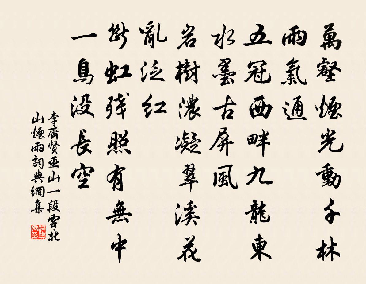 詩詞名句歷史字典書法欣賞書法字典國語詞典說文解字康熙字典古漢語字典標 題 作 者 詩 句 巫山一段雲 北山煙雨作者:李齊賢 朝代:元代巫山一段雲 北山煙雨原文萬壑煙光動,千林雨氣通。五冠西畔九龍東。水墨古屏風。岩樹濃凝翠,溪花亂泛紅。斷虹殘照有無中。一鳥沒長空。詩詞問答問:巫山一段雲 北山煙雨的作者是誰?答:李齊賢問:巫山一段雲 北山煙雨寫於哪個朝代?答:元代問:巫山一段雲 北山煙雨是什麼體裁?答:詞李齊賢巫山一段雲 北山煙雨書法欣賞巫山一段雲 北山煙雨書法作品詩詞推薦題玉泉釋道濟〔宋代〕千章老木冷涵秋,今日重來話舊遊。一池寒水浸虛碧,清光瑩澈凝不流。中有神龍隱頭角,為雨為霖滋旱涸。聖主奉答祖印喜雪二頌韓維〔宋代〕久旱終能不失時,田家喜氣吐虹霓。龐公昔日曾垂語,資福今朝更指迷。仆所至,未嘗出遊。過長蘆,聞復禪師病甚,蘇軾〔宋代〕老去此生一訣,興來明日重遊。臥聞三老白事,半夜南風打頭。和十二兄五首晃沖之〔宋代〕我家溱洧間,春水色如酒。嵩少在吾旁,日夕意亦厚。田園雖不廣,幽興隨事有。藥畦灌陳根,芋區采駢首。春郊篔簹谷曾興宗〔宋代〕渭川千畝竹,可比萬戶侯。我有篔簹谷,此豈為食謀。南山與北山,清絕真勝游。飛泉助蕭爽,怪石添清幽。娛親次韻和復古春日五絕句司馬光〔宋代〕燕拂人衣絮撲頭,紅英滿地綠陰稠。殘春舉目多愁思,休上迢迢百尺樓。【仙呂】一半兒_手帕藕絲纖王舉之〔元代〕手帕藕絲纖膩織春愁,粉線輕盈惹暮秋,銀葉拭殘香臉羞。玉溫柔,一半兒啼痕一半兒酒。開書淚痕香沁污鮫,墨送張判官罷使東歸劉長卿〔唐代〕白首辭知己,滄洲憶舊居。落潮回野艇,積雪臥官廬。范叔寒猶在,周王歲欲除。春山數畝地,歸去帶經鉏。和漢東先生韻六首張埴〔宋代〕一枰勝負何有心,往往局外多堪吟。今人未晤爛柯意,祗道歲月青山深。次韻吳守四首陳造〔宋代〕園林落粉吹香雪,魏光黃獨步春。明日插花同一醉,小閒譚麈岸綸巾。太上皇后合端午帖子詞汪應辰〔宋代〕仁心均動植,風化正邦家。福慶方駢集,靈符尚辟邪。八月十日過松水陳文蔚〔宋代〕拂石臨流幾歲秋,未嘗歷險究源頭。今朝拄上雲煙去,為吸清泠最上流。真青賈似道〔宋代〕青色頭如菩提子,項上毛青靛染成。牙鈴更得芝麻白,任君盡鬭足歡情。鷓鴣天晏幾道〔宋代〕梅蕊新妝桂葉眉,小蓮風韻出瑤池。雲隨綠水歌聲轉,雪繞紅綃舞袖垂。傷別易,恨歡遲,惜無紅錦為裁詩。行人將還家書寄社中陳宓〔宋代〕縈紆一帶本乎漫,碓碓依村自作灘。卷卻片帆舟轉急,斟殘斗酒雨猶寒。從教稚子嗔歸晚,只為良朋得會難。佳景與韓撫乾大倫八首袁燮〔宋代〕故國由來重世臣,芬芳累葉鎮如新。中興第一功臣裔,卓犖如君信有人。夜宿倪庵坐雨二首陳著〔宋代〕連朝雲靄靄,一夜雨颼颼。漲霧黑天曉,洗山黃澗流。潤深麻長骨,濕重麥垂頭。春水可農事,只愁兵未休。張建封大夫奏係為校書郎因寄此作秦系〔唐代〕久是煙霞客,潭深釣得魚。不知芸閣上,遺校幾多書。初冬道中曾鞏〔宋代〕潦退蛟螭不可逃,溪潭清澈見秋毫。欲霜日射西山赤,漸冷天騰北極高。秀色更濃唯竹柏,孤根先動是蓬蒿。感時越溪春歐陽修〔宋代〕三月十三寒食日,春色遍天涯。越溪閬苑繁華地,傍禁垣、珠翠煙霞。紅粉牆頭,鞦韆影里,臨水人家。歸來晚駐名句推薦窗外日光彈指過,席間花影坐前移。施耐庵《水滸傳·第二回》 枕前淚共階前雨,隔個窗兒滴到明。聶勝瓊《鷓鴣天·別情》 思家步月清宵立,憶弟看雲白日眠。杜甫《恨別》 花徑不曾緣客掃,蓬門今始為君開。杜甫《客至》 天下大勢,分久必合,合久必分。羅貫中《三國演義·第一回》 歌泣不成天已暮,悲風日夜起江生。魏禧《登雨花台》 念蘭堂紅燭,心長焰短,向人垂淚。晏殊《撼庭秋·別來音信千里》 既秉上皇心,豈屑末代誚。謝靈運《七里瀨》 慊慊思歸戀故鄉,君為淹留寄他方。曹丕《燕歌行》 鳳凰台上鳳凰游,鳳去台空江自流。李白《登金陵鳳凰台》