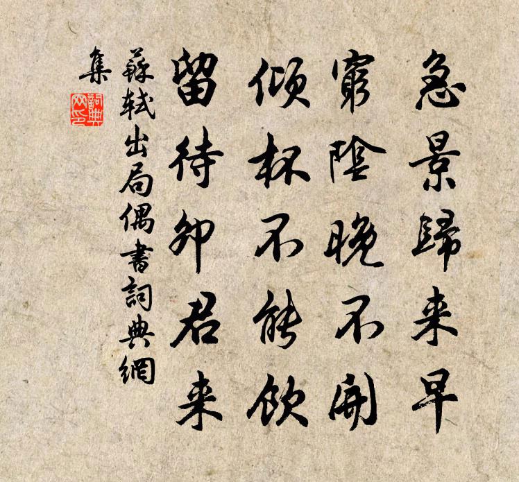 詩詞名句歷史字典書法欣賞書法字典國語詞典說文解字康熙字典古漢語字典標 題 作 者 詩 句 出局偶書作者:蘇軾 朝代:宋代出局偶書原文急景歸來早,窮陰晚不開。傾杯不能飲,留待卯君來。詩詞問答問:出局偶書的作者是誰?答:蘇軾問:出局偶書寫於哪個朝代?答:宋代問:蘇軾的名句有哪些?答:蘇軾名句大全蘇軾出局偶書書法欣賞出局偶書書法作品詩詞推薦上何太宰生日二首強至〔宋代〕斗杓西揭柄,南呂已飛灰。芝室占熊夢,蓬山挺梓材。世欣金鷟見,人慶玉麟來。天意非難料,行看位上台。十二月二十七日病起行花下聞春禽有感舒岳祥〔宋代〕昨日立春節,今晨春鳥鳴。前峰宿蒼靄,風聲和且平。南翁病來久,起繞花枝行。花枝向人笑,婉孌感幽情。摩挲長安寓居寄贈賈島(一作長安贈賈島)馬戴〔唐代〕歲暮見華發,平生志半空。孤雲不我棄,歸隱與誰同。枉道紫宸謁,妨栽丹桂叢。何如隨野鹿,棲止石岩中。和戶部令狐尚書喜裴司空見招看雪張籍〔唐代〕南園新覆雪,上宰曉來看。誰共登春榭,唯聞有地官。色連山遠靜,氣與竹偏寒。高韻更相應,寧同歌吹歡。晚釋文珦〔宋代〕暝色生前浦,日沉西嶺樹。隱約有孤僧,遠入深雲去。曉起探梅四首楊萬里〔宋代〕打並人間名利心,萬山佳處一溪深。仙家忍餓禪家苦,老子梅邊政醉吟。客有折秋香來桂隱者喜成七言呈以道張鎡〔宋代〕半紀移居野水旁,年年嘗為木樨忙。若非老樹從頭髮,安得西風徹骨香。數朵折來猶甚愛,滿林開後得無狂。今番寄右史李定言(許渾集寄李定言律詩第二三聯即此四句)姚合〔唐代〕才歸龍尾含雞舌,更立螭頭運兔毫。閶闔欲開金漏盡,冕旒初坐御香高。再題小西湖姚勉〔宋代〕深深晴日漲湖煙,開著蓬窗飽看蓮。只怕客來童放鶴,又催花里棹歸船。送遷客二首於鵠〔唐代〕得罪花誰人送,花來時不到花家。白頭花無侍子,多病向天涯。莽蒼凌江水,黃昏見塞花。如今賈誼賦,不漫說長雁舒岳祥〔宋代〕老雁移屯百萬回,黃埃極目磧沙飛。春風萬里梅花路,淼淼江南人未歸。殘句背之不見與無同蘇軾〔宋代〕背之不見與無同。新秋月夜寄故人強至〔宋代〕客心宜靜夜,月色澹新秋。影落三湘水,詩傳八詠樓。何窮對酒望,幾處捲簾愁。若問相思意,隨君萬里游。紹興以後蜡祭四十二首佚名〔宋代〕播種之功,時惟后稷。推以配天,莫匪爾極。崇侑清祀,是為司檣。陳幣奠將,永祚王國。朝雨陸游〔宋代〕午夜星照泥,平旦雲行西。小屋古澤中,天昏雨淒淒。避濕升我堂,垂翅閔老雞;所欣園中蔬,冒土青滿畦。門無約友秋賞衛宗武〔宋代〕秋霖盪殘暑,林飈鳴策策。乾坤灝氣浮,萬象互清發。望舒散天葩,拂拂余芬落。霽景行澄鮮,三五圓素魄。有園詠崔雲娘李宣古〔唐代〕何事最堪悲,雲娘只首奇。瘦拳拋令急,長嘯出歌遲。只見肩侵鬢,唯憂骨透皮。不須當戶立,頭上有鍾道。送嚴尉楊時〔宋代〕世路久艱棘,青冥翳妖氛。孤鳥叢祠中,豺虎填城闉。君能摘奸伏,竭澤無潛鱗。勿雲功未酬,屈蠖終當伸。飛黃千松嶺顧況〔唐代〕終日吟天風,有時天籟止。問渠何旨意,恐落凡人耳。和李二秀才張耒〔宋代〕羨君年少盛遊春,顧我無聊似厄陳。東市車牛泥到領,不勞舉袂障京塵。名句推薦流水本自斷人腸,堅冰舊來傷馬骨。盧思道《從軍行》 白水明田外,碧峰出山後。王維《新晴野望》 困花壓蕊絲絲雨,不堪只共愁人語。徐燦《菩薩蠻·春閨》 積學以儲寶,酌理以富才劉勰《文心雕龍·神思》 寒英坐銷落,何用慰遠客。柳宗元《早梅》 解釋春風無限恨,沉香亭北倚闌乾。李白《清平調·其三》 蓮子已成荷葉老。青露洗、蘋花汀草。李清照《怨王孫·湖上風來波浩渺》 知君慣度祁連城,豈能愁見輪台月。岑參《送李副使赴磧西官軍》 憑畫檻,雨洗秋濃人淡。厲鶚《謁金門·七月既望湖上雨後作》 西窗下,風搖翠竹,疑是故人來。秦觀《滿庭芳·碧水驚秋》