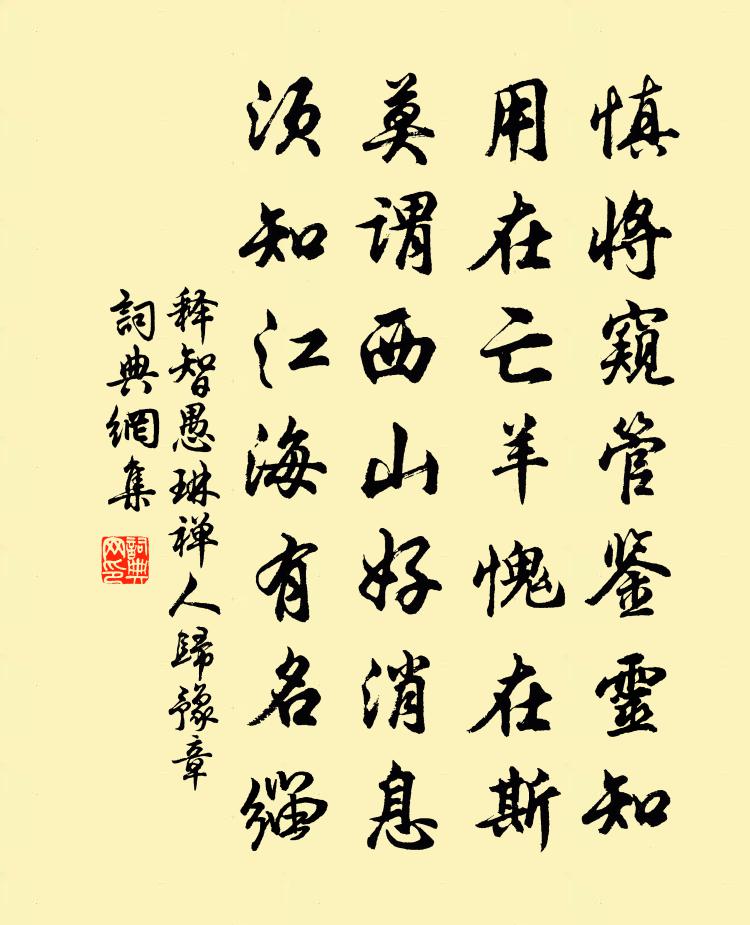 詩詞名句歷史字典書法欣賞書法字典國語詞典說文解字康熙字典古漢語字典標 題 作 者 詩 句 琳禪人歸豫章作者:釋智愚 朝代:宋代琳禪人歸豫章原文慎將窺管鑒靈知,用在亡羊愧在斯。莫謂西山好訊息,須知江海有名緇。詩詞問答問:琳禪人歸豫章的作者是誰?答:釋智愚問:琳禪人歸豫章寫於哪個朝代?答:宋代釋智愚琳禪人歸豫章書法欣賞琳禪人歸豫章書法作品詩詞推薦猛虎行劉宰〔宋代〕市有虎,毋妄言。當關虎士森戈鋋,市上一呼人駕肩。虎雖猛,那得前。市有虎,言非妄。君不見左馮諸邑天下壯和樂天南園試小樂劉禹錫〔唐代〕閒步南園煙雨晴,遙聞絲竹出牆聲。欲拋丹筆三川去,先教清商一部成。花木手栽偏有興,歌詞自作別生情。多才次謁茶假寐之句洪皓〔宋代〕僻陋雖無車馬喧,支頤時復抱愁眠。我思蝶夢為園吏,君繼雲封作地仙。茶碗捧來休怨後,詩壇喔罷敢爭先。形如次韻晁元忠西歸十首黃庭堅〔宋代〕我田失耕耘,歲暮拾枯萁。枯萁不可食,日晏抱長飢。猛虎依山林,眼有百步威。一從梁鴦食,風月何時歸。謁金門(慶彭教任滿)劉塤〔宋代〕花霧暖。紅逗海棠開半。氈坐談經春四換。今朝官正滿。好上鰲坡虎觀。好近御屏香案。休笑吾儂行色緩。待君來上李學士潘閬〔宋代〕名場欲獨立,一念一心寒。白日升天易,明時取仕難。家園半牢落,鬚髮漸衰殘。試把平生業,來投作者看。和欲雪二首梅堯臣〔宋代〕貂裘著不暖,牙帳曉初開。朔氣還先及,流風亦屢催。擬聞人詠絮,將見使傳梅。公復憂民畝,龍沙幾日來。四賢一不肖詩右余安道蔡襄〔宋代〕南方之強君子居,卓然安首襟韻孤。詞科判等屢得雋,呀然鼓焰天地罏。三年待詔處京邑,斗粟不足榮妻孥。耳聞再游越中,傷朱餘慶協律好直上人許渾〔唐代〕昔年湖上客,留訪雪山翁。王氏船猶在,蕭家寺已空。月高花有露,煙合水無風。處處多遺韻,何曾入剡中。山居陸游〔宋代〕平生杜宇最相知,遺我巢山一段奇。茶磑細香供隱几,松風幽韻入喔詩。溪邊拂石同兒釣,竹下開軒喚客棋。幾許奉寄旌德尉劉申之敖陶孫〔宋代〕諸劉兄弟賢,一一無可選。竹林銳頭郎,風味吾小阮。平生天機深,善閉得內楗。邇來卿何曹,不辨折腰本。稍傳孟子聖人人倫之至陳普〔宋代〕圓頭方腹一皆人,堯舜元非鳳與麟。道德文章光萬世,看來只是盡人倫。夏日山居魚玄機〔唐代〕移得仙居此地來,花叢自遍不曾栽。庭前亞樹張衣桁,坐上新泉泛酒杯。軒檻暗傳深竹徑,綺羅長擁亂書堆。閒乘湖飲得天字連文鳳〔宋代〕老來更上百花船,賴有湖光慰眼前。兵後山川仍戀土,壺中日月不行天。間身適意隨鷗鷺,樂事何心問管弦。盡醉水龍吟呂渭老〔宋代〕年年九月西湖,繡船繼日笙簫擁。五雲深處,紅簾一桁,語鶯歌鳳。群玉峰頭,影娥池畔,煙霞飛動。認蓬瀛仙子頌古三十一首釋玿〔宋代〕無直路,卻縈紆。趙州東壁上,依書掛葫蘆。有張公吃村酒,李公醉不醒。面南看北斗。和人七夕詩胡仔〔宋代〕乞巧筵開玉露秋,一鉤涼月掛西樓。人間百巧方無奈,寄語天孫好罷休。鄰叟言於石〔宋代〕客行歸故鄉,依依一鄰叟。把酒向我言,重嘆生不偶。大男年二十,前年方娶婦。府帖點鄉兵,井邑備攻守。萬騎偈頌二百零五首釋正覺〔宋代〕一枝秀出枬檀林,想見馨香慰眾心。不負老兄開鑿力,當風子和鶴鳴陰。廣福寺葉秀髮〔宋代〕細問黃山事,荒唐半不傅。諸峰幾林壑,十日九雲煙。笙斷空中籟,丹留潤底泉。相招婢猿鶴,何日謝塵緣。名句推薦郴江幸自繞郴山,為誰流下瀟湘去。秦觀《踏莎行·郴州旅舍》 黃鸝囀處誰同聽,白菊開時且剩過。司空圖《白菊雜書四首》 悔既往之失,亦要防將來之非。洪應明《菜根譚·概論》 綠楊煙外曉寒輕,紅杏枝頭春意鬧。宋祁《玉樓春·春景》 相識滿天下,知心能幾人?佚名《增廣賢文·上集》 月黑雁飛高,單于夜遁逃。盧綸《和張僕射塞下曲·其三》 秋到邊城角聲哀,烽火照高台。陸游《秋波媚·七月十六日晚登高興亭望長安南山》 快上西樓,怕天放、浮雲遮月。辛棄疾《滿江紅·中秋寄遠》 歸時休放燭光紅,待踏馬蹄清夜月。李煜《木蘭花·曉妝初了明肌雪》 吳王好劍客,百姓多創瘢;楚王好細腰,宮中多餓死。司馬光《資治通鑑·漢紀·漢紀三十八》