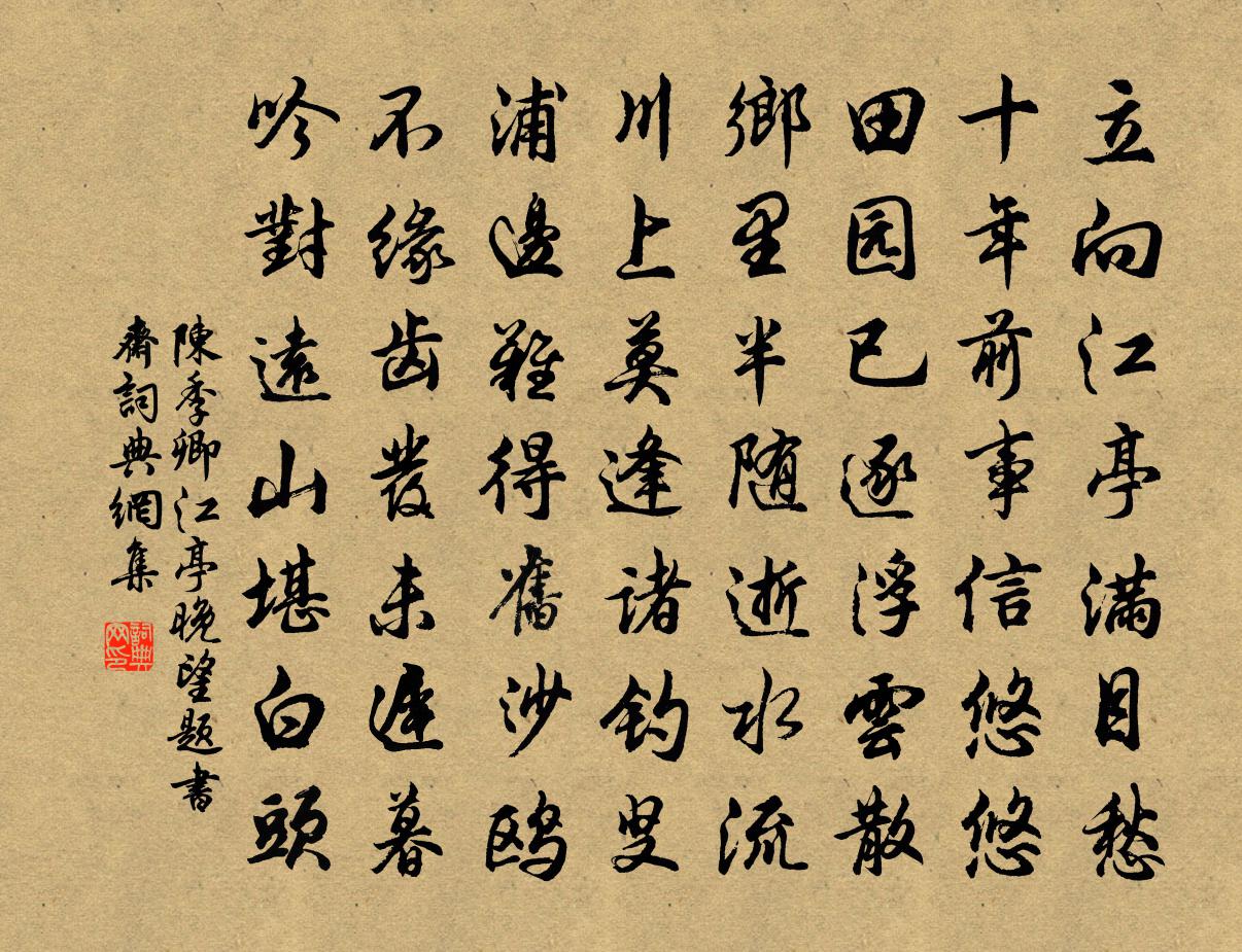 詩詞名句歷史字典書法欣賞書法字典國語詞典說文解字康熙字典古漢語字典標 題 作 者 詩 句 江亭晚望題書齋作者:陳季卿 朝代:唐代江亭晚望題書齋原文立向江亭滿目愁,十年前事信悠悠。田園已逐浮雲散,鄉里半隨逝水流。川上莫逢諸釣叟,浦邊難得舊沙鷗。不緣齒髮未遲暮,吟對遠山堪白頭。詩詞問答問:江亭晚望題書齋的作者是誰?答:陳季卿問:江亭晚望題書齋寫於哪個朝代?答:唐代問:江亭晚望題書齋是什麼體裁?答:七律陳季卿江亭晚望題書齋書法欣賞江亭晚望題書齋書法作品注釋全唐詩:卷868-23詩詞推薦醉中天王鼎〔元代〕彈破莊周夢,兩翅駕東風。三百座名園一采一個空,難道是風流孽種?唬殺尋芳的蜜蜂。輕輕扇動,把賣花人掮過己卯十二月二十日感事二首張耒〔宋代〕蹉跎流落已華顛,又見荊湖一歲遷。人怯苦寒愁日短,天收殘臘放新年。園林寂歷飄梅後,里巷經過爆竹前。自料雜興胡仲弓〔宋代〕佳花費事治,十無二三本。惡草時掃除,已復相苯{上艹下尊}。試嘗問園丁,否泰乃爾反。渠方倚鋤笑,謂我見江南憶同雲臣和蘧庵先生韻陳維崧〔清代〕江豚翻碧浪,憑高望極,折戟半沉沙。雞籠山下路,記得鳳城,數十萬人家。貂禪掩映,鐘山翠、疊鼓鳴笳。更參敬酬楊僕射山齋獨坐詩薛道衡〔隋代〕相望山河近。相思朝夕勞。龍門竹箭急。華岳蓮花高。岳高嶂重疊。鳥道風煙接。遙原樹若薺。遠水舟如葉。葉舟晚登橫溪閣陸游〔宋代〕樓鼓聲中日又斜,憑高愈覺在天涯。空桑客土生秋草,野渡虛舟集晚鴉。瘴霧不開連六詔,俚歌相答帶三巴。故鄉頌古十一首釋子益〔宋代〕地藏栽田博飯,大似飢過心荒。聽它三三兩兩,佛法浩浩商量。杓柄那知有短長。瓊花馬樗山〔宋代〕三月淮南鼓戰塵,無雙亭下隘遊人。此花不解興亡意,也向年年閧一春。偈頌十六首釋如淨〔宋代〕靈靈而時時昧,不得月隨流水。歷歷而處處混,不得雨逐行雲。玉屏峰汪士鋐〔清代〕玉屏峙霄漢,鳥道度松門。昨日登臨處,諸峰屐底存。雲生甘在下,嶂出爾何尊。極目無窮盡,空青抹一痕。句章甫〔宋代〕藉糟行萬里,醉死甘為戮。布穀周紫芝〔宋代〕田中水涓涓,布穀催種田。賊今在邑農在山。但願今年賊去早,春田處處無荒草;農夫呼婦出山來,深種春秧答飛方壺廖行之〔宋代〕閱世觚稜如許,照人冰玉淵然。個裡可藏天地,塵中自有神仙。滿路花/促拍滿路花歐陽修〔宋代〕銅荷融燭淚,金獸齧扉環。蘭堂春夜疑,惜更殘。落花風雨,向曉作輕寒。金龜朝早,香衾餘暖,殢嬌由自慵眠。桂隱紀詠檨蘋舟張鎡〔宋代〕玉立蜻蜓小,香欺漫港秋。百年清絕意,孤棹抵封侯。南山有高樹行贈李宗閔韓愈〔唐代〕南山有高樹,花葉何衰衰。上有鳳凰巢,鳳凰乳且棲。四旁多長枝,群鳥所託依。黃鵠據其高,眾鳥接其卑。不知秋桂史彌忠〔宋代〕庭前高挺碧玉樹,秋日奈茲風露何。兩度開花君莫問,為渠天近得香多。望江南李真人〔元代〕金花道,世上少人知。莫弄黑鉛將造化,淮南金秘在華池。爭肯泄天種植詩張嵲〔宋代〕魏塘草樹環佛宮,兩春不識花白紅。但有柳絮迷晴空,今年始種木芙蓉。間以寒菊助丰容,新栽黃葵已蒙茸。坐待次韻高子勉十首黃庭堅〔宋代〕君不居郎省,還應上諫坡。才高殊未識,歲晚喜無它。櫪馬羸難出,鄰雞凍不歌。寒爐余幾火,灰里撥陰何。名句推薦成事享其功,敗事委其過,且聖人弗能逾者,概人之本然也。來俊臣《羅織經·閱人卷第一》 水滿有時觀下鷺,草深無處不鳴蛙。陸游《幽居初夏》 隰桑有阿,其葉有幽。佚名《隰桑》 不求見面惟通謁,名紙朝來滿敝廬。文徵明《拜年》 我善養吾浩然之氣。孟子《孟子·公孫丑章句上·第二節》 長記海棠開後,正傷春時節李清照《好事近·風定落花深》 淥水淨素月,月明白鷺飛。李白《秋浦歌十七首》 跬步而不休,跛鱉千里;累土而不輟,丘山崇成。荀子《荀子·修身》 清秋幕府井梧寒,獨宿江城蠟炬殘。杜甫《宿府》 月過十五光明少,人到中年萬事休。佚名《增廣賢文·上集》