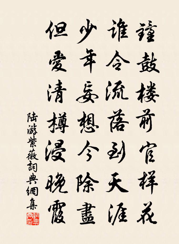 詩詞名句歷史字典書法欣賞書法字典國語詞典說文解字康熙字典古漢語字典標 題 作 者 詩 句 紫薇作者:陸游 朝代:宋代紫薇原文鐘鼓樓前官樣花,誰令流落到天涯?少年妄想今除盡,但愛清樽浸晚霞。詩詞問答問:紫薇的作者是誰?答:陸游問:紫薇寫於哪個朝代?答:宋代問:陸游的名句有哪些?答:陸游名句大全陸游紫薇書法欣賞紫薇書法作品詩詞推薦次韻審知見示梅花長句趙蕃〔宋代〕春入孤山今主誰,空留四海舊傳詩。平生我亦有成約,病起驟欣逢好枝。欲向園林窮勝處,不堪風雨苦淹時。忽來送僧游太白峰林寬〔唐代〕雲深游太白,莫惜遍探奇。頂上多靈跡,塵中少客知。懸崖倚凍瀑,飛狖過孤枝。出定更何事,相逢必有詩。早春寄景仁司馬光〔宋代〕疊石溪上春,茅茨卜築新。前言如不踐,山蟬又笑人。望江南/憶江南廖剛〔宋代〕蓬山曉,龜鶴倚芝庭。雲覆寶熏迷舞鳳,玉扶瓊液薦文星。棠蔭署風清。人盡道,天遣瑞昇平。九萬鵬程才振翼,虞美人(紅木犀)陳三聘〔宋代〕乾紅翦碎煩纖玉。相併黃金粟。漢宮素麵說明妃。馬上秋風應解、著燕支。黃昏小樹堪愁絕。不比梅花月。滿天風禪人並化主寫真求贊釋正覺〔宋代〕寒竹癯長,蒼松老剛。身心鐵石,肝膽冰霜。秋天湛湛遠連水,賓雁冥冥初沒行。卻來借伴,隨事成章。謝侃老惠蜜袁說友〔宋代〕釀花流蜜傍虛檐,乞我分甘要屬饜。剛被平生飽辛苦,自憐嚼蠟不知甜。題欒城第三集蘇泂〔宋代〕百金留一書,我心胡不喜。自朝至日暝,耽玩無窮已。復慚文未老,年既三十四。更後四十年,未必辦茲事。次長沙趙督相送惠首座韻釋師範〔宋代〕行腳親曾到地頭,固知不是等閒遊。歸時有問五峰信,為報龍淵已絕流。和韋開州盛山十二首流杯渠張籍〔唐代〕淥酒白螺杯,隨流去復回。似知人把處,各向面前來。早秋歸劉威〔唐代〕數口飄零身未回,夢魂遙斷越王台。家書欲寄雁飛遠,客恨正深秋又來。風解綠楊三署冷,月當銀漢四山開。茫茫張飛廟殷堯藩〔唐代〕威名垂萬古,勇力冠當時。回首三分國,何人賦黍離。移居齊己〔唐代〕上台言任養疏愚,乞與西城水滿湖。吹榻好風終日有,趁涼閒客片時無。檀欒翠擁清蟬在,菡萏紅殘白鳥孤。欲問□□長老住寧國光孝寺並題雪磯三絕劉克莊〔宋代〕占斷一房居,磯邊足釣徒。如何貪出世,亦典了西湖。雁李嶠〔唐代〕春暉滿朔方,歸雁發衡陽。望月驚弦影,排雲結陣行。往還倦南北,朝夕苦風霜。寄語能鳴侶,相隨入帝鄉。郊居秋晚五首趙蕃〔宋代〕松柏有正性,風霜無橫侵。南方異搖落,眾木共青森。曲士應懷悅,我曹嘗感心。詩成誰和者,弦絕未忘琴。覽古五首方回〔宋代〕賢者儻畏死,世論終不公。古若不置死,何藉誅妖凶。荊舒底奸鬼。廟食丘軻同。舉世知其非,囁嚅不敢攻。著書句張存〔宋代〕當時不葬曹橫墓,千古猶存方茂山。孤山詩二首釋智圓〔宋代〕峭拔湖心起,湖心四望通。盤根入巨浸,疊翠點寒空。勢迥侔蓬島,層危敵閬風。僧樓籠淡霧,雁塔礙飛鴻。曉井鄭侍郎送蠟梅次韻三首曾幾〔宋代〕小瓶梅映短檠燈,幽興何人似我能。枉沐歌詞無用處,維摩詰是在家僧。名句推薦秋容淺淡映重門,七節攢成雪滿盆。曹雪芹《詠白海棠》 親戚或余悲,他人亦已歌。陶淵明《擬輓歌辭三首》 貧者士之常也,死者人之終也,處常得終,當何憂哉?列子及其弟子《列子·天瑞》 一年最好,偏是重陽。吳文英《惜黃花慢·菊》 恭者不侮人,儉者不奪人。孟子《孟子·離婁章句上·第十六節》 理無常是,事無常非。列子及其弟子《列子·說符》 別裁偽體親風雅,轉益多師是汝師。杜甫《戲為六絕句》 險韻詩成,扶頭酒醒,別是閒滋味。李清照《念奴嬌·春情》 床空委清塵,室虛來悲風。潘安《悼亡詩三首》 寫不成書,只寄得、相思一點。張炎《解連環·孤雁》