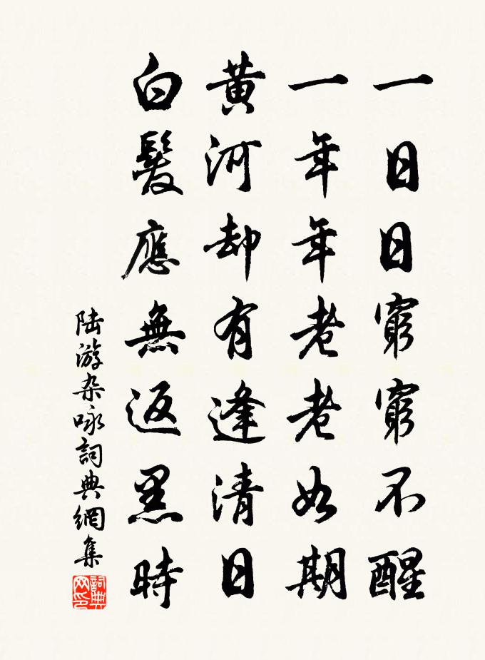 詩詞名句歷史字典書法欣賞書法字典國語詞典說文解字康熙字典古漢語字典標 題 作 者 詩 句 雜詠作者:陸游 朝代:宋代雜詠原文一日日窮窮不醒,一年年老老如期。黃河卻有逢清日,白髮應無返黑時。詩詞問答問:雜詠的作者是誰?答:陸游問:雜詠寫於哪個朝代?答:宋代問:陸游的名句有哪些?答:陸游名句大全陸游雜詠書法欣賞雜詠書法作品詩詞推薦木蘭花慢(為同年趙必達壽)黃機〔宋代〕亶文王前子,自不與、世人同。況地望既華,天資更偉,雲驥行空。年少才名蜚動,泛星槎、曾到廣寒宮。桂子香覺華山居三首仲並〔宋代〕舊雨無人到,非緣今不來。蔬盤春後足,經卷粥前開。燕語緣人去,禽聲逐夢回。勤披頻得句,隨量日持杯。荊州十首蘇軾〔宋代〕朱檻城東角,高王此望沙。江山非一國,烽火畏三巴。戰骨淪秋草,危樓倚斷霞。百年豪傑盡,擾擾見魚蝦。奉和淮南李相公早秋即事,寄成都武相公劉禹錫〔唐代〕八柱共承天,東西別隱然。遠夷爭慕化,真相故臨邊。並進夔龍位,仍齊龜鶴年。同心舟已濟,造膝璧常聯。對領烏程宰十三日往龍洞禱晴歸言見田家兩岸車水虞儔〔宋代〕慚愧田家趁好晴,鴉鴉兩岸水車鳴。畦丁露宿腰鐮健,饁婦泥行腳板輕。作苦僅能供伏臘,有年何處不昇平。只愁醉中賦別白玉蟾〔宋代〕話別應知太去匆,明朝馬首定東風。鏡中人瘦如花瘦,湖上春濃似酒濃。行色已如天色好,道情不與世情同。如今滿江紅 天台道中吳景奎〔元代〕翠逼籃輿,天台路、樹 * 際。襟袖冷、朔風初定,露華才墜。珠斗橫空孤嶂遠,金波搖月寒潭碎。問劉郎、採藥福州謠佚名〔唐代〕騎馬來,騎馬去。潼關使院懷王七季友岑參〔唐代〕王生今才子,時輩鹹所仰。何當見顏色,終日勞夢想。驅車到關下,欲往阻河廣。滿日徒春華,思君罷心賞。開門清暈閣在柳洲寺舊址二首張鎡〔宋代〕幽寺知何處,風鐘關遠撞。孤花明幾席,陰樹惜軒窗。喚渡輕舟競,窺人白鳥雙。寸心方自適,肯易利榮降。子用濟有遠行詩以貽之紫靜儀〔清代〕野雀從南來,翩翩思擇木。感此主人賢,飛鳴集其屋。 才地非獨優,處卑願已足。矧有嘉樹林,朝昏托棲宿。鷹雜詠一百首阿承女劉克莊〔宋代〕古人重言德,初不論傾城。切莫傷容鬢,猶堪嫁孔明。初秋戲作山居雜興俳體十二解楊萬里〔宋代〕暑入秋來午更強,風排兩遣曉差涼。如何遶砌千枝蕙,只是開門一陣香。高文父隱居葛紹體〔宋代〕岸西城郭岸南村,楊柳排空竹駐雲。不必青山映門巷,蘆花一帶水平分。題零陵石屏舒岳祥〔宋代〕大山插洪瀾,定是關仝筆。縑素不能永,壁石寫雄逸。治平丁未仲秋遊伊洛二川六日晚出洛城西門宿邵雍〔宋代〕向晚驅車出上陽,初程便宿水雲鄉。更聞數弄神仙曲,始信壺中日月長。朝天子張可久〔元代〕與誰,畫眉,猜破風流謎。銅駝巷裡玉驄嘶,夜半歸來醉,小意收拾,怪膽禁持,不識羞誰似你。自知理虧,燈下謝御賜紫金魚袋烏紗象簡冷應澂〔宋代〕日映罦罳曉殿深,君恩稠疊駕親臨。褒衣紅濯天機錦,束帶黃分風帑金。何幸清班容宦轍,自慚白髮點朝簪。撥亂酬幽居閒上人喜及第後見贈陳羽〔唐代〕九霄心在勞相問,四十年間豈足驚。風動自然雲出岫,高僧不用笑浮生。雲露堂前杏花范成大〔宋代〕蠟紅枝上粉紅雲,日麗煙濃看不真。浩蕩光風無畔岸,如何鎖得杏園春。名句推薦天下未有不學而成者也。王通《中說·卷六·禮樂篇》 譬猶練絲,染之藍則青,染之丹則赤。王充《論衡·卷二·率性篇》 睡起莞然成獨笑,數聲漁笛在滄浪。蔡確《夏日登車蓋亭》 霖雨泥我塗,流潦浩縱橫。曹植《贈白馬王彪·並序》 青綾被,莫憶金閨故步晁補之《摸魚兒·東皋寓居》 江山故宅空文藻,雲雨荒台豈夢思。杜甫《詠懷古蹟五首·其二》 枕中雲氣千峰近,床底松聲萬壑哀。曾公亮《宿甘露寺僧舍》 北極懷明主,南溟作逐臣。宋之問《途中寒食題黃梅臨江驛寄崔融》 為學無間斷,如流水行雲,日進而不已也。王永彬《圍爐夜話·第十四則》 鳳簫聲動,玉壺光轉,一夜魚龍舞。辛棄疾《青玉案·元夕》