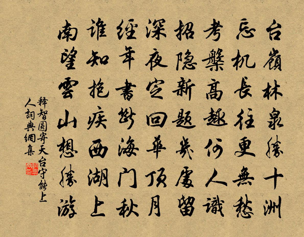 詩詞名句歷史字典書法欣賞書法字典國語詞典說文解字康熙字典古漢語字典標 題 作 者 詩 句 寄天台守能上人作者:釋智圓 朝代:宋代寄天台守能上人原文台嶺林泉勝十洲,忘機長往更無愁。考槃高趣何人識,招隱新題幾處留。深夜定回華頂月,經年書斷海門秋。誰知抱疾西湖上,南望雲山想勝游。詩詞問答問:寄天台守能上人的作者是誰?答:釋智圓問:寄天台守能上人寫於哪個朝代?答:宋代釋智圓寄天台守能上人書法欣賞寄天台守能上人書法作品詩詞推薦紹興庚午某與安成劉逢辰秋闈同薦逢辰四子伯周必大〔宋代〕鹿鳴舊籍晚重看,翰墨場中興久闌。同榜諸郎皆舉首,老夫安得不衰殘。亦好園海棠秋開紅英滿樹喻良能〔宋代〕微雲澹日映寒流,畫出西園一幅秋。白帝幻成紅玉蘂,金風吹綻碧枝頭。睡余艷艷真妃子,夢罷愔愔一解愁。熟賞陪馮使君游六首錦沙墩貫休〔唐代〕臨水登山興自奇,錦沙墩上最多時。雖雲發白孤峰好,其奈名清聖主知。草媚蓮塘資逸步,雲生松壑有新詩。悠然宛陵道院成用吳尚書韻王遂〔宋代〕傳街軋軋度車聲,夾道翩翩共雁行。色養正須夸獨樂,真廉何得似雙清。便當坐進傳吾道,何必求為身後名。大字感興六首賀鑄〔宋代〕青鵳噉雀雛,飫飽侮鳶烏。不知皂鵰力,拏殺北城狐。築城謠方回〔宋代〕從軍去築城,不如困長征。從軍去掘暫,不如鏖血戰。古今征戰立奇功,貂蟬多出兜鍪中。徒教力盡鍤與杵,主將金蓮出玉花 贈劉同監 拆刀字起馬鈺〔元代〕圭爛飲。後玄機宜再審。上田田。了真功得自然。中蓮綻。是為仙無失陷。了心休。繼海蟾的祖劉。夜窗書懷陳著〔宋代〕夜深萬籟平,危坐弗閉戶。不著沈麝香。一空清似許。竹涼露易零,鮮鮮正亭午。彈琴大小聲,鬼語雜風雨。琴罷自然仙井二首郭庭芝〔宋代〕仙翁去不還,石井煙霧白。誰難躡其蹤,勾漏良吾宅。題汪水雲詩卷祖惟和〔宋代〕北去南來策蹇驢,偶然過我古玄都。雖無千樹桃花賦,卻有三秋桂子圖。賀老掛冠方賜剡,張翰命駕已歸吳。酒邊大雨陸游〔宋代〕北窗欲化莊生蝶,睡思蒙蒙棲倦睫。川雲忽帶急雨來,萬點縱橫打荷葉。坐收爽氣入詩律,更借涼颸吹醉頰。壤檐秋思陸游〔宋代〕露濃壓架葡萄熟,日嫩登場罷亞香。商略人生如意事,及身強健得還鄉。蕃與斯遠季奕同生於十二月蕃初五日季奕初十趙蕃〔宋代〕徐子崖根竹,風雪不掩綠。鄭子谷中蘭,冰霜已騰馥。二子有此風,宜爾生窮冬。我獨何為者,飄然直轉蓬。衛恆往來貼贊岳珂〔宋代〕書既造妙,摹者惟欲取其肖。摹既逼真,題者不必托諸人。以實傳信,萬古一晉。無目睫之徇,視御府之印。八聲甘州元好問〔金代〕玉京岩、龍香海南來,霓裳月中傳。有六朝圖畫,朝朝瓊樹,步步金蓮。明滅重簾畫燭,幾處鎖嬋娟。塵暗秦王女句釋延壽〔宋代〕牛胎生象子,碧海起紅塵。竇僕射語佚名〔唐代〕竇僕射,前為韋氏國yQ,後作公主邑丞。雨不止和族叔韻陳文蔚〔宋代〕小齋容膝足遲回,世路羊腸不用猜。久矣此心冥進取,翩然何日賦歸來。新篘半熟瓮頭酒,小摘微黃葉底梅。盡日句徐似道〔宋代〕曉風洛浦凌波際,夜月江臯解佩時。早行述懷華岳〔宋代〕歸心夜半已飛揚,喚仆吹燈促曉妝。雞翅拍斜茅店月,馬蹄剜破板橋霜。二陵萬里埋荊棘,十廟百年生稻梁。安得名句推薦忽大風起,塵氣莽莽然,城市依稀而已。蒲松齡《山市》 睢睢而盱盱,而誰與居?大白若辱,盛德若不足。列子及其弟子《列子·黃帝》 莫笑農家臘酒渾,豐年留客足雞豚。陸游《游山西村》 風雨如晦,雞鳴不已。佚名《風雨》 君子養心莫善於誠荀子《荀子·不苟》 烹羊宰牛且為樂,會須一飲三百杯。李白《將進酒》 行人無限秋風思,隔水青山似故鄉。戴叔倫《題稚川山水》 風嗥雨嘯,昏見晨趨。鮑照《蕪城賦》 濁酒不銷憂國淚,救時應仗出群才。秋瑾《黃海舟中日人索句並見日俄戰爭地圖》 自知者不怨人,知命者不怨天;怨人者窮,怨天者無志。荀子《荀子·榮辱》