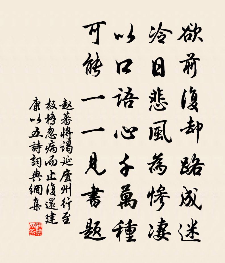 詩詞名句歷史字典書法欣賞書法字典國語詞典說文解字康熙字典古漢語字典標 題 作 者 詩 句 將謁延廬州行至板橋忽病而止復還建康以五詩作者:趙蕃 朝代:宋代原文欲前復卻路成迷,冷日悲風為慘淒。以口語心千萬種,可能一一見書題。詩詞問答問:《將謁延廬州行至板橋忽病而止復還建康以五詩》的作者是誰?答:趙蕃問:該詩寫於哪個朝代?答:宋代書法欣賞將謁延廬州行至板橋忽病而止復還建康以五詩書法作品詩文賞析【原題】:將謁延廬州行至板橋忽病而止復還建康以五詩寄之詩詞推薦浣溪沙史浩〔宋代〕勝概朱楹俯碧湖。蕭蕭風月一塵無。只堪綠蟻滿尊浮。況是小春天正爽,杖藜相與探梅初。半皴枝上未成珠。次韻周守游海棠溪張嵲〔宋代〕浣紗何處是,空翠隔崔嵬。嫩綠連山暗,妖紅照水開。惜春嗟婉娩,載酒約徘徊。莫怪胭脂濕,曾經夜雨來。和西外趙知宗劉克莊〔宋代〕斤妙斬如神,源深汲愈新。岱宗疑有趾,海若忽無津。傳遠須公等,鑽堅盡此身。平生師友意,非為雨中巾。夢得臥病,攜酒相尋,先以此寄白居易〔唐代〕病來知少客,誰可以為娛。日晏開門未,秋寒有酒無。自宜相慰問,何必待招呼。小疾無妨飲,還須挈一壺。水調歌頭吳潛〔宋代〕皎月亦長有,今夜獨娟娟。浮雲萬里收盡,人在水晶奩。矯首銀河澄澈,搔首金風浩蕩,毛髮亦冷然。宇宙能空闊題晉原舒太博清溪閣文同〔宋代〕危閣飛空羽翼開,下蟠波面影徘徊。光搖畫板月深淺,聲繞曲欄風往來。暝色四郊煙莽蒼,曉雲千嶂雪崔嵬。主人太平寺慈氏閣黃庭堅〔宋代〕青玻瓈盆插千岑,湘江水清無古今。何處拭目窮表里,太平飛閣暫登臨。朝陽不聞皂蓋下,愚溪但見古木陰。誰與三和項安世〔宋代〕某良士某良士,古之人古之人。名利坐中仇敵,詩書千載交親。題香山湯禪師舒坦〔宋代〕千古神僧舊石扃,清風如在地還靈。溪形偃月無窮碧,山氣當雲不改青。果熟猿猱時嘯聚,錫飛岩穴尚芳磬。西來菩薩蠻(詠足)蘇軾〔宋代〕塗香莫惜蓮承步。長愁羅襪凌波去。只見舞迥風。都無行處蹤。偷穿宮樣穩。並立雙趺困。纖妙說應難。須從掌上琴曲歌辭。蔡氏五弄。秋思司空圖〔唐代〕身病時亦危,逢秋多慟哭。風波一搖盪,天地幾翻覆。孤螢出荒池,落葉穿破屋。勢利長草草,何人訪幽獨。再至左顧亭用前韻二首袁說友〔宋代〕春入桃花水漲溪,薔薇隔屋粲成籬。湖山正為詩人好,早賦歸歟要抵龜。水調歌頭辛棄疾〔宋代〕千古花老蟾口,花雲洞插天開。漲痕當日何事,洶湧到崔嵬。攫土摶沙兒戲,翠谷蒼崖幾變,風雨化人來。萬里須自作真贊邵雍〔宋代〕松桂操行,鶯花文才。江山氣度,風月情懷。借爾面貌,假爾形骸。弄丸餘暇,閒往閒來。踏歌行陳去疾〔唐代〕鴛鴦樓下萬花新,翡翠宮前百戲陳。夭矯翔龍銜火樹,飛來瑞鳳散芳春。仙蹕初傳紫禁香,瑞雲開處夜花芳。繁弦贈畫士劉信可二首謝枋得〔宋代〕毛潁摧鋒入墨池,白雲窗下展烏絲。乘君袖裡孤山月,寫盡橫斜竹外枝。鹿門夏日皮日休〔唐代〕滿院松桂陰,日午卻不知。山人睡一覺,庭鵲立未移。出檐趁雲去,忘戴白接冪。書眼若薄霧,酒腸如漏卮。身外頌一百則釋重顯〔宋代〕麈中麈,君看取。下一箭,走三步。五步若活,成群趁虎,正眼從來付獵人。江神子蘇軾〔宋代〕乃作斜川詩,至今使人想見其處。元豐壬戍之春,余躬耕於東坡,築雪堂居之。南挹四望亭之後丘,西控北山之微初夏六首方回〔宋代〕梅熟琵琶肥,山寒更衲衣。爨童鋤菜去,飢雀入廚飛。湖海歸來晚,親朋亂後稀。可容無定力,事事與心違。名句推薦寥落古行宮,宮花寂寞紅。元稹《行宮》 月過十五光明少,人到中年萬事休。佚名《增廣賢文·上集》 仍憐故鄉水,萬里送行舟。李白《渡荊門送別》 伯牙鼓琴,志在高山佚名《伯牙鼓琴/伯牙絕弦》 今夜不知何處宿,平沙萬里絕人煙。岑參《磧中作》 梅花散彩向空山,雪花隨意穿簾幕。王旭《踏莎行·雪中看梅花》 大道廢,有仁義;智慧出,有大偽;六親不和,有孝慈;國家昏亂,有忠臣。老子《老子·道經·第十八章》 簌簌衣巾落棗花,村南村北響繅車,牛衣古柳賣黃瓜。蘇軾《浣溪沙·簌簌衣巾落棗花》 迢迢新秋夕,亭亭月將圓。陶淵明《戊申歲六月中遇火》 禍不妄至,福不徒來。司馬遷《史記·龜策列傳》