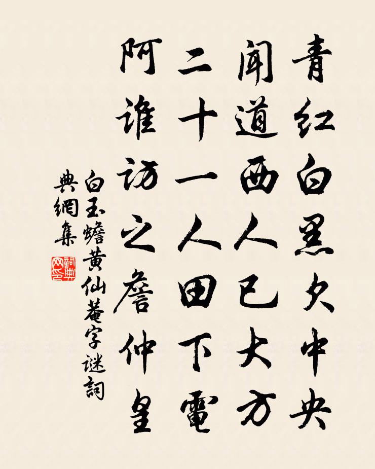 詩詞名句歷史字典書法欣賞書法字典國語詞典說文解字康熙字典古漢語字典標 題 作 者 詩 句 黃仙菴字謎作者:白玉蟾 朝代:宋代黃仙菴字謎原文青紅白黑欠中央,聞道西人已大方。二十一人田下電,阿誰訪之詹仲皇。詩詞問答問:黃仙菴字謎的作者是誰?答:白玉蟾問:黃仙菴字謎寫於哪個朝代?答:宋代問:黃仙菴字謎是什麼體裁?答:七絕白玉蟾黃仙菴字謎書法欣賞黃仙菴字謎書法作品詩詞推薦曾宏甫見過因問訊鞓紅花則雲已落矣驚呼之餘曾幾〔宋代〕茶山老子竟成痴,謾說尋芳去不遲。浪蕊飄殘猶自可,名花落盡不曾知。同楊方叔游開寶上方有懷裡中二三故人韓維〔宋代〕京都寡臨觀,茲地高且明。仲科一來望,曠然寫予情。千載豪傑盡,夷門荊棘生。時平盛民物,華屋連飛甍。長煙朝中措王玉〔宋代〕楊花繞晝暖風多。晴雲點池波。戲數翠萍幾靨,零星未礙圓荷。軟人天氣,半如溽暑,半似清和。說與香篝緼火,童謠佚名〔先秦〕阿房阿房亡始皇。紀事仇遠〔宋代〕圩田平沒石田枯,秋暑如蒸雨竟無。六十年前曾記得,步行一直過西湖。止酒楊萬里〔宋代〕止酒先立約,庶幾守得堅。自約復自守,事亦未必然。約語未出口,意已慘不驩。平生死愛酒,愛酒寧棄官。億昔晚過鄰幾官舍三首韓維〔宋代〕蕭灑君官舍,從來可數來。養蓮疏濁水,薙草出荒台。芡散初成籍,蒲長欲映杯。吾知蔣生逕,不為俗人開。記夢三首楊萬里〔宋代〕霧外知何寺,鍾聲只隔山。望來無里許,還在九霄間。書仇遠吟卷後釋文珦〔宋代〕昔在英豀識仇遠,憶意別來陵谷變。死生契闊不相知,一十四年如過電。蓮花峰下得重逢,老色駸駸驚上面。袖出古樂府白紵四時歌黃庭堅〔宋代〕北風降霜松柏雕,天形慘澹光景銷。山河夜半失故處,何地藏舟無動搖。少年志願不成就,故年主人且恩舊。及河傷賈島張蠙〔唐代〕生為明代苦吟身,死作長江一逐臣。可是當時少知已,不知知己是何人。和王倅見惠十篇曹勛〔宋代〕有琴寫流水,無言道情素。水寒江海深,川闊牛羊暮。倒指三十年,猶記潮陽路。西江月翁元龍〔宋代〕山色低銜小苑,春雲暗宿空庭。鞦韆無月冷雙繩。閒卻畫欄人靜。一夜海棠如夢,半窗銀燭多情。好花留不到清明沖嗇書事曹勛〔宋代〕山居終日不開門,室有南窗氣自溫。人籟暫休天籟息,月華將冷照黃昏。衛州東湖項安世〔宋代〕自笑知州百不知,近他池館未曾窺。主人正可今為客,和議初成恰是時。草色茸茸花覆座,波光灩艷酒浮卮。留連和令公問劉賓客歸來稱意無之作白居易〔唐代〕水南秋一半,風景未蕭條。皂蓋回沙苑,籃輿上洛橋。閒嘗 * 酒,醉唱紫芝謠。稱意那勞問,請錢不早朝。送福帥吳侍郎趨朝釋善珍〔宋代〕恕齋視民猶視兒,先憂兩字寒與飢。三冬氣和春有腳,旱歲箋天天雨粟。愛杜呼母宗呼爺,史書弄筆人傳夸。異類愁倚闌令·花陰月晏幾道〔宋代〕花陰月,柳梢鶯。近清明。長恨去年今夜雨,灑離亭。 枕上懷遠詩成。紅箋紙、小砑吳綾。寄與征人教念遠,莫謝惠竹萌錢積善〔宋代〕新挑筍苗喜登盤,減卻南階竹几竿。已為枯禪參玉版,暫停排日報平安。好事近·七月十三日夜登萬花川谷望月作楊萬里〔宋代〕月未到誠齋,先到萬花川谷。不是誠齋無月,隔一林修竹。如今才是十三夜,月色已如玉。未是秋光奇絕,看十五名句推薦斜風細雨作春寒。對尊前。朱淑真《江城子·賞春》 楓落河梁野水秋。淡煙衰草接郊丘。蘇庠《鷓鴣天·楓落河梁野水秋》 不 愛其親,豈能及物?姚思廉《陳書·列傳·卷十三》 謾道愁須殢酒,酒未醒、愁已先回秦觀《滿庭芳·碧水驚秋》 至今窺牧馬,不敢過臨洮。西鄙人《哥舒歌》 江上往來人,但愛鱸魚美范仲淹《江上漁者》 占得杏梁安穩處,體輕唯有主人憐,堪羨好因緣。牛嶠《憶江南·銜泥燕》 忽然一夜清香發,散作乾坤萬里春。王冕《白梅》 假令風歇時下來,猶能簸卻滄溟水李白《上李邕》 行人無限秋風思,隔水青山似故鄉。戴叔倫《題稚川山水》
