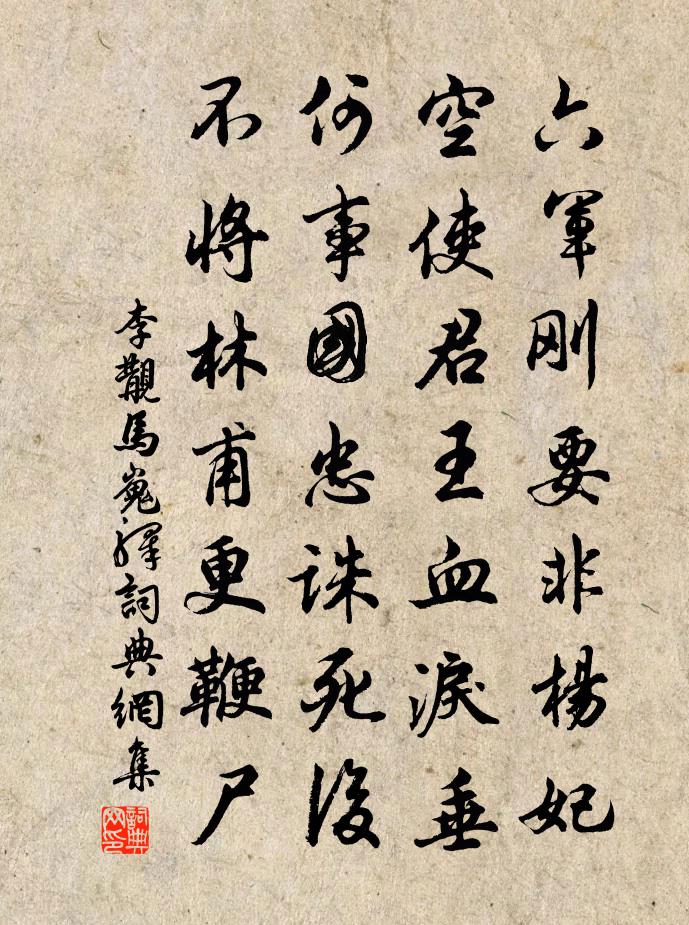 詩詞名句歷史字典書法欣賞書法字典國語詞典說文解字康熙字典古漢語字典標 題 作 者 詩 句 馬嵬驛作者:李覯 朝代:宋代馬嵬驛原文六軍剛要非楊妃,空使君王血淚垂。何事國忠誅死後,不將林甫更鞭屍。詩詞問答問:馬嵬驛的作者是誰?答:李覯問:馬嵬驛寫於哪個朝代?答:宋代李覯馬嵬驛書法欣賞馬嵬驛書法作品詩詞推薦曉發富陽縣方回〔宋代〕長山礲石片帆斜,小雨初晴日眩沙。回首遙看富陽縣,青煙低罩一叢花。醜奴兒慢春日黃景仁〔清代〕日日登樓,一日換一番春色,者似卷如流春日,誰道遲遲?一片野風吹草,草背白煙飛。頹牆左側,小桃放了,沒答貢甫酌騏驥池上見詒韓維〔宋代〕金行戰陽暑未北,炎郁填胸汗流液。空堂大祖不可度,欲取清風自湔滌。耽耽華廄列官守,對起二亭嚴案席。天渠又賦雙蓮岳珂〔宋代〕一舸歸來喜未涯,天教奇產瑞吾家。交枝各倚青羅蓋,並蒂俱酣紅玉葩。湘女月裳疑共浴,越姬風袂憶同車。人生秋日與知言學士釋永頤〔宋代〕水落小山浮,山人上下游。月岩煙桂晚,風浦石蘭秋。食芰漁溪宿,烹葵野館留。肩吾相對坐,清話不知休。春歸孟淑卿〔宋代〕落盡棠梨水拍堤,淒淒芳草望中迷。無情最是枝頭鳥,不管人愁只顧啼。栩菴以冰字韻求大風詩口占白玉蟾〔宋代〕山高萬籟作秋聲,六月胡床冷似冰。浩浩拍窗人不寐,颼颼到枕夢難成。掀開雲幕飛蒼絮,推出蟾輪碾素璚。幸有古陵橋徐璣〔宋代〕西橋西岸柳成絲,春去春來歲歲同。偶被東風吹落絮,又隨流水過橋東。新津道中范成大〔宋代〕雨後郊原淨,村村各好音。宿雲浮竹色,清溜走榿陰。曲沼擎青蓋,新畦藝綠針。江天空闊處,不受暑光侵。南鄉子蔡伸〔宋代〕因為此詞木落雁南翔。錦鯉殷勤為渡江。淚墨銀鉤相憶字,成行。滴損雲箋小鳳皇。陳事費思量。回首煙波卷夕陽失調名佚名〔宋代〕插黃花、對尊前,且看茱萸好。二郎神王哲〔元代〕觀塵境盡。總把浮名修整。此假合形骸皆不悟,猶然待、巧妝馳騁。百歲韶華能有幾,到七十、難逃逝景。*裡面登絳州富公嵩巫亭示同行者歐陽修〔宋代〕群峰擁軒檻,竹樹陰漠漠。公胡苦思山,規構自心作。惟予愛山者,初仕即京洛。嵩峰三十六,終日對高閣。陰晴雨後獨行洛北歐陽修〔宋代〕北關望南山,明嵐雜紫煙。歸雲向嵩嶺,殘雨過伊川。樹繞芳堤外,橋橫落照前。依依半荒苑,行處獨聞蟬。小重山(方元相生日)周紫芝〔宋代〕碧玉山圍十里湖。水雲天共遠,戲雙鳧。河陽花縣錦屏鋪。人不老,長日在蓬壺。一笑且踟躕。會騎箕尾去,上雲雜題陸游〔宋代〕莫笑花前白髮新,宣和人醉慶元春。何時道路平如砥?卻就清伊整幅巾。放榜日徐夤〔唐代〕喧喧車馬欲朝天,人探東堂榜已懸。萬里便隨金,三台仍借玉連錢。花浮酒影彤霞爛,日照衫光瑞色鮮。十二街前送鄭說之歙州謁薛侍郎劉長卿〔唐代〕漂泊來千里,謳謠滿百城。漢家尊太守,魯國重諸生。俗變人難理,江傳水至清。船經危石住,路入亂山行。老得戀繡衾蕭崱〔宋代〕倚闌閒看燕定巢。舊彈箏、因病久拋。畫不盡、殘眉黛,被東風、吹在柳梢。曉來暗理傷春曲,把金釵、枕畔細敲宜興山房十首李曾伯〔宋代〕檐影亭亭日正中,莓苔不掃絕塵蹤。閉門相共 * 坐,看讀華嚴一卷終。名句推薦風蒲獵獵小池塘。過雨荷花滿院香。李重元《憶王孫·夏詞》 青山霽後雲猶在,畫出東南四五峰。郎士元《柏林寺南望》 日射紗窗風撼扉,香羅拭手春事違。李商隱《日射》 更吹羌笛關山月,無那金閨萬里愁王昌齡《從軍行七首》 烏絲闌紙嬌紅篆,歷歷春星。納蘭性德《紅窗月·燕歸花謝》 華而不實,恥也。左丘明《國語·晉語·秦伯享重耳以國君之禮》 江上春山遠,山下暮雲長。葛長庚《水調歌頭·江上春山遠》 平岡細草鳴黃犢,斜日寒林點暮鴉。辛棄疾《鷓鴣天·陌上柔桑破嫩芽》 憐君片雲思,一棹去瀟湘。杜牧《送薛種游湖南》 去年射虎南山秋,夜歸急雪滿貂裘。陸游《三月十七日夜醉中作》