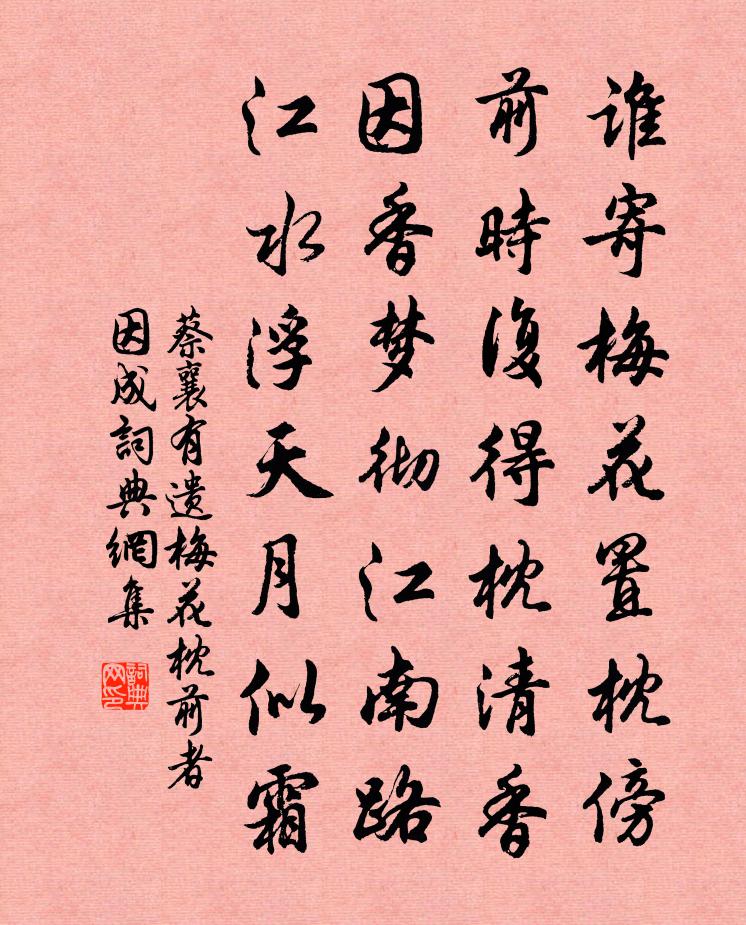 詩詞名句歷史字典書法欣賞書法字典國語詞典說文解字康熙字典古漢語字典標 題 作 者 詩 句 有遺梅花枕前者因成作者:蔡襄 朝代:宋代有遺梅花枕前者因成原文誰寄梅花置枕傍,前時復得枕清香。因香夢徹江南路,江水浮天月似霜。詩詞問答問:有遺梅花枕前者因成的作者是誰?答:蔡襄問:有遺梅花枕前者因成寫於哪個朝代?答:宋代蔡襄有遺梅花枕前者因成書法欣賞有遺梅花枕前者因成書法作品詩詞推薦古謠王建〔唐代〕一東一西壟頭水,一聚一散天邊霞。一來一去道上客,一顛一倒池中麻。題水仙趙孟堅〔宋代〕自欣分得櫧山邑,地近錢塘易買花。堆案文書雖鞅掌,簪瓶金玉且奢華。酒邊已愛香風度,燭下獨憐舞影斜。礬弟策杖尋隱士王績〔唐代〕策杖尋隱士,行行路漸賒。石樑橫澗斷,土室映山斜。孝然縱有舍,威輦遂無家。置酒燒枯葉,披書坐落花。新垂後漢門光武周曇〔唐代〕成敗非儒孰可量,儒生何指指蕭王。蕭王得眾能寬裕,吳漢歸來帝業昌。答澈公韋丹〔唐代〕空山泉落松窗靜,閒地草生春日遲。白髮漸多身未退,依依常在永禪師。句釋曉瑩〔宋代〕斷嶺雲歸白。利名吟邵雍〔宋代〕利名都不到胸中,由此胸中氣自沖。既愛且憎皆是病,靈台何日得從容。和裴校書鷺鷥飛元稹〔唐代〕鷺鷥鷺鷥何遽飛,鴉驚雀噪難久依。清江見底草堂在,一點白光終不歸。和錢處和大資四首曹勛〔宋代〕五峰懶瓚笑顏開,正欲乘閒特特來。十里松風一鞭穩,虎溪捉手亦奇哉。范二員外邈、吳十侍御郁特枉駕闕展待,聊寄此杜甫〔唐代〕暫往比鄰去,空聞二妙歸。幽棲誠簡略,衰白已光輝。野外貧家遠,村中好客稀。論文或不愧,肯重款柴扉。題仙居縣南峰郭明甫〔宋代〕山光竹影交寒輝,下有碧清吹漣漪。沙痕隱隱白鳥去,石聲鑿鑿扁舟歸。蕙蘭發香禪味遠,雲霧吐秀人家稀。須知感皇恩(庚申為大兒壽)丘崈〔宋代〕時節近中秋,桂花天氣。憶得熊羆夢呈瑞。向來三度,恨被一官縈系。今朝稱壽,也休辭醉。斑衣戲彩,薄羅初試水仙子佚名〔宋代〕浮家泛宅生涯好。聚米堆鹽多積寶。煙波得趣樂江湖,宜乘興,尋安道。不負軒轅當日造。初度喜逢維夏早。孔釋和許表民湔江驛四題李新〔宋代〕吹來槐莢細,過去杜鵑悲。慣客久無念,送春閒有詩。奉使巡檢兩京路種果樹事畢入秦因詠鄭審〔唐代〕聖德周天壤,韶華滿帝畿。九重承渙汗,千里樹芳菲。陝塞餘陰薄,關河舊色微。發生和氣動,封植眾心歸。春露和并州劉密學見寄魏野〔宋代〕還如裴度鎮河東。百萬軍民畏愛中。鐘鼓久喧刁斗靜,旌幢一指鴈門空。瀟湘故友參時務,燕趙佳人接士風。密地寄友人文同〔宋代〕惟秦抵於蜀,間可歷萬{左血右戲}。遙懷向英義,潛想一夕馳。乏人探道奧,求合常苦奇。見謂可招納,欲與相送直閣杜君章守齊晁補之〔宋代〕杜公文史不讀律,平反世稱徐有功。官為列卿位亦顯,皋陶事與禮樂同。書生骫骳笑法令,弦歌不媿陵陂中。眾賢發陶莊卻寄刁經臣裴如晦梅堯臣〔宋代〕方看梅柳春,共別川河上。移舟人已歸,回首竹林望。水渾不照影,山遠猶相向。聞道欲西遊,漢家今尚壯。雨曉方回〔宋代〕春空蒸小雨,漠漠復紛紛。枯石皆生水,平田亦出雲。氣溫衾暗覺,聲細枕微聞。今日迎人馬,西郊草欲薰。名句推薦荒煙涼雨助人悲,淚染衣襟不自知。王安石《送和甫至龍安微雨》 宿草春風又,新阡去歲無。楊萬里《寒食上冢》 雲邊雁斷胡天月,隴上羊歸塞草煙。溫庭筠《蘇武廟》 君看獲稻時,粒粒脂膏香。黃燮清《秋日田家雜詠》 兄弟叔侄,須分多潤寡;長幼內外,宜法肅辭嚴。朱柏廬《朱子家訓·全文》 花光濃爛柳輕明,酌酒花前送我行。歐陽修《別滁》 甘居人下者鮮。御之失謀,非犯,則篡耳。來俊臣《羅織經·治下卷第三》 低頭獨長嘆,此嘆無人喻。白居易《買花 / 牡丹》 上者驕,安其心以順。來俊臣《羅織經·事上卷第二》 不近人情,舉世皆畏途;不察物情,一生俱夢境。陳繼儒《小窗幽記·集醒篇》