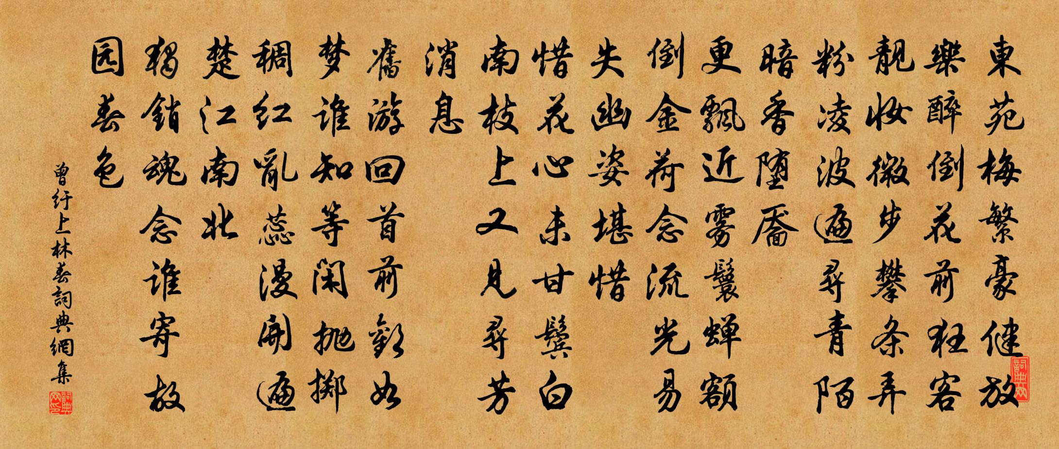 詩詞名句歷史字典書法欣賞書法字典國語詞典說文解字康熙字典古漢語字典標 題 作 者 詩 句 上林春/一落縈作者:曾紆 朝代:宋代上林春/一落縈原文東苑梅繁,豪健放樂,醉倒花前狂客。靚妝微步,攀條弄粉,凌波遍尋青陌。暗香墮靨。更飄近、霧鬟蟬額。倒金荷、念流光易失,幽姿堪惜。惜花心、未甘鬢白。南枝上、又見尋芳訊息。舊遊回首,前歡如夢,誰知等閒拋擲。稠紅亂蕊,漫開遍、楚江南北。獨銷魂,念誰寄、故園春色。詩詞問答問:上林春/一落縈的作者是誰?答:曾紆問:上林春/一落縈寫於哪個朝代?答:宋代問:上林春/一落縈是什麼體裁?答:詞曾紆上林春/一落縈書法欣賞上林春/一落縈書法作品詩詞推薦頌古六首釋鹹傑〔宋代〕一橈劈腦沒遮攔,大海波濤徹底乾。盡謂單傳並直指,誰知總被祖師謾。都門送許棠東歸(一作送進士張喬)曹松〔唐代〕舊客東歸遠,長安詩少朋。去愁分磧雁,行計逐鄉僧。華岳無時雪,黃河漫處冰。知辭國門路,片席認西陵。樂游曲閩後陳氏〔唐代〕龍舟搖曳東復東,採蓮湖上紅更紅。波淡淡,水溶溶,奴隔荷花路不通。西湖南湖鬥彩舟,青蒲紫蓼滿中洲。波渺禹跡寺南有沈氏小園四十年前嘗題小闋壁間偶陸游〔宋代〕楓葉初丹槲葉黃,河陽愁鬢怯新霜。林亭感舊空回首,泉路憑誰說斷腸!壞壁醉題塵漠漠,斷雲幽夢事茫茫。年來金剛隨機無盡頌淨心行善分第二十三釋印肅〔宋代〕春池夜長萍,浮生豈暫停。解說千古事,到老也無成。舟行用前韻懷祝子權仲並〔宋代〕楊枝巧作腰支弱,不分小桃紅入萼。風光向人但嫵媚,客子那知行路惡。短篷蕩漾晴波裹,取次茶深酒薄薄。所思至端州驛見杜五審言沈三佺期閻五朝隱王二無競題壁慨然宋之問〔唐代〕逐臣北地承嚴譴,謂到南中每相見。豈意南中岐路多,千山萬水分鄉縣。雲搖雨散各翻飛,海闊天長音信稀。處處水調歌頭(濠州觀魚台作)葉夢得〔宋代〕渺渺楚天闊,秋水去無窮。兩淮不辨牛馬,輕浪舞迴風。獨倚高台一笑,圉圉游魚來往,還戲此波中。危欄對千里偈頌九首釋玿〔宋代〕休卜度,世間那有揚州鶴。一身與世等委蛇,萬事隨緣即安樂。無意來時卻宛然,有心用處還應錯。錯錯錯,莫莫送陳守子華宿土囊有感陳宓〔宋代〕三年抱恙多閉門,只得兩度敲禪扃。道人問我緣底出,為送鄉城兩史君。闤中暑濕如炊甑,山寺陰涼百僧定。往年再游九溪周文璞〔宋代〕昔年九溪十八澗,今度見之逾清真。靜依落落石路晚,閒繞寂寂山家春。可憐潺湲似留客,更覺曲折能隨人。得得腰痛劉克莊〔宋代〕偶得休文病,行遲臥不安。益綿身尚怯,加劑脈猶寒。扶出看山易,驅教立雪難。邊頭方募士,自愧已衰殘。奉簡欽止兼憶斯遠趙蕃〔宋代〕阿連聞說有歸期,準擬俱來賦此詩。已是欲行還小住,縱令頻合故傷離。卜運算元 妙覺寺僧索王哲〔元代〕妙覺證慈悲,便入菩提路。日日常開方便門,慧照生靈炷。坐雪釋迦尊,面壁達摩悟。觀此因緣行果成,兜率天堂虞美人姜夔〔宋代〕摩挲紫蓋峰頭石。上瞰蒼崖立。玉盤搖動半崖花。花樹扶蔬、一半白雲遮。盈盈相望無由摘。惆悵歸來屐。而今仙三月十一日大閱偶作三絕句晁說之〔宋代〕縣官未肯斬西戎,誰信鄜州第一功。馬似雲頹青壁上,人如猿放曉林中。和陳推官見贈魏野〔宋代〕白髮朱衣好寫真,鵷行佐幕異常倫。勘書幾見招閒客,斷案常思出罪人。棠樹政聲僧說遠,蘇台實錄世傳新。仍知青玉案(春暮)趙長卿〔宋代〕天涯目斷江南路。見芳草、迷風絮。綠暗花梢春幾許。小桃寂寞,海棠零亂,飛盡胭脂雨。子規聲里山城暮。月掛上郡南三十里有相思亭在太山之麓二水所交平司馬光〔宋代〕塞下春寒在,東風雪滿須。河陽機上婦,知我苦辛玩。夕次桐廬張祜〔唐代〕百里清溪口,扁舟此去過。晚潮風勢急,寒葉雨聲多。戍出山頭鼓,樵通竹里歌。不堪無酒夜,回首夢煙波。名句推薦豆雨聲來,中間夾帶風聲。蔣捷《聲聲慢·秋聲》 荊溪白石出,天寒紅葉稀。王維《山中》 煙籠寒水月籠沙,夜泊秦淮近酒家。杜牧《泊秦淮》 春去花還在,人來鳥不驚。王維《畫》 風嗥雨嘯,昏見晨趨。鮑照《蕪城賦》 孤燈寒照雨,濕竹暗浮煙。司空曙《雲陽館與韓紳宿別》 半生已分孤眠過,山枕檀痕涴。納蘭性德《虞美人·曲闌深處重相見》 只知逐勝忽忘寒,小立春風夕照間。楊萬里《最愛東山晴後雪》 兩人對酌山花開,一杯一杯復一杯。李白《山中與幽人對酌》 為學無間斷,如流水行雲,日進而不已也。王永彬《圍爐夜話·第十四則》