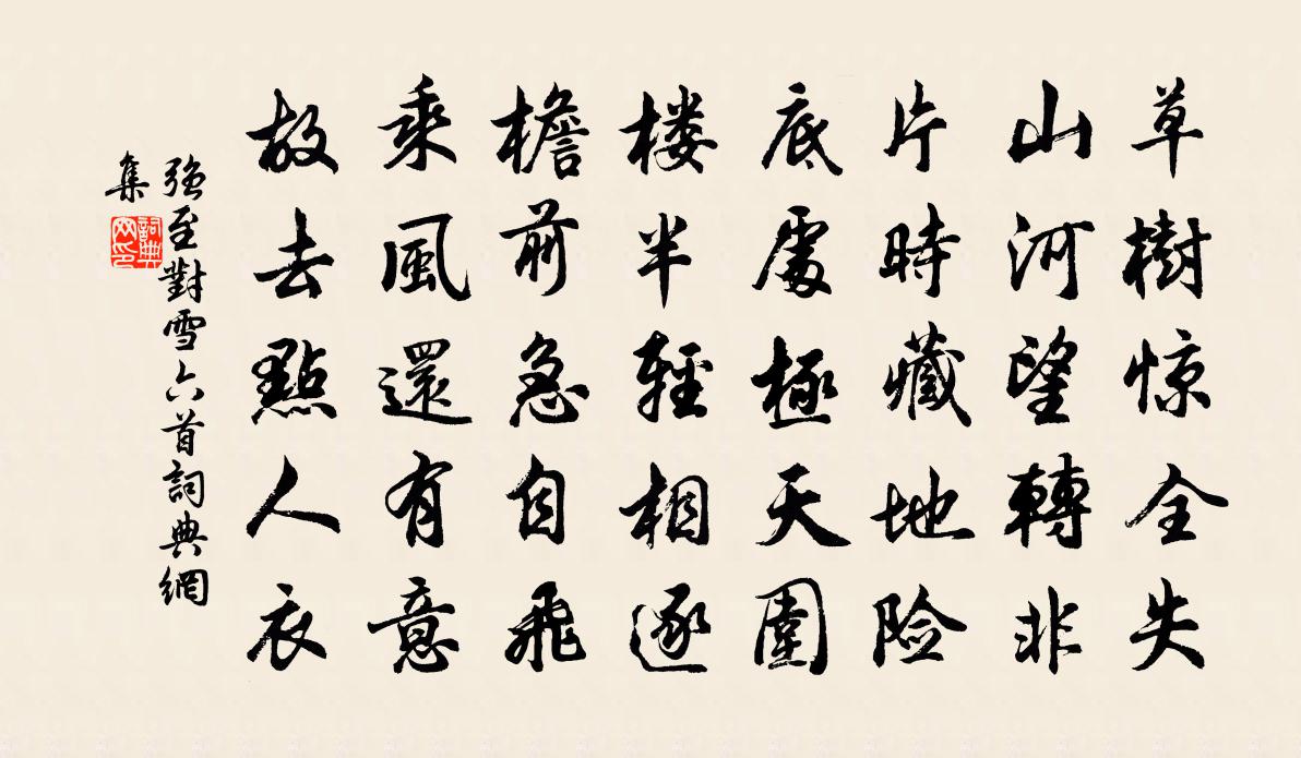 詩詞名句歷史字典書法欣賞書法字典國語詞典說文解字康熙字典古漢語字典標 題 作 者 詩 句 對雪六首作者:強至 朝代:宋代對雪六首原文草樹驚全失,山河望轉非。片時藏地險,底處極天圍。樓半輕相逐,檐前急自飛。乘風還有意,故去點人衣。詩詞問答問:對雪六首的作者是誰?答:強至問:對雪六首寫於哪個朝代?答:宋代強至對雪六首書法欣賞對雪六首書法作品詩詞推薦暑夜泛舟陸游〔宋代〕暑氣方然一鼎湯,聊呼艇子夜追涼。微風忽起髮根冷,闕月初升林影長。漸近場中聞笑語,卻從堤外看帆檣。超然蜀僧明操思歸書龍丘子壁蘇軾〔宋代〕久厭勞生能幾日,莫將歸思擾衰年。片雲會得無心否,南北東西只一天。晚坐同楊文叔賦韓維〔宋代〕浮雲忽已沒,仰視天正碧。涼風落我庭,燕子飛不息。門無車馬賓,巾屨得自適。顧慚無所為,樂此朝與夕。鷓鴣天劉學箕〔宋代〕山色都如歸興濃。春融融處客匆匆。岸花影里鶯吟霧,江閣陰中燕受風。憑畫楯,睇層空。情衷待說幾時同。不如洞仙歌 超化蘸碧軒得欽叔書,有相調之語,元好問〔金代〕青錢白璧,自買愁腸繞。更恨歡狂負年少。記陽關圖上,尊酒流連,兒女淚,輸與閒人坐釣。茂陵多病後,懶盡琴追和常建嘆王昭君徐夤〔唐代〕紅顏如朔雪,日爍忽成空。淚盡黃雲雨,塵消白草風。君心爭不悔,恨思竟何窮。願化南飛燕,年年入漢宮。道中即事姚勉〔宋代〕蕎麥花開如雪鋪,新霜寒早半欲枯。故山今年熟此否,讀書夜飢需餅爐。和三賢堂詩家之巽〔宋代〕誰稱三老作三山,夫子寧居季孟間。駱廄侍人多媿色,鱉頭處士若為攀。辭草小技應閒事,節義千年真大閒。何似安樂窩中看雪邵雍〔宋代〕同雲漠漠雪霏霏,安樂窩中臥看時。初訝後園羅玉樹,卻驚平地璨瑤池。未逢寒食棃花謝,不待春風柳絮飛。酒放題道夫東征錄釋寶曇〔宋代〕老來氣味覺深穩,餘子但知聲擊撞。煙雲合千態萬狀,意氣吞五湖三江。如聞日觀眇天下,俯視坎井非吾邦。丈夫調笑令秦觀〔宋代〕戀戀,樓中燕。燕子樓空春色晚,將軍一去音容遠。空鎖樓中深怨,春風重到人不見。十二闌乾倚遍。獻之大著得予喜賦以詩來謝次韻奉酬喻良能〔宋代〕奪袍吟處筆,墊角雨餘巾。黃絹才無敵,青藜杖有神。將乘醒典馬,肯受庾公塵。老我知何幸,窮塗獲卜鄰。和錢秘監旅居秋懷二首徐鉉〔唐代〕閒靜無凡客,開罇共醉醒。琴彈碧玉調,書展太玄經。酒熟看 * ,詩成寫素屏。晚來蕭灑甚,山鳥下中庭。始覺楊冠卿〔宋代〕始覺躬耕晚,從誰話此情。但能安食息,敢復計聲名。留滯煩書信,驅馳愧友生。有懷愁不盡,歸鳥暮雲橫。滿庭芳向子諲〔宋代〕月窟蟠根,雲岩分種,絕知不是塵凡。琉璃剪葉金粟綴花繁。 * 周旋避舍,友蘭蕙、羞殺山樊。清香遠,秋風十登謝屐亭贈謝行之葉紹翁〔宋代〕君家靈運有山癖,平生費卻幾兩屐。從人喚渠作山賊,內史風流定誰識。西窗小憩足力疲,夢賦池塘春草詩。只今雪後贈雪苑師夏竦〔宋代〕玉界瓊田萬頃平,一年光景一番新。苑中又見梅花發,信手拈來總是春。中秋月馬戴〔唐代〕陰魄出海上,望之增苦吟。冷搜儷頷重,寒徹蚌胎深。皓氣籠諸夏,清光射萬岑。悠然天地內,皎潔一般心。寄侍讀蘇尚書陳師道〔宋代〕六月西湖早得秋,二年歸思與遲留。一時賓客余枚叟,在處兒童說細侯。經國向來須老手,有懷何必到壼頭。遙知贈解禹玉陳造〔宋代〕讀書只博雙鬢斑,詩好豈解留朱顏。平時無客憐轍鮒,觸處有人嘲飯山。相府略嘗喚宜祿,木門不夢窺銅環。多病名句推薦一重山,兩重山。山遠天高煙水寒,相思楓葉丹。李煜《長相思·一重山》 風定落花深,簾外擁紅堆雪。李清照《好事近·風定落花深》 民感桑林雨,雲施李靖龍。趙汝愚《雨後送李將軍還祠偕同寅飲一杯亭》 何時更杯酒,再得論心胸。李白《魏郡別蘇明府因北游》 故園渺何處,歸思方悠哉。韋應物《聞雁》 微雨從東來,好風與之俱。陶淵明《讀山海經·其一》 當關不報侵晨客,新得佳人字莫愁。李商隱《富平少侯》 花影不離身左右,鳥聲只在耳東西。曹雪芹《紅樓夢·第二十八回》 水滿田疇稻葉齊,日光穿樹曉煙低。徐璣《新涼》 秋風蕭瑟,洪波湧起。曹操《觀滄海 / 碣石篇》