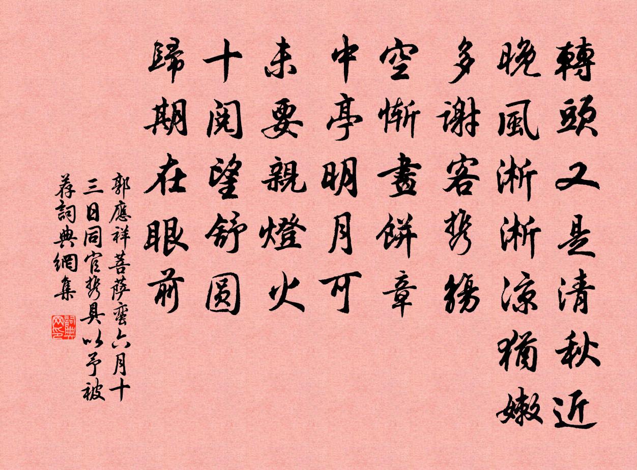 詩詞名句歷史字典書法欣賞書法字典國語詞典說文解字康熙字典古漢語字典標 題 作 者 詩 句 菩薩蠻(六月十三日,同官攜具,以予被薦)作者:郭應祥 朝代:宋代原文轉頭又是清秋近。晚風淅淅涼猶嫩。多謝客攜觴。空慚畫餅章。中亭明月可。未要親燈火。十閱望舒圓。歸期在眼前。詩詞問答問:《菩薩蠻(六月十三日,同官攜具,以予被薦)》的作者是誰?答:郭應祥問:該詩寫於哪個朝代?答:宋代問:該詩是什麼體裁?答:詞書法欣賞菩薩蠻(六月十三日,同官攜具,以予被薦)書法作品詩詞推薦和鄭閎中仙居十一首陳襄〔宋代〕我愛仙居好,官卑分已盈。才非漢循吏,道似魯狂生。擊柝心雖樂,觀民志未平。寧如孟夫子,不食去齊卿。寄靈仲通侄釋如珙〔宋代〕一樓山色好,山是飛來山。座上方外友,身心俱閒閒。秋來幾夜夢,踏月到其問。更轉語方定,瓦爐香未殘。一偈頔上人持瑩蘿月五詩見示因走筆和韻聊禦睡魔鄭清之〔宋代〕竺乾心法拈花笑,洙泗家風鼓瑟希。一問已應居第二,更詢來處落三機。偈頌一百六十首釋宗杲〔宋代〕丹霞燒木佛,院主眉須落。鳥飛毛墜,魚行水濁,要識真麒麟,只有一隻角。題英禪師亞棲〔唐代〕將知德行異尋常,每見持經在道場。欲識用心精潔處,一瓶秋水一爐香。長安客感雍陶〔唐代〕日過千萬家,一家非所依。不及行塵影,猶隨馬蹄歸。仗錫山中釋文珦〔宋代〕雨地春山薇蕨長,曉隨樵子穿雲上。貪看岩頭瀑布飛,坐來忘卻青藜杖。謝程帥袁制使陳造〔宋代〕九死得此生,萬事遂成懶。惟余坐進地,劣亦受推挽。交遊金玉人,畢力補疎短。詩書銜砭劑,陸續到老眼。醉桃源 祿存文曲王吉昌〔元代〕祿存文曲附神光。驅驅逐色忙。昧禪徒亂角和商。如何作道場。雙簾掩,瑣明堂。仙童奪正陽。神功機在性昭彰。金溪道中楊萬里〔宋代〕野花垂路止人行,田水偏尋缺處鳴。近浦人家隨曲折,插秧天氣半陰晴。岸花張籍〔唐代〕可憐岸邊樹,紅蕊發青條。東風吹渡水,衝著木蘭橈。次陝州先寄源從事李商隱〔唐代〕離思羈愁日欲晡,東周西雍此分塗。迴鑾佛寺高多少,望盡黃河一曲無。中秋夜寄友生陸龜蒙〔唐代〕秋來一度滿,重見色難齊。獨坐猶過午,同吟不到西。疏芒唯斗在,殘白合河迷。更憶前年望,孤舟泊大溪曉坐釋文珦〔宋代〕夢破不成寐,茅齋坐清曉。他山已擊鐘,獨樹初啼鳥。四體既調柔,眾境亦深窈。素書未終軸,朝光射林杪。任性皇帝閣春帖子衛涇〔宋代〕彩勝黃金縷,青絲白玉盤。內家迎淑節,先奉太皇歡。回建德寄馮和峰隱士王奕〔宋代〕王子歸鄒魯,知公隱德鄉。道為千載惜,身抱六經藏。青壁丹崖遠,黃花白骨香。百年交一臂,悔不拜龐床。原李嶠〔唐代〕玉粲銷憂日,江淹起恨年。帶川遙綺錯,分隰迥阡眠。□□橫周甸,莓苔闕晉田。方知急難響,長在脊令篇。清暈閣在柳洲寺舊址二首張鎡〔宋代〕去市無多地,重遊淨客心。何人偏種柳,今日屢鳴禽。浩興生孤槳,歸情戀遠岑。梁間滿題詠,寧欠我窺臨。兩同心·巍巍劍外杜安世〔宋代〕巍巍劍外,寒霜覆林枝。望衰柳、尚色依依。暮天靜、雁陣高飛。入碧雲際。江山秋色,遣客心悲。蜀道ε嶮行遲風入松晏幾道〔宋代〕柳陰庭院杏梢牆。依舊巫陽。鳳簫已遠青樓在,水沈誰、復暖前香。臨鏡舞鸞離照,倚箏飛雁辭行。墜鞭人意自淒名句推薦君子欲訥於言而敏於行。孔子弟子《論語·里仁篇》 是以其財不足以待凶飢、振孤寡,故國貧而民難治也。墨子《墨子·06章 辭過》 秋色漸將晚,霜信報黃花。葉夢得《水調歌頭·秋色漸將晚》 頑老情懷,都無歡事,良宵愛幽獨。吳文英《一寸金·秋感》 十五彩衣年,承歡慈母前。孟浩然《送張參明經舉兼向涇州覲省》 今士之用身,不若商人之用一布之慎也。墨子《墨子·47章 貴義》 愚而好自用,賤而好自專。子思《中庸·第二十八章》 南風知我意,吹夢到西洲。佚名《西洲曲》 無情不似多情苦。一寸還成千萬縷。晏殊《玉樓春·春恨》 大江流日夜,客心悲未央。謝朓《暫使下都夜發新林至京邑贈西府同僚》