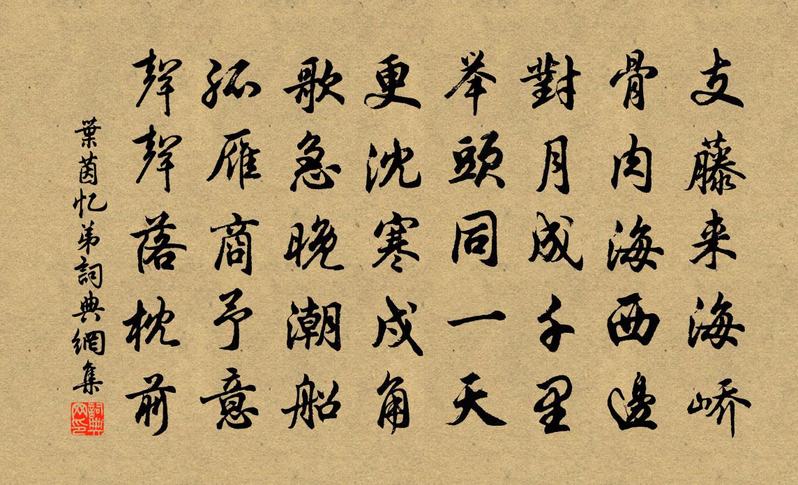 詩詞名句歷史字典書法欣賞書法字典國語詞典說文解字康熙字典古漢語字典標 題 作 者 詩 句 憶弟作者:葉茵 朝代:宋代憶弟原文支藤來海嶠,骨肉海西邊。對月成千里,舉頭同一天。更沈寒戍角,歌急晚潮船。孤雁商予意,聲聲落枕前。詩詞問答問:憶弟的作者是誰?答:葉茵問:憶弟寫於哪個朝代?答:宋代葉茵憶弟書法欣賞憶弟書法作品詩詞推薦聽琴孟郊〔唐代〕颯颯微雨收,翻翻橡葉鳴。月沉亂峰西,寥落三四星。前溪忽調琴,隔林寒琤琤。聞彈正弄聲,不敢枕上聽。回燭鵲橋仙(林侍郎生日)劉克莊〔宋代〕出通明殿,入耆英社,誰似侍郎洪福。掌中元自有三珠,更檢校、諸孫夜讀。管他萊相,管他鶴相,留我本來面目粉水行陳造〔宋代〕散解溪紆福溪直,兩山空中瀉清激。瀦渟壅建幾千家,邀入中田作膏液。餘流複合古城東,末世尚奏鉛華功。定名沁園春(次韻侄演自遣)陳著〔宋代〕無價韶華,一笑相酬,青錢似苔。奈東風輕劣,催紅雨去,西園次第,放綠陰回。老後時光,眉間心事,恰似怕酸觀棋(一作溫庭筠詩)段成式〔唐代〕閒對弈楸傾一壺,黃羊枰上幾成都。他時謁帝銅池曉,便賭宣城太守無。題武夷馬合麻〔宋代〕石鼓溪邊渡,門前一葉舟。雨滋千壑翠,風動萬岩秋。仙去雲常在。山空水自流,九天煩紫詔,借我此中游。終身誤曹雪芹〔清代〕都道是金玉良姻,俺只念木石前盟。空對著,山中高士晶瑩雪;終不忘,世外仙姝寂寞林。嘆人間,美中不足今方政府生日十首曹勛〔宋代〕寥廓無塵臘雪晴,距正五日鳳凰鳴。已膺一德明良會,更祝千齡輔太平。雲門即事林景熙〔宋代〕最愛林中過客稀,坐分片石澹忘歸。僧閒時與雲來往,鶴老不知城是非。瀟灑山光秋入畫,清寒花氣曉侵衣。一溪南流夜郎寄內李白〔唐代〕夜郎天外怨離居,明月樓中音信疏。北雁春歸看欲盡,南來不得豫章書。席上信筆六首李彌遜〔宋代〕春眠不覺夜來風,桃萼猶沾未盡紅。愁絕小湖山畔路,同雲疏雨晚濛濛。北園初夏賀鑄〔宋代〕天氣清和樹蔭濃,冥濛薄雨濕簾櫳。蔫紅半落生香在,向晚玫瑰架上風。雪小霽,順風過謝陽湖楊萬里〔宋代〕都梁三日雪沒屋,小船行水如行陸。山陽一朝帆遇風,大船行水如行空。昨來牽天凍得泣,買蘆燎衣蘆自濕。朝來鞠歌行李白〔唐代〕玉不自言如桃李,魚目笑之卞和恥。楚國青蠅何太多,連城白璧遭讒毀。荊山長號泣血人,忠臣死為刖足鬼。聽曲喜遷鶯楊再可〔宋代〕臘天初曉,慶五色瑞雲,華軒呈繞。紫府真人,丹台仙伯,合降世間榮耀。彩筆素題,篇翰未減,家聲詞藻。秀眉為叔向題坐禪蝦蟆釋紹曇〔宋代〕一從識得性分明,懶作春池鼓吹聲。閒把六門深鎖斷,白蓮香散水風清。戍婦詞釋文珦〔宋代〕新婚使別比秋胡,何似當年莫嫁夫。身在朔方征戍久,雁來南國信音無。空閨寂寂寒宵永,荒路悠悠遠夢孤。聞道望遠行(仙呂調)柳永〔宋代〕長空降瑞,寒風翦,淅淅瑤花初下。亂飄僧舍,密灑歌樓,迤邐漸迷鴛瓦。好是漁人,披得一蓑歸去,江上晚來堪禪人並化主寫真求贊釋正覺〔宋代〕祖祖家傳,心心印全。混沌未受鑿,威音不得專。蕉雷文象齒之所以,桂月暈犀角之能然。水自竹來兮綠非假借,宋江三十六贊龔開〔宋代〕毗沙天人,證紫金軀。頑鐵鑄汝,亦出洪爐。名句推薦痛飲狂歌空度日,飛揚跋扈為誰雄。杜甫《贈李白》 闌乾倚遍重來憑。淚粉偷將紅袖印。歐陽修《玉樓春·去時梅萼初凝粉》 老來疾病都是壯時招得;衰時罪孽都是盛時作得。洪應明《菜根譚·概論》 香非在蕊,香非在萼,骨中香徹。晁補之《鹽角兒·亳社觀梅》 歸鴻聲斷殘雲碧。背窗雪落爐煙直。李清照《菩薩蠻·歸鴻聲斷殘雲碧》 送客自傷身易老,不知何處待先生。劉滄《贈道者》 相思一夜梅花發,忽到窗前疑是君。盧仝《有所思》 雪暗凋旗畫,風多雜鼓聲。楊炯《從軍行》 桂林之一枝,崑山之片玉。房玄齡《晉書·列傳·第二十二章》 違山十里,蟪蛄之聲,猶在於佚名《孔子家語·子路初見》