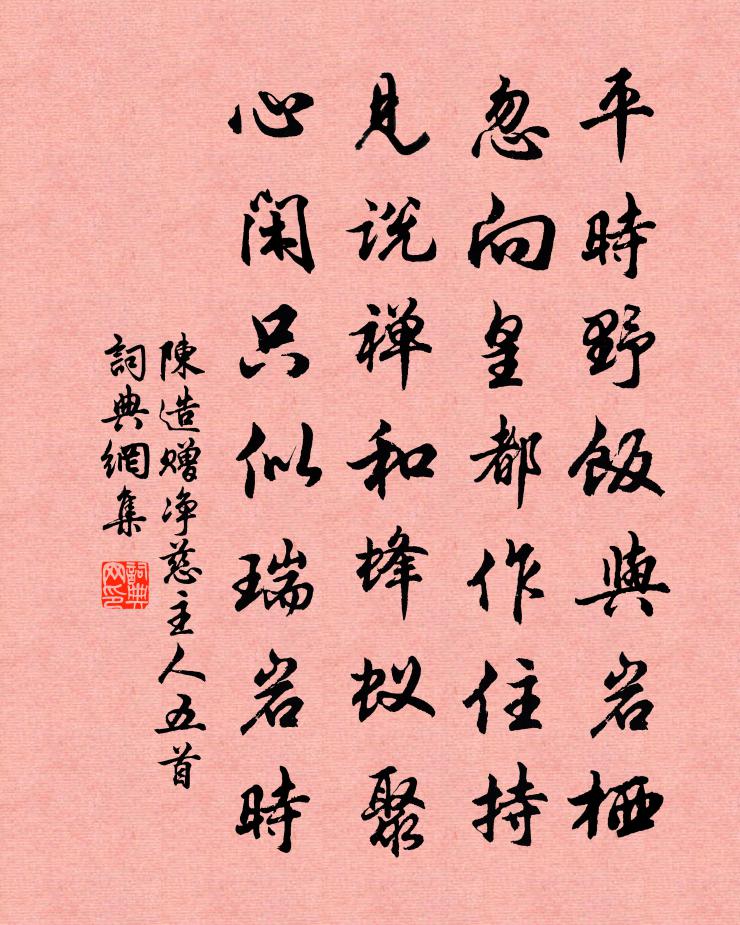 詩詞名句歷史字典書法欣賞書法字典國語詞典說文解字康熙字典古漢語字典標 題 作 者 詩 句 贈淨慈主人五首作者:陳造 朝代:宋代贈淨慈主人五首原文平時野飯與岩棲,忽向皇都作住持。見說禪和蜂蟻聚,心閒只似瑞岩時。詩詞問答問:贈淨慈主人五首的作者是誰?答:陳造問:贈淨慈主人五首寫於哪個朝代?答:宋代陳造贈淨慈主人五首書法欣賞贈淨慈主人五首書法作品詩詞推薦支頤葛起耕〔宋代〕氣數推移有盛衰,老觀此理獨支頤。閱人云木能千載,過眼風花只片時。名利場中棋變幻,是非窠里浪傾危。到頭偈頌六十八首釋法薰〔宋代〕昨宵困倒床上,直至五鼓方甦。今日升堂,言句都無。且望大眾,智不責愚。客邸晝寢起而追程釋紹嵩〔宋代〕客裹無聊久合併,夢回南北昧平生。苦吟風月唯添病,獨冒煙嵐促去程。城外諸峰迎落照,花邊白犬吠流鶯。阮途觀網魚沈與求〔宋代〕暗雨垂垂梅欲黃,春山吐源春漲狂。雪鱗頳尾泝流上,吹濤噴浪能奔忙。魚師布網名白大,萬目井井連重綱。聯艘一落索王安中〔宋代〕夢破池塘杳杳。情隨春草。尊前風味不勝清,賦白雪、幽蘭調。秀句銀鉤爭妙。殷勤東道。蠻箋傳與翠鬟歌,便買謁文公上方杜甫〔唐代〕野寺隱喬木,山僧高下居。石門日色異,絳氣橫扶疏。窈窕入風磴,長蘆紛卷舒。庭前猛虎臥,遂得文公廬。俯視偈頌一百零二首釋慧遠〔宋代〕風捲雲天小艇斜,煙波深處作生涯。絲綸掣斷雙關手,抉出驪龍眼裹沙。和趙忠州歸耕之賦陳文蔚〔宋代〕壯年學易計非疏,晚讀人間種樹書。不向雲霄羨鴻鵠,卻來江海瘵舂鋤。感君綠野成歸計,令我青山思故居。只恐十四日夜月色頗佳山寒不出門窗間擁絮坐翫殊舒岳祥〔宋代〕山居寒重戶先扃,自向疏窗愛日明。欲喚花光來貌取,入檐微見一枝橫。月窗寫悶白玉蟾〔宋代〕不分庭前柳,長啼月下烏。半生嗟命薄,中夜正心孤。勳業看雙鬢,歌吟在數須。從今閒草馬,休得更江湖。呈鍾子嚴華岳〔宋代〕那條路不通長安,莫把心腸獨自剜。有釀何須兒索飲,無餚徒勸客加餐。千金不賞思歸楚,萬戶無封願識韓。大抵經豐城劍池詩陰鏗〔南北朝〕清池自湛澹。神劍久遷移。無復連星氣。空餘似月池。夾筱澄深淥。含風結細漪。唯有蓮花蕚。還想匣中雌。莎衣楊朴〔宋代〕軟綠柔藍著勝衣,倚船吟釣正相宜。蒹葭影里和煙臥,菡萏香中帶雨披。狂脫酒家春醉後,亂堆漁舍晚晴時。直饒樂平樊主簿捧檄北行來別賦此奉餞黎廷瑞〔宋代〕拊字心空悴,清寒節太高。無人相料理,惟我獨賢勞。萬里隨歸雁,孤帆渺暮濤。歸期應不遠,新月點梅梢。臨江仙 與客湖上飲歸葉夢得〔宋代〕不見跳魚翻曲港,湖邊特地經過。蕭蕭疏雨亂風荷。微雲吹散,涼月墜平波。白酒一杯還徑醉,歸來散發婆娑。無偈頌七十二首釋祖欽〔宋代〕時勤拂拭與掀翻,錯莫無端認定備用。點石化為金玉易,勸人除卻是非難。題田將軍宅姚合〔唐代〕焚香書院最風流,莎草緣牆綠蘚秋。近砌別穿澆藥井,臨街新起看山樓。棲禽戀竹明猶在,閒客觀花夜未休。好是幽居春夜陸游〔宋代〕暮景催人雪鬢雙,十年始復反吾邦。雲逢佳月每避舍,酒壓閒愁如受降。三弄笛聲初到枕,一枝梅影正橫窗。要知戲和劉雪巢題壁韻劉翼〔宋代〕吟懷祗怕俗塵迷,若慕唐人也自痴。要識性情根極處,請觀三百五篇詩。游棲真洞韓松〔宋代〕黃冠具行輿,邀我游棲真。山家雜水樹,野徑橫荊榛。長松臥蒼蛟,亂石錯紫鱗。委曲至洞府,積雪開雙門。結頂名句推薦劍花寒,夜坐歸心壯,又是他鄉。張可久《滿庭芳·客中九日》 燕雀安知鴻鵠之志。司馬遷《史記·陳涉世家》 巴山楚水淒涼地,二十三年棄置身。劉禹錫《酬樂天揚州初逢席上見贈》 夫惡有同方取不取同而已者乎?墨子《墨子·01章 親士》 晴日暖風生麥氣,綠陰幽草勝花時。王安石《初夏即事》 紅豆不堪看,滿眼相思淚。牛希濟《生查子·新月曲如眉》 君行逾十年,孤妾常獨棲。曹植《明月上高樓》 逢人且說三分話,未可全拋一片心。佚名《增廣賢文·上集》 仁暴者,皆亡國者也。韓非及後人《韓非子·八說》 大凡朋友須箴規指摘處少,誘掖獎勸意多,方是。王陽明《傳習錄·卷下·門人陳九川錄》