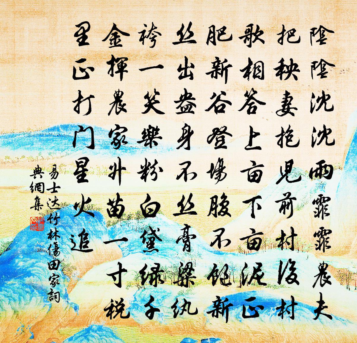 詩詞名句歷史字典書法欣賞書法字典國語詞典說文解字康熙字典古漢語字典標 題 作 者 詩 句 竹林傷田家作者:易士達 朝代:宋代竹林傷田家原文陰陰沈沈雨霏霏,農夫把秧妻抱兒。前村後村歌相答,上畝下畝泥正肥。新谷登場腹不飽,新絲出盎身不絲。膏粱紈袴一笑樂,粉白黛綠千金揮。農家升苗一寸稅,里正打門星火追。詩詞問答問:竹林傷田家的作者是誰?答:易士達問:竹林傷田家寫於哪個朝代?答:宋代易士達竹林傷田家書法欣賞竹林傷田家書法作品詩詞推薦感皇恩晁沖之〔宋代〕蝴蝶滿西園,啼鶯無數。水閣橋南路。凝佇。兩行煙柳,吹落一池飛絮。鞦韆斜掛起,人何處。把酒勸君,閒愁莫陪孫之翰太傅登成都樓張俞〔宋代〕齪齪古之人,傷心廣陵廢。遂弦蕪城歌,半夜一揮涕。蕙紈隨草衰,藻黼歸塵翳。魂石斂邱封,歌堂從水逝。薰光甲戌八月初九夜武康山中洪水驟發越十日漕司董嗣杲〔宋代〕甲戌纏國哀,時屬秋八月。近輔餘英山,洪水中夜發。狼藉徹旬雨,拔地殊飄忽。滔天肆奔迸,變幻起崷崒。徒步過蔣學正三徑庵史才〔宋代〕紛紛處世羨鳴珂,君隱考盤詩獨喔。三徑早知皆坦路,一庵聊復障頹波。田園無悔歸家晚,松柏存看繞舍多。笑我女冠子薛昭蘊〔唐代〕求仙去也,翠鈿金篦盡舍。入岩巒,霧卷黃羅帔,雲雕白玉冠。野煙溪洞冷,林月石橋寒。靜夜松風下,禮天壇。題王欽州子澤雙清閣曾豐〔宋代〕馬蹏車轍前門外,江聲山色後堂背。左手持盤右把杯,家人怪問翁何在。小閣崢嶸負後堂,圖書左右翁中央。一塵寄盧司戶趙汝鐩〔宋代〕寂寞盧司戶,誅茅楚水東。幾年與君別,一字不余通。釣水空烹鯉,行汀屢扣鴻。夢魂還可托,握手片時同。項羽張耒〔宋代〕沛公百萬保鹹陽,自古柔仁伏暴強。慷慨悲歌君勿恨,拔山蓋世故應亡。答高恥堂計使招賞海棠趙汝騰〔宋代〕皇華相約醉崇台,正月海棠彌望開。萬象呈春杯瀲灩,千花炫夜燭縈迴。雨余妃帶華清沐,雲幕仙從絳闕來。明歲白鹿洞別諸生李夢陽〔明代〕東南自有匡廬山,遂與天地增籬衛。山根插入彭蠡湖,崢嶸背殺三江勢。地因人勝古有語,於乎萬物隨興廢。學館頌古四十四首釋師範〔宋代〕靈山一會善堤防,蠱毒之家水莫嘗。迦葉無端沾一滴,至今猶自麵皮黃。贈山翁李濤〔唐代〕松蘿深處住,閒野不生愁。鳥語煙嵐靜,水聲門戶秋。花間歸洞路,山下釣魚舟。沐浴聖王化,自憐絲滿頭。五月中連夕風雨氣候如高秋枕上有賦陸游〔宋代〕擁被微吟短鬢秋,孤燈殘漏共悠悠。雨聲不貣三更夢,酒力寧禁萬里愁?身寄湖山鄰剡曲,心遊河岳過關頭。世間蠶婦嘆錢時〔宋代〕蠶婦指蠶葉如縷,愛之何啻珠玉比。呼奴勤向帳前看,夜臥摩寧三四起。未必便能絲掛體,睠焉於懷有真喜。人人白蓮釋智圓〔宋代〕栽種空池歲已賒,暑天開處異群花。澄波照影疑秋鷺,靜夜擎香混月華。雪態自堪憐翡翠,玉苞終恥近蒹葭。閒來往富陽新城李節推先行三日留風水洞見待蘇軾〔宋代〕春山磔磔鳴春禽,此間不可無我吟。路長漫漫傍江浦,此間不可無君語。金魚池邊不見君,追君直過定山村。路人仇仁近母邢夫人輓詩方回〔宋代〕慈顏才一識,近獲拜書樓。忽化金棺火,應添石室籌。鄉鄰傳閫範,弔祭盡儒流。令子令和靖,詩名甲此州。次韻答伯初汪炎昶〔宋代〕世網無端巧見遮,路岐何處出裹斜。游山斷合先廬阜,築室寧當舍若耶。此事豈難吾未遂,中的漸近累仍加。還應題時遁澤畫卷十首王柏〔宋代〕浩浩乾坤闊,微微見斷山。頗興浮海意,吾道正多艱。直州次韻丁教授送行二首項安世〔宋代〕送行第一要君詩,一路看詩慰所思。可吏可儒仍可將,吾兄吾友亦吾師。暫移馬舫仿亭榭,小簇螺盤話別離。指點名句推薦冥冥寒食雨,客意向誰親?劉一止《冥冥寒食雨》 楚天千里清秋,水隨天去秋無際。辛棄疾《水龍吟·登建康賞心亭》 遠上寒山石徑斜,白雲生處有人家。杜牧《山行》 上醫醫國,其次疾人左丘明《國語·晉語·醫和視平公疾》 莫道君行早,更有早行人。佚名《增廣賢文·上集》 福壽康寧,固人之所同欲;死亡疾病,亦人所不能無。程登吉《幼學瓊林·卷三·疾病死喪》 終日昏昏醉夢間,忽聞春盡強登山。李涉《題鶴林寺僧舍》 拆桐花爛熳,乍疏雨、洗清明。柳永《木蘭花慢·拆桐花爛熳》 春風舉國裁宮錦,半作障泥半作帆。李商隱《隋宮 / 隋堤》 綠鬢能供多少恨,未肯無情比斷弦晏幾道《破陣子·柳下笙歌庭院》
