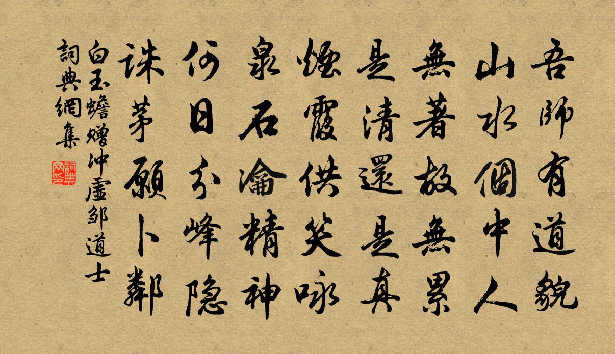 詩詞名句歷史字典書法欣賞書法字典國語詞典說文解字康熙字典古漢語字典標 題 作 者 詩 句 贈沖虛鄒道士作者:白玉蟾 朝代:宋代贈沖虛鄒道士原文吾師有道貌,山水箇中人。無著故無累,是清還是真。煙霞供笑詠,泉石瀹精神。何日分峰隱,誅茅願卜鄰。詩詞問答問:贈沖虛鄒道士的作者是誰?答:白玉蟾問:贈沖虛鄒道士寫於哪個朝代?答:宋代問:贈沖虛鄒道士是什麼體裁?答:五律白玉蟾贈沖虛鄒道士書法欣賞贈沖虛鄒道士書法作品詩詞推薦次韻仇仁近有懷見寄十首方回〔宋代〕老玩韋編尚可為,復能吃口對期期。離明偶剔書燈見,坎止因斟硯水知。豈厭微塵裨泰岳,只愁殘照近鹹池。兒曹娘子軍佚名〔宋代〕唐高祖之第三女,微時嫁柴紹。高祖起兵反隋,紹與妻謀曰:“尊公欲掃平天下,紹欲迎接義旗,二人同去則不可張堯夫寺丞改葬輓詞梅堯臣〔宋代〕洛陽交舊里,過半已凋殘。在昔義投漆,最先悲闔棺。誰知二紀水,重卜九原安。聞說塞門路,白楊風更寒。與桐廬鄭明府方乾〔唐代〕字人心苦達神明,何止重門夜不扃。莫道耕田全種秫,兼聞退食亦逢星。映林顧兔停琴望,隔水寒猿駐筆聽。卻恐紈扇連文鳳〔宋代〕露冷飄零半幅紈,傷心不見女乘鸞。歌殘春院桃花暖,愁殺秋庭木葉寒。滿地飛塵何處避,舊時明月向誰看。應思次韻朱解元雪陳造〔宋代〕掉頭取別未經旬,已積胸中幾斛塵。密雪忽明銀海夜,端憂空負玉花春。筆驅和氣君何健,囊致新詩我未貧。勝日中秋客邸感懷陳某〔宋代〕今夜天邊月,誰期海上看。家山雖間隔,兒女暫團欒。露重銀蟾濕,風清玉宇寒。年年長是客,強把一樽嘆。夜發軍中李益〔唐代〕邊馬櫪上驚,雄劍匣中鳴。半夜軍書至,匈奴寇六城。中堅分暗陣,太乙起神兵。出沒風雲合,蒼黃豺虎爭。今日三山亭陶弼〔宋代〕三山亭下水悠悠,山聳潮平地欲浮。草木秀多窮海角,棟樑高處壓鰲頭。莫辭樽俎金船夜,曾駐旌旗玉帳秋。好景書齋十詠硯瓶劉子翬〔宋代〕小瓶防硯渴,埏埴自良工。懷抱清誰兒,聊憑一滴通。大學三關陳普〔宋代〕致知格物最為難,夢覺關中善惡關。若得二關俱過了,方成人在兩儀間。酬秦壽之見贈三首王之道〔宋代〕人言韓孟才相高,欲將詩骨追詩濤。可憐寒谷瘦不毛。青高倚松亦浪語,遂令後世稱同曹。酒中十詠。酒床皮日休〔唐代〕糟床帶松節,酒膩肥如羜。滴滴連有聲,空疑杜康語。開眉既壓後,染指偷嘗處。自此得公田,不過渾種黍。水龍吟(次李起翁中秋)趙以夫〔宋代〕誰家明鏡飛空,海天紺碧浮秋霽。西風淡盪,纖雲卷盡,小星疑墜。宇宙冰壺,襟懷玉界,飄然仙思。炯靈犀一點庚寅秋病得語不復詮次名曰感懷黎廷瑞〔宋代〕祖龍制八極,法令如亂麻。儒冠委秋山,王燄明朝霞。所以武陵人,入山種桃花。如何東陵侯,苟此旦暮華。堂堂戲贈趙虛舟〔唐代〕砌下梧桐葉正齊,花繁雨後壓枝低。報導不須鴉鳥亂,他家自有鳳凰棲。偈頌二百零五首釋正覺〔宋代〕桃華浪里振修鱗,一躍龍門看化身。諦了十方三世事,無始的的自家春。送太守李公陳天麟〔宋代〕亂花翻陣雨,飛絮轉輕球。別思昏如醉,征鞍挽不留。職循今列郡,秩視古諸侯。當代人爭仰,惟公政最優。洋川過盤山吳澗所〔宋代〕盤迴六七里,天色冷颼颼。石壁無平地,山雲隔遠洲。清笳悲送日,老卒病眠秋。行望酒家出,青山映碧流。水龍吟 鄭蘭玉賦蠟梅,工甚,予拾其遺意補張翥〔元代〕玉人梔貌堪憐,曉妝一洗鉛華盡。此花應是,菊分顏色,梅分風韻。萼點駝酥,口攢金磬,心凝檀粉。甚女貞染就名句推薦不畏浮雲遮望眼,自緣身在最高層。王安石《登飛來峰》 客醉倚河橋,清光愁玉簫。高觀國《菩薩蠻·何須急管吹雲暝》 善化不足,惡化有餘。佚名《增廣賢文·上集》 相送巴陵口,含淚上舟行。陳子龍《三洲歌》 河冰結合,非一日之寒;積土成山,非斯須之作。王充《論衡·卷十四·狀留篇》 雨過橫塘水滿堤,亂山高下路東西。曾鞏《城南·雨過橫塘水滿堤》 何用慰相思,裁書寄關右。李益《送諸暨王主簿之任》 玉爐香,紅蠟淚,偏照畫堂秋思。溫庭筠《更漏子·玉爐香》 翠輦不來金殿閉,宮鶯銜出上陽花雍陶《天津橋望春》 散關三尺雪,回夢舊鴛機。李商隱《悼傷後赴東蜀辟至散關遇雪》