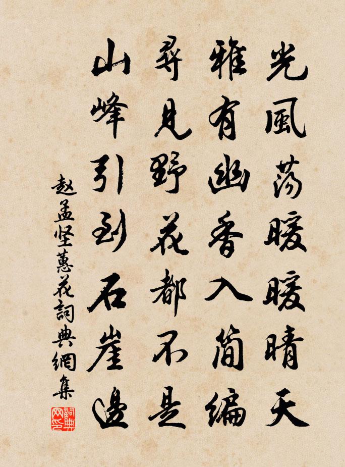 詩詞名句歷史字典書法欣賞書法字典國語詞典說文解字康熙字典古漢語字典標 題 作 者 詩 句 蕙花作者:趙孟堅 朝代:宋代蕙花原文光風盪暖暖晴天,雅有幽香入簡編。尋見野花都不是,山峰引到石崖邊。詩詞問答問:蕙花的作者是誰?答:趙孟堅問:蕙花寫於哪個朝代?答:宋代趙孟堅蕙花書法欣賞蕙花書法作品詩詞推薦次吊原韻葉茵〔宋代〕為憐舉世不曾醒,放浪形骸澤畔行。會得危言危行意,佐成濯足濯纓名。義無可去緣同姓,心亦何求要獨清。今日次韻斯遠晨起見示趙蕃〔宋代〕雲行日日候西東,更卜林啼與穴宮。乍見天邊成四合,不知山腳本來空。豈惟吾輩憂艱食,更說軍儲傒屢豐。詔旨南柯子 示眾 金蓮正宗記卷五郝大通〔元代〕地肺重陽子,崑崙太古仙。二人結約未生前。托居凡世,飛下大羅天。共闡玄元教,行藏度有緣。奈何不悟似流泉題王孫口致爽亭賡陳左史韻陳宓〔宋代〕誰結危亭碧玉堆,西山爽氣喚仍回。嵐光只恐不堪著,更遣新詩勾引來。感皇恩 至元十七年八月八日為通議西溪兄壽王惲〔元代〕南衙,予始相識。時初夏桐陰滿庭,故有南衙清書之句少日竹林游,鳳麟飛走。一段江山最英秀。南衙傾蓋,滿院飯罷王諶〔宋代〕飯罷扣松關,襟懷分外寬。凍雲探擁寺,寒瀨淺鳴灘。苔剝碑文字,香縈古篆盤。尋春難著句,為怕起愁端。次韻子夷兄弟十首張耒〔宋代〕經時不飲酒,廩薄人口眾。人閒多是非,不敢盜鄰瓮。二公洛陽日,想見飲屢痛。行求放湖海,種秫代官俸。詠梅王安石〔宋代〕頗怪梅花不肯開,豈知有意待春來。燈前玉面披香出,雪後春容取勝回。觸撥清詩成走筆,淋漓紅袖趣傳杯。望塵酬別薛三、蔡大,留簡韓十四主簿高適〔唐代〕迢遞辭京華,辛勤異鄉縣。登高俯滄海,回首淚如霰。同人久離別,失路還相見。薛侯懷直道,德業應時選。蔡子早春雪中聞鶯韓愈〔唐代〕朝鶯雪裡新,雪樹眼前春。帶澀先迎氣,侵寒已報人。共矜初聽早,誰貴後聞頻。暫囀那成曲,孤鳴豈及辰。風霜示俞處士王安石〔宋代〕魯山眉宇人不見,只有歌辭來向東。借問樓前踏於蒍,何如雲臥唱松風。借明秀軒韻送趙推入幕二首劉宰〔宋代〕紛紛末俗假成真,幕府歸來歲聿新。萬里終存江海志,一毫莫染簿書塵。讀穀梁傳二首權德輿〔唐代〕荀寅士吉射,誠乃蔽聰明。奈何趙志父,專舉晉陽兵。下令漢七國,藉此以為名。吾嘉徙薪智,禍亂何由生。憶昔試俞珣筆呈羅大著陳造〔宋代〕市工營營有工拙,珣也旁睨裁一吷。扣門屬我祗厚顏,結字著書無一愜。繡衣仙人歸告猷,盍收此長助毫髮。青霄獲麟解韓愈〔唐代〕麟之為靈,昭昭也。詠於《詩》,書於《春秋》,雜出於傳記百家之書,雖婦人小子皆知其為祥也。 然麟之為憶山中寄舊友錢起〔唐代〕數歲白雲里,與君同採薇。樹深煙不散,溪靜鷺忘飛。更憶東岩趣,殘陽破翠微。脫巾花下醉,洗藥月前歸。風景寒雲輕重色張仲素〔唐代〕佳期當可許,托思望雲端。鱗影朝猶落,繁陰暮自寒。因風方裊裊,間石已漫漫。隱映看鴻度,霏微覺樹攢。凝空如夢令·點滴空階疏雨王國維〔清代〕點滴空階疏雨。迢遞嚴城更鼓。睡淺夢初成,又被東風吹去。無據。無據。斜漢垂垂欲曙。木蘭花晏幾道〔宋代〕小顰若解愁春暮,—笑留春春也住。晚紅初減謝池花,新翠已遮瓊苑路。湔裙曲水曾相遇,挽斷羅巾容易去。啼珠頌古三十八首釋從瑾〔宋代〕古帆未掛時,後園驢吃草。日短苦夜長,行人須及早。名句推薦不義不昵,厚將崩。左丘明《左傳·隱公·隱公元年》 梧桐雨細。漸滴作秋聲,被風驚碎。張輯《疏簾淡月·寓桂枝香秋思》 恩疏寵不及,桃李傷春風。李白《上之回》 昨日春如,十三女兒學繡。辛棄疾《粉蝶兒·和趙晉臣敷文賦落花》 惟將終夜常開眼,報答平生未展眉。元稹《遣悲懷三首·其三》 若對黃花孤負酒,怕黃花、也笑人岑寂。劉克莊《賀新郎·九日》 紅顏未老恩先斷,斜倚薰籠坐到明。白居易《後宮詞》 正入萬山圈子裡,一山放過一山攔楊萬里《過松源晨炊漆公店》 何事東君,解將芳思,巧綴一斛春冰。朱晞顏《一萼紅·盆梅》 怪人不知理,知理不怪人。佚名《增廣賢文·下集》