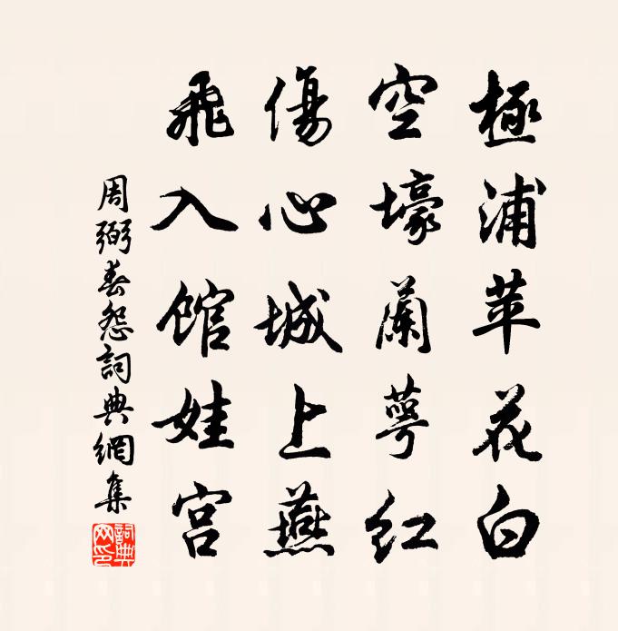 詩詞名句歷史字典書法欣賞書法字典國語詞典說文解字康熙字典古漢語字典標 題 作 者 詩 句 春怨作者:周弼 朝代:宋代春怨原文極浦苹花白,空壕蘭萼紅。傷心城上燕,飛入館娃宮。詩詞問答問:春怨的作者是誰?答:周弼問:春怨寫於哪個朝代?答:宋代周弼春怨書法欣賞春怨書法作品詩詞推薦風入松 題驛亭圖沈禧〔元代〕使軺今夜宿郵亭。邂逅見娉婷。琵琶斜抱生嬌媚,悄無人、獨倚幃屏。弦內暗傳心事,鐙前略*幽情。麗詞一曲按柳梢青辛棄疾〔宋代〕八難之辭莫煉丹難。黃河可塞,金可成難。休辟穀難。吸風飲露,長忍飢難。勸君莫遠遊難。何處有、西王母難。贈禪僧馬戴〔唐代〕弟子人天遍,童年在沃洲。開禪山木長,浣衲海沙秋。振錫搖汀月,持瓶接瀑流。赤城何日上,鄙願從師游。憶友懷野寺舊居(一作答司空文明懷野寺舊居)李端〔唐代〕自嫌野性共人疏,憶向西林更結廬。寄謝山陰許都講,昨來頻得遠公書。過鉛山江口楊萬里〔宋代〕下卻諸灘水漸平,舟行已遠上饒城。酒家便有江鄉景,綠柳梢頭樹玉瓶。題顏氏亭宇孟賓於〔唐代〕園林蕭灑聞來久,欲訪因循二十秋。今日開襟吟不盡,碧山重疊水長流。翠玉樓晚雨曹勛〔宋代〕晚樓一曲轉梅花,官事無多報放衙。林木蔽虧煙斷續,江流曲折雨橫斜。年華冉冉風前影,歲莫悠悠客里家。一雁次韻謝范黃中運管二絕劉宰〔宋代〕一區聞道宅新成,瀟灑真堪寄此生。胸次清冰元自瑩,不妨更向生壺盛。繞佛閣張艾〔宋代〕渚雲弄濕,煙縷際晚,江國遙碧。鴻過無跡。怕聞野寺孤鍾動悽惻。小橋路窄。疏袖暗拂衰草,愁聽蛩語還寂。可游南雁盪范旻〔宋代〕塵勞最是愛山居,借得丹台半日余。黃雪糝來松徑滿,白雲飛去洞門虛。掃苔有客題詩句,滴露無人校道書。何日淮西道中孔武仲〔宋代〕曾歷光黃嶺百尋,悲傷仆馬在嶇嶔。卻思前日山行苦,未比今朝車轍深。恐轉春風成猛雨,喜逢寒色閣輕陰。荒陂官舍見月三首洪咨夔〔宋代〕月行郁羅天,終古同此輪。死魄復生魄。一點存者神。我來萬山底,舉眼無似人。惟月獨知我,寂歷常相親。而我梅花七絕陳師道〔宋代〕姑射仙姿不畏寒,謝家風格鄙鉛丹。誰知檀萼香須里,已有調羹一點酸。驄馬章甫〔宋代〕門前驄馬無人騎,北風落日長聲嘶。細看毛骨獨殊眾,或言來自流沙西。伏櫪忍遭奴隸辱,立仗難貪五品粟。將軍和慎思未試即事雜書率用秋日同文館為首句蔡肇〔宋代〕翳翳雲生樹,翻翻風動闈。高秋忽如此,吾黨苦思歸。極目愁關塞,侵寒寄褚衣。少狂真喜事,回首壯心違。鴛鴦湖棹歌 之二十六朱彝尊〔清代〕梅花小閣兩重階,屈戍屏風六扇排。不及張銅爐在地,三冬長暖牡丹鞋。十二月十日方岳〔宋代〕酒醒開門雪滿山,徑穿疏竹上危欄。溪山與我俱我畫,草樹惟梅大耐寒。留伴夜深銀鑿落,莫緣春近玉闌珊。老枝勸學張詠〔宋代〕大化不自言,委之在英才。玄門非有閉,苦學當自開。世上百代名,莫遣寒如灰。晨雞固自勉,男子胡為哉。胸中晚晴登樓和叔存侄程公許〔宋代〕放浪煙霞我亦曾,誤憑宵夢繞觚稜。眼明一片蠶崖雪,便擬搘筇最上層。泛舟尋鬱林寺道玄上人遇雨而返因寄許渾〔唐代〕禪扉倚石梯,雲濕雨淒淒。草色分松徑,泉聲咽稻畦。棹移灘鳥沒,鍾斷嶺猿啼。入夜花如雪,回舟憶剡溪。名句推薦福滿須防有禍,凶多料必無爭。佚名《增廣賢文·下集》 凡是人,皆須愛。天同覆,地同載。李毓秀《弟子規·泛愛眾》 銅華滄海,愁霾重嶂,燕北雁南天外。吳文英《永遇樂·乙巳中秋風雨》 寂寞離亭掩,江山此夜寒。王勃《江亭夜月送別二首》 閨中風暖,陌上草薰江淹《別賦》 湘西一杯酒,渺渺紅葉換。趙蕃《次韻酬吳德夫去秋送行之作》 毀譽從來不可聽,是非終久自分明。馮夢龍《警世通言·卷四》 夫天地者,萬物之逆旅也;光陰者,百代之過客也。李白《春夜宴桃李園序 / 春夜宴從弟桃花園序》 波瀾誓不起,妾心古井水。孟郊《列女操 / 烈女操》 一葉浮萍歸大海,為人何處不相逢!吳承恩《西遊記·第四十回》