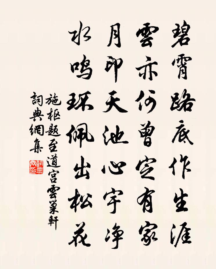詩詞名句歷史字典書法欣賞書法字典國語詞典說文解字康熙字典古漢語字典標 題 作 者 詩 句 題至道宮雲巢軒作者:施樞 朝代:宋代題至道宮雲巢軒原文碧霄路底作生涯,雲亦何曾定有家。月印天池心宇淨,水鳴環佩出松花。詩詞問答問:題至道宮雲巢軒的作者是誰?答:施樞問:題至道宮雲巢軒寫於哪個朝代?答:宋代施樞題至道宮雲巢軒書法欣賞題至道宮雲巢軒書法作品詩詞推薦題嚴子陵釣台林亦之〔宋代〕莫向金門傲冕旒,歸來卻要著羊裘。乾坤不是劉文叔,那得長竿釣白頭。寒泉亭李復〔宋代〕孤亭結架開岩扃,山深氣偏冬常侵。驚浪一溪噴飛雪,陰檐五月垂堅冰。長風不斷響空峽,崩石欲落纏巨藤。三伏江城子(宴守倅)王質〔宋代〕柳梢無雪受風吹。綠垂垂。乳鴉啼。直下蒲萄,春水未平堤。卻似今年春氣早,白團扇,已相宜。紅巾當日鳥銜飛前紀時行陳著〔宋代〕孟春朔日雷聲發,雷後兼旬雨不歇。仲春之朔近春分,一夜風雪四山白。豐歉氣候看春頭,乃今變異連兩月。陰陽湖外送何崇入閣裴說〔唐代〕因詩相識久,忽此告臨途。便是有船發,也須容市沽。精吟五個字,穩泛兩重湖。長短逢公道,清名振帝都。吳江楊備〔宋代〕松陵水國面松江,學弄漁竿對酒缸。驚起鴛鴦是旗鼓,背帆飛去一雙雙。春日田園雜興君端〔宋代〕 * 牆頭紅杏花,竹槍籬下種絲瓜。廚煙乍熟抽心菜,策火新乾卷葉茶。草地雨長應易墾,秧田水足不須車。白頭畫竹歌白居易〔唐代〕植物之中竹難寫,古今雖畫無似者。蕭郎下筆獨逼真,丹青以來唯一人。人畫竹身肥擁腫,蕭畫莖瘦節節竦。人畫同何元立蔡肩吾至東丁院汲泉煮茶陸游〔宋代〕雪芽近自峨嵋得,不減紅囊顧渚春。旋置風爐清樾下,它年奇事記三人。雜詩佚名〔唐代〕一去遼陽系夢魂,忽傳征騎到中門。紗窗不肯施紅粉,徒遣蕭郎問淚痕。嘲雪李賀〔唐代〕昨日發蔥嶺,今朝下蘭渚。喜從千里來,亂笑含春語。龍沙濕漢旗,鳳扇迎秦素。久別遼城鶴,毛衣已應故。客枕聞鵑吳錫疇〔宋代〕煙新寒食過,月皎子規來。萬里他鄉恨,千年故國哀。窗深欹枕聽,夢短到家回。為爾添愁寂,春風不耐催。洞仙歌周雲〔宋代〕千崖滴翠。正秋高時侯。橙黃桔綠又重九。有蓬壺仙子、赤鯉來游,風雲會,施展經綸妙手。去年稱壽處,北斗天鷓鴣天朱敦儒〔宋代〕不系虛舟取性顛。浮河泛海不知年。乘風安用青帆引,逆浪何須錦纜牽。雲薦枕,月鋪氈。無朝無夜任橫眠。太虛餞李君亮著作守眉山分韻得翠字樓鑰〔宋代〕天下大峨山,雄秀盤厚地。山雖不在眉,所在擁空翠。矯矯三蘇公,挹此淑靈氣。文章垂日星,照映蓋一世。李侯和魏定父王之道〔宋代〕十里南溪路,思君一望間。黃花秋色老,紅葉露痕殷。似說親朋集,遙知杖屢閒。徘徊松徑晚,踏破紫苔斑。結帶巾佚名〔宋代〕頭巾帶。誰理會。三千貫賞錢,新行條例。不得向後長垂,與胡服相類。法甚嚴,人盡畏。便縫闊大帶,向前面系和吳微明疏影橫斜水清淺七詠韻李呂〔宋代〕避俗淵明心會景,只詠孤松秀冬嶺。爭識槎牙竹外枝,月上空階間金影。排悶陸游〔宋代〕老去知心少,流塵鎖斷弦。尊空問字酒,囊罄作碑錢。掃葉供朝爨,和泥補漏船。胸中元浩浩,白眼望青天。雨留景山家陳著〔宋代〕桂後菊花前,相逢夢覺然。閒心時外話,親意雨中眠。投老會難必,臨行留更堅。西風亦解事,未肯放晴天。名句推薦昨夜江邊春水生,艨艟巨艦一毛輕。朱熹《活水亭觀書有感二首·其二》 鞭個馬兒歸去也,心急馬行遲。辛棄疾《武陵春·走去走來三百里》 江山如有待,花柳自無私。杜甫《後游》 扁舟昨泊,危亭孤嘯,目斷閒雲千里。吳潛《鵲橋仙·扁舟昨泊》 博學之,審問之,慎思之,明辨之,篤行之。子思《中庸·第二十章》 縱被無情棄,不能羞。韋莊《思帝鄉·春日游》 風為裳,水為佩李賀《蘇小小墓》 疾雷不及塞耳,疾霆不暇掩目。劉安及其門客《淮南子·兵略訓》 好景落誰詩句里,蹇驢馱我畫圖間。趙渢《黃山道中》 欲系青春,少住春還去。朱淑真《蝶戀花·送春》
