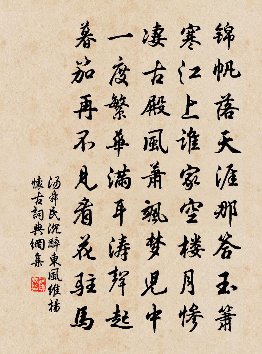這是一首元代的散曲,屬於小令,作者不詳。“沉醉東風”是曲牌名;“維揚懷古”是曲子的標題, “維揚”,古地名,今江蘇揚州。 “懷古”,憶古思今,奠定全曲傷感的基調。 首句“錦帆落天涯那答”化用唐代詩人李商隱的詩句“錦帆應是到天涯”,“錦帆”,借代的手法,代指皇帝華麗的遊船;“那答”,那邊。意思是說:皇帝的遊船已經到了天涯那邊,舊的王朝已經滅亡了。緊承標題中的“懷古”二字。