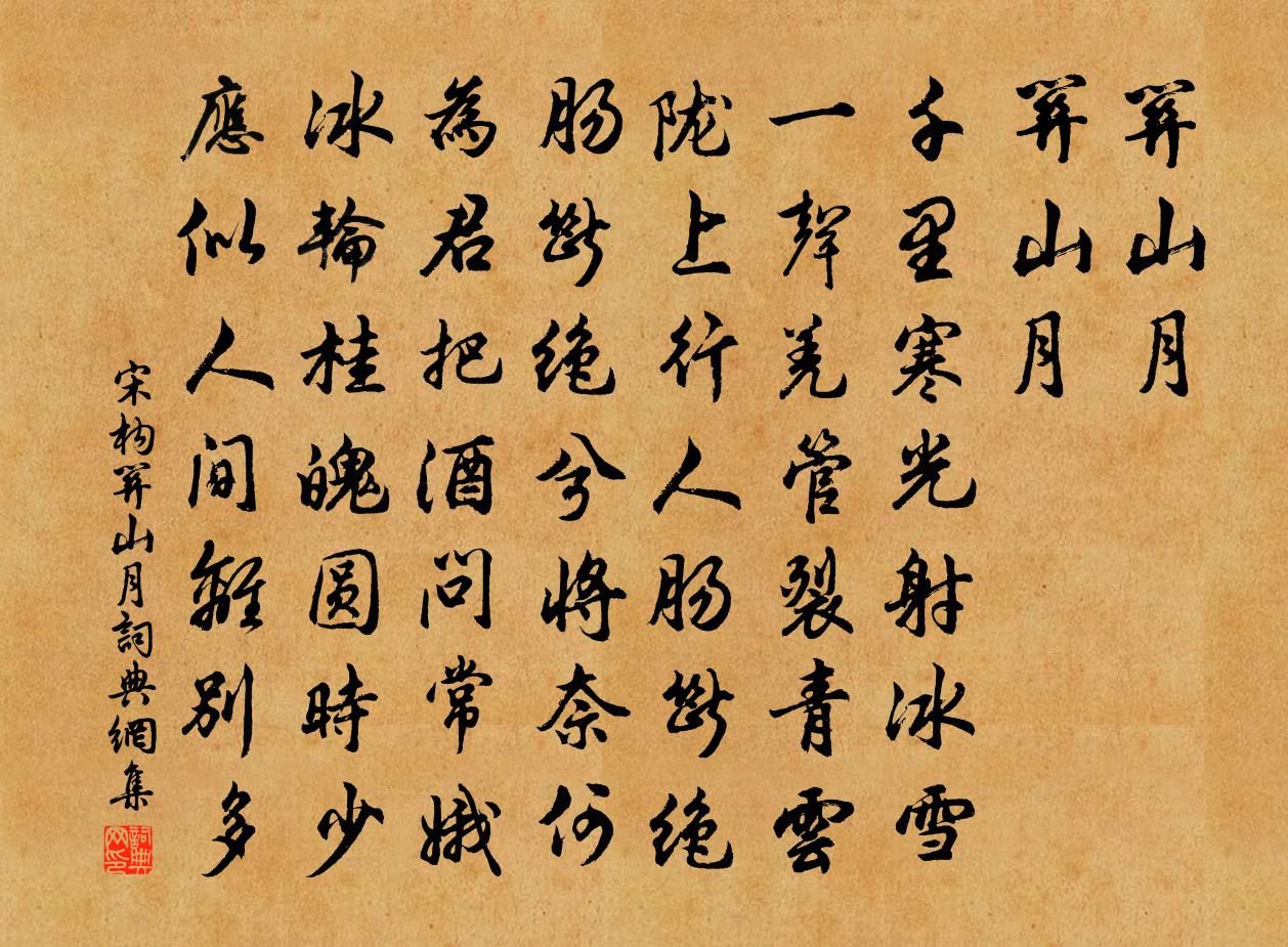 詩詞名句歷史字典書法欣賞書法字典國語詞典說文解字康熙字典古漢語字典標 題 作 者 詩 句 關山月作者:宋構 朝代:宋代關山月原文關山月,關山月,千里寒光射冰雪。一聲羌管裂青雲,隴上行人腸斷絕。腸斷絕兮將奈何,為君把酒問常娥。冰輪桂魄圓時少,應似人間離別多。詩詞問答問:關山月的作者是誰?答:宋構問:關山月寫於哪個朝代?答:宋代宋構關山月書法欣賞關山月書法作品詩詞推薦深山逢老僧二首貫休〔唐代〕衲衣線粗心似月,自把短鋤鋤榾柮。青石溪邊踏葉行,數片雲隨兩眉雪。山童貌頑名乞乞,放火燒畬采崖蜜。擔頭十蟲吟舒岳祥〔宋代〕蟲有攛梭子,頭腹俱銳長。綠衣而絳里,飛躍低踉蹡。名我固甚善,所愧無筐箱。維天有南箕,不可以簸揚。微蟲郊廟歌辭。儀坤廟樂章。肅和張齊賢〔唐代〕祼圭既濯,郁鬯既陳。畫幕雲舉,黃流玉醇。儀充獻酌,禮盛眾禋。地察惟孝,愉焉饗親。稚女談命有感錢時〔宋代〕韓將軍出金鑰班,調官挈家來西山。嗟哉厲鬼不汝貸,一妻二女何間關。失身醉仙漫餬口,不知命落醉仙手。嬌少菊葉茵〔宋代〕壽客若為情,風流友麴生。殿秋安晚節,為隱被香名。曼衍南陽種,淒涼楚澤英。見山應自語,今古風淵明。贊齡叟留東隱二首陳著〔宋代〕才出家來恩膦輕,師於東隱卻關情。一盂菜飯留分與,方信空門有弟兄。鷓鴣天(禁酒)周孚先〔宋代〕曾唱陽關送客時,臨岐借酒話分離。如今酒被多情苦,卻唱陽關去別伊。歡會遠,渺難期。黃壚門掩晝陰遲。青樓夜坐偶成葉茵〔宋代〕蓴鱸江上鄉,穩處著虛堂,卻掃百念息,貪吟萬景忙。螢流風戶牖,蛙鬧雨池塘。夢熟田家事,牛衣趁蒔秧。如夢令沈端節〔宋代〕雨後輕寒天氣,玉酒中人小醉。乍報一番秋,晚簟清涼如水。忺睡,忺睡,窗在芭蕉葉底。寄周吉卿仇遠〔宋代〕日日言歸未得歸,翻令兒女笑寒飢。而今已覺歸非遠,為報山猿野鶴知。閔予小子佚名〔先秦〕閔予小子,遭家不造,嬛嬛在疚。於乎皇考,永世克孝。念茲皇祖,陟降庭止。維予小子,夙夜敬止。於乎皇王,謝李伯時自臨安見過台州二首曹勛〔宋代〕念公萬里回異俗,睠我南來忘趼足。它時短幅問死生,為向荒寒訪雲屋。隋門隋文帝周曇〔唐代〕孤兒寡婦忍同欺,輔政剛教篡奪為。矯詔必能疏昉譯,直臣誠合重顏儀。次韻徐監岳四首陳造〔宋代〕落落過眼誰知音,故山檜枝森碧林。白鷗盟堅不待畝,豈應辟影忘息陰。末路功名夢已斷,生平丘壑情自深。素琴賞春強至〔宋代〕到老能逢幾度春,直須飲量強增分。吟情無際共芳草,游思難收如亂雲。還見春風與桃笑,卻教人意嘆芝焚。妖紅雪王烈〔唐代〕雪飛當夢蝶,風度幾驚人。半夜一窗曉,平明千樹春。花園應失路,白屋忽為鄰。散入仙廚里,還如雲母塵。成都運司西園亭詩水閣許將〔宋代〕飛閣出方池,修竹見空莽。低臨花塢近,平覺春波長。返景澄餘暉,夕陰帶浮爽。從容觀魚樂,不減游濠上。金鳳鉤晁補之〔宋代〕春辭我向何處。怪草草、夜來風雨。一簪華發,少歡饒恨,無計殢春且住。春回常恨尋無路。試向我、小園徐步。千秋歲令/千秋歲引佚名〔宋代〕想風流態,種種般般媚。恨別離時大容易。香箋欲寫相思意。相思淚滴香箋字。畫堂深,銀燭暗,重門閉。似當日送靜居法師盧綸〔唐代〕五色香幢重複重,寶輿升座發神鍾。薝蔔名花飄不斷,醍醐法味灑何濃。九天論道當宸眷,七祖傳心合聖蹤。願比名句推薦龍馬花雪毛,金鞍五陵豪。李白《白馬篇》 欲窮千里目,更上一層樓。王之渙《登鸛雀樓》 只要你見性志誠,念念回首處,即是靈山。吳承恩《西遊記·第二十四回》 病骨支離紗帽寬,孤臣萬里客江乾。陸游《病起書懷》 眾口鑠金,積毀銷骨。司馬遷《史記·張儀列傳》 去年上巳洛橋邊,今年寒食廬山曲。宋之問《寒食江州滿塘驛》 教人怎不傷情。覺幾度、魂飛夢驚。劉過《柳梢青·送盧梅坡》 萬里嬋娟,幾許霧屏雲幔。吳文英《玉漏遲·瓜涇度中秋夕賦》 巧笑倩兮,美目盼兮,素以為絢兮。孔子弟子《論語·八佾篇》 舊時燕子還飛否?今古不勝情。歸莊《錦堂春·半壁橫江矗起》