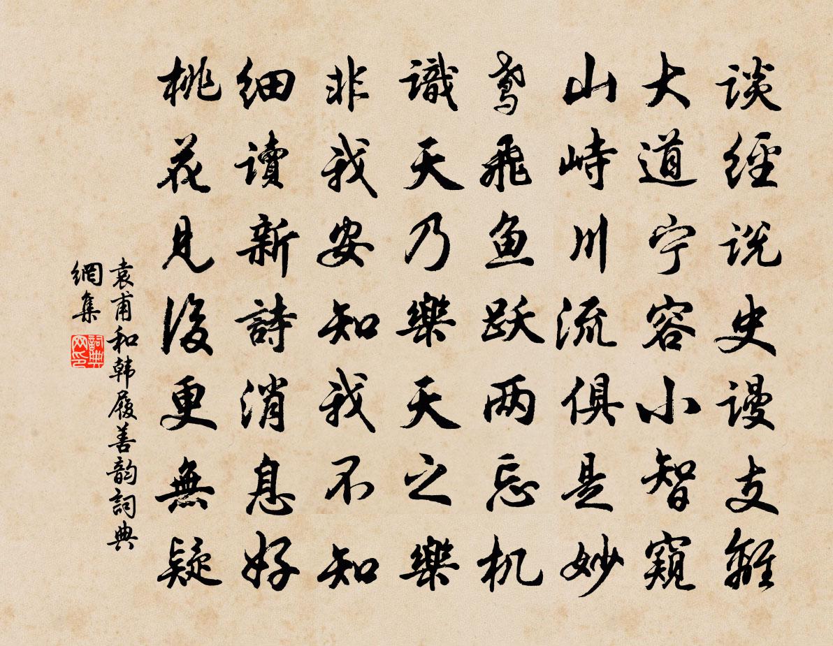 詩詞名句歷史字典書法欣賞書法字典國語詞典說文解字康熙字典古漢語字典標 題 作 者 詩 句 和韓履善韻作者:袁甫 朝代:宋代和韓履善韻原文談經說史謾支離,大道寧容小智窺。山峙川流俱是妙,鳶飛魚躍兩忘機。識天乃樂天之樂,非我安知我不知。細讀新詩訊息好,桃花見後更無疑。詩詞問答問:和韓履善韻的作者是誰?答:袁甫問:和韓履善韻寫於哪個朝代?答:宋代袁甫和韓履善韻書法欣賞和韓履善韻書法作品詩詞推薦秋懷五首簡陳巽叔徐伯老王炎〔宋代〕我來今幾時,寒暑已一變。回首望江東,天末雁行遠。弧矢四方誌,別離詎能免。有懷先君子,生理只鉛槧。相憶立夏日泛舟游青山憩楊氏庵示諸生孫應時〔宋代〕歲序忽雲夏,青春去安歸。天清風氣朗,遊子懷芳菲。碧湖泛我舟,輕雲湛晴暉。入谷山寂寂,緣溪水圍圍。悠然猿方岳〔宋代〕三峽巴江水,何年籬爾群。艱難俱未免,清切不堪聞。羈旅仍春蒲,愁懷況暮雲。尚思靈澗冷,蘿蔦月紛紛。春雨陸游〔宋代〕湖上新春柳,搖搖欲喚人。多情今夜雨,先洗馬蹄塵。酬令裕見寄之什李呂〔宋代〕伯才不鼓琴,良為知音撤。淵明琴無弦,荊扉晝常閉。吾道傳滄洲,初不待識別。叔孫志諧俗,禮樂用綿蕝。子陵寄題資州錢固秀才道勝堂梅堯臣〔宋代〕醮壇舊山下,高臥一儒生。有室羅經籍,無心取組纓。芋肥收歲計,柑熟摘霜晴。暫向京都見,添書入蜀城。送倪正父尚書守南徐樓鑰〔宋代〕幾回去國向吳興,出處雖高事不平。茲以優恩臨北固,不妨禁直寓西清。羨君決去行何速,愧我求歸計未成。淛水寄元齡弟五首裘萬頃〔宋代〕莫怪窮年不入州,載書前已會盟鷗。市朝畢竟多塵事,且傍溪山靜處留。游清潭呂資益蟠谷絕清潭劉過〔宋代〕一潭清淨水無泥,潭岩無泥石更奇。擬待月明垂釣去,前溪雨足怕龍歸。江上望皖公山李白〔唐代〕奇峰出奇雲,秀木含秀氣。清宴皖公山,巉絕稱人意。獨游滄江上,終日淡無味。但愛茲嶺高,何由討靈異。默然重到城東有感三首鄭獬〔宋代〕仙桃移在玉欄初,紅抹胭脂嫩點酥。聞道飄零落人世,清香得似舊時無。奉同黃檗慧公秀峰昌公丁巳上元日訪鼓山珪公張元乾〔宋代〕孤雲乘天風,飛入海上山。松聲發鼓吹,導我登層巒。平生煙霞想,政在岩壑間。及茲百事懶,作意三日閒。聊將許子遇示二絕句見索亂道因次韻奉酬毛滂〔宋代〕筆頭風月無多子,儘是前人追琢余。豈有聲名到溫李,僅能楚些屬三閭。詠貧士 其三陶淵明〔魏晉〕榮叟老帶索,欣然方彈琴。原生納決履,清歌暢商音。重華去我久,貧士世相尋。弊襟不掩肘,藜羹常乏斟。豈忘新橋上岸董嗣杲〔宋代〕雨陰忽收霽,雲氣失閉封。才轉橫里港,西睨南北峰。似慰畸人歸,天亦開喜容。萬僝與萬僽,銷鑠無留蹤。近京失調名徐似道〔宋代〕問竹平安,點花番次。池陽醉歌贈匡廬處士姚岩傑顧雲〔唐代〕九華太守行春罷,高絳紅筵壓花榭。四面繁英拂檻開,帖雪團霞墜枝亞。空中焰若燒藍天,萬里滑靜無纖煙。弦索唐多令(苕溪有牧之之感)尹煥〔宋代〕苹末轉清商。溪聲供夕涼。緩傳杯、催喚紅妝。慢綰烏雲新浴罷,裙拂地、水沈香。歌短舊情長。重來驚鬢霜。悵宿揚子津寄潤州長山劉隱士①孟浩然〔唐代〕所思在夢寐,欲往大江深。日夕望京口,煙波愁我心。心馳茅山洞,目極楓樹林。②不見少微星,風霜徒夜吟。③別徐商老奉祠歸清江五首彭龜年〔宋代〕法許公不許,法不如公嚴。公不為我留,寧避世俗嫌。名句推薦女蘿發馨香,菟絲斷人腸。李白《古意》 山一程,水一程,身向榆關那畔行,夜深千帳燈。納蘭性德《長相思·山一程》 坑灰未冷山東亂,劉項原來不讀書。章碣《焚書坑》 君歌楊叛兒,妾勸新豐酒。李白《楊叛兒》 又說今夕天津,西畔重歡遇。吳文英《荔枝香近·七夕》 天涯芳草迷歸路,病葉還禁一夜霜。王夫之《初度口占·辛丑》 風煙俱淨,天山共色。吳均《與朱元思書》 詩酒趁年華。蘇軾《望江南·超然台作》 事業文章隨身銷毀,而精神萬古如新洪應明《菜根譚·概論》 松花釀酒,春水煎茶。張可久《人月圓·山中書事》