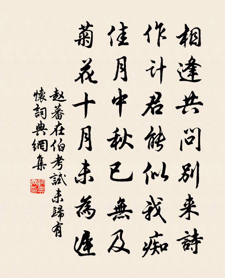 詩詞名句歷史字典書法欣賞書法字典國語詞典說文解字康熙字典古漢語字典標 題 作 者 詩 句 在伯考試未歸有懷作者:趙蕃 朝代:宋代在伯考試未歸有懷原文相逢共問別來詩,作計君能似我痴。佳月中秋已無及,菊花十月未為遲。詩詞問答問:在伯考試未歸有懷的作者是誰?答:趙蕃問:在伯考試未歸有懷寫於哪個朝代?答:宋代趙蕃在伯考試未歸有懷書法欣賞在伯考試未歸有懷書法作品詩詞推薦對雪寄荊幕知己齊己〔唐代〕猛勢微開萬里清,月中看似日中明。此時鷗鷺無人見,何處關山有客行。郢唱轉高誰敢和,巴歌相顧自銷聲。江齋臨江仙 繼重陽韻馬鈺〔元代〕大悟立身蓑笠好,遇投相應回頭。訓予全道號無憂。慧眸觀玉洞,雲步上瓊樓。赤雁頭鑽清宴地,白鷗足捧浮漚。閒看佛書郭印〔宋代〕金仙入漢夢,始聞佛法東。梁武好尤篤,上下爭尊崇。尋譯到李唐,伽藍棟宇充。煌煌五千卷,披讀未易終。楞嚴明堂觀禮雜詠十三首端門觀習肆赦儀王同祖〔宋代〕百官常服拱端門,丹鳳銜書下九閽。宰相近前宣授了,齊班舞蹈謝君恩。孝宗皇帝輓詞五首陳傅良〔宋代〕好學元無斁,忘疲晚有加。明謨宗六藝,妙用合三家。照映天經緯,流傳士齒牙。奎文尊閣處,更合榜重華。悼邦節弟姜特立〔宋代〕皇考憐同出,青已並廬。前春曾訪我,無月不來書。易感中年後,難忘少長初。倏然成夢幻,歲晚重欷噓。薔薇花董嗣杲〔宋代〕接夏連春秀可夸,東山雲月滿誰家。浪埋纖刺翻晴錦,綃綴柔條熨暮霞。海外有瓶還貯水,亭前無洞可藏花。多年弱柳張詠〔宋代〕枝莖何弱種何緣,著架扶持勢可憐。但見低垂長衛足,更無疏疏欲參天。離情謾指千條線,野興堪驚一點菸。最惜集英殿秋宴教坊詞致語口號臣聞天無言而四時蘇軾〔宋代〕霜霏碧瓦尚生煙,日泛彤庭已集仙。靄靄四門多吉士,熙熙萬國屢豐年。高秋爽氣明宮殿,元佑和聲入管弦。菊有寄王正叔王令〔宋代〕微生不過人,氣力兩眇麽。力學失自謀,徑古與今左。病世相陷賊,樹性期剛果。豈不中是時,然亦未嘗過。奈何次仲舅韻寄拙庵樓鑰〔宋代〕公居山外我城中,不見成疏見亦空。要是歸來當一見,待攜藜杖訪支公。送李堅甫中舍奉使還闕文同〔宋代〕曾歌出塞愁,又遣使西州。去國星辰動,還家歲月流。褒斜新路晚,鄠杜故園秋。歸對延和殿,從容問講求。題李愬畫像惠洪〔宋代〕淮陰北面師廣武,其氣豈只吞項羽。君得李佑不肯誅。便知元濟在掌股。羊公德行化悍夫,臥鼓不戰良驕吳。公方題故李賓客廬山草堂許彬〔唐代〕難窮林下趣,坐使致君恩。術業行當代,封章動諫垣。已明邪佞跡,幾雪薜蘿冤。報主深知此,憂民詎可論。名將至揚州文天祥〔宋代〕吾戴吾頭向廣陵,仰天無告可憐生。爭如負命投東海,猶會乘風近玉京。棹歌蔣堂〔宋代〕湖之水兮碧泱泱,環越境兮潤吳疆。蒲螺所萃兮雁鶩群翔,朝有行艫兮幕有歸艎。茭牧狎至兮漁采相望,溉我田疇戲答天休宋祁〔宋代〕老書堆幾寧堪讀,酸酒盈樽不用賒。料得君非貪九錫,短轅長柄趣還家。清平樂袁去華〔宋代〕嫩涼新霽。明月光如洗。長笛一聲煙際起。人在危樓獨倚。夜深風露娟娟。抱琴誰和流泉。只有乘鸞仙子,見人愁王夫人輓詞樓鑰〔宋代〕閫內誰無助,夫人事特明。傾囊資色養,勉學就清名。遯世期高節,辭風嘆落英。丁寧猶在耳,伉儷若為情。春秋戰國門趙宣子周曇〔唐代〕門人曾不有提彌,連嗾呀呀孰敢支。臨難若教無苟免,亂朝爭那以獒為。名句推薦利莫長乎簡,福莫久於安。韓非及後人《韓非子·大體》 不怨天,不尤人。孔子弟子《論語·憲問篇》 百星之明不如一月之光,十牖之開,不如一戶之明。劉安及其門客《淮南子·說林訓》 晚食以當肉,安步以當車劉向《戰國策·齊四·齊宣王見顏斶》 桂花浮玉,正月滿天街,夜涼如洗。文徵明《念奴嬌·中秋對月》 月明星稀,烏鵲南飛。繞樹三匝,何枝可依?曹操《短歌行》 風塵荏苒音書絕,關塞蕭條行路難。杜甫《宿府》 懸衡而知平,設規而知圓。韓非及後人《韓非子·飾邪》 回首天涯,一抹斜陽,數點寒鴉。張可久《折桂令·九日》 西窗下,風搖翠竹,疑是故人來。秦觀《滿庭芳·碧水驚秋》