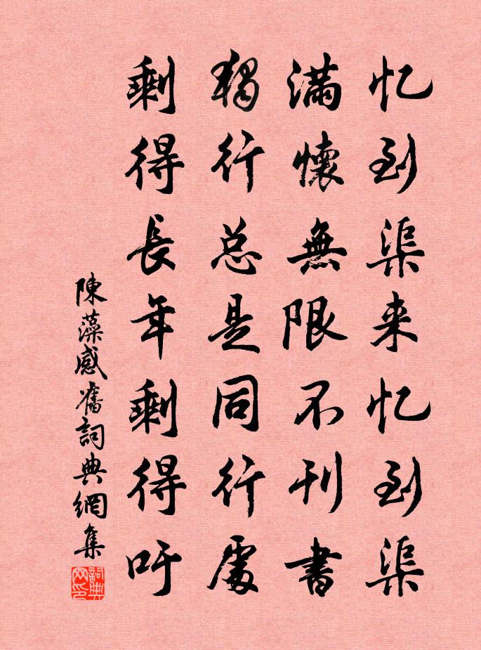詩詞名句歷史字典書法欣賞書法字典國語詞典說文解字康熙字典古漢語字典標 題 作 者 詩 句 感舊作者:陳藻 朝代:宋代感舊原文憶到渠來憶到渠,滿懷無限不刊書。獨行總是同行處,剩得長年剩得吁。詩詞問答問:感舊的作者是誰?答:陳藻問:感舊寫於哪個朝代?答:宋代陳藻感舊書法欣賞感舊書法作品詩詞推薦嘉樹韓維〔宋代〕殘芳不入眼,愛此嘉樹秀。青雲重欲垂,翠幄遠相鬥。輕涼迎早夏,繁影亂清晝。茲日更徘徊,聊攜一樽酒。漁父(二)戴復古〔宋代〕漁父醉,釣竿閒。柳下呼兒牢繫船。高眠風月天。巴女謠於鵠〔唐代〕巴女騎牛唱竹枝,藕絲菱葉傍江時。不愁日暮還家錯,記得芭蕉出槿籬。郭漢卿母輓詩楊萬里〔宋代〕婦節今安仰,斯人古有光。雞鳴不知雨,薺茂獨凌霜。未拜金花誥,空悲玉樹郎。藤輿簾蹙繡,無復出萱堂。重至秀山售屋將歸十首方回〔宋代〕雖曾為太守,過似布衣貧。未足肩前輩,猶應勝近人。苦吟常不寐,得句忽如神。玉食轘東市,何如保幅巾。送馮夢授試禮部李新〔宋代〕年來初識小馮君,鞭靮何妨馭晏嬰。三世卿雲涪水秀,一門巢許蜀山清。飄零殊幸逢公子,邂逅相看不世情。入手濰縣署中畫竹呈年伯包大丞括 / 墨竹圖題詩鄭燮〔清代〕衙齋臥聽蕭蕭竹,疑是民間疾苦聲。些小吾曹州縣史,一枝一葉總關情。宣州雜詩二十首梅堯臣〔宋代〕高林似吳鴨,滿樹蹼鋪鋪。結子繁黃李,炮仁瑩翠珠。禮農本草闕,夏禹貢書無。遂壓葡萄貴,秋來遍上都。次畢叔文見貽二首趙蕃〔宋代〕寂寞吾知貴,紛華世所榮。常評敗素紫,孰愈濁纓清。爵祿心無食,山林志有盟。幽居自空谷,哲婦乃傾城。和岳國華仇遠〔宋代〕廣文飯少甑生塵,老去衰顏酒借春。吟癖何曾醫不得,古來清瘦是詩人。有感張耒〔宋代〕鬢毛已自秋來變,髀肉仍於馬上消。滿眼青山不歸去,強顏微祿亦何聊。王深道奏名而歸戴復古〔宋代〕忠言犯時忌,決不中高科。一日成名了,諸公屬望多。還家寧久住,經世欲如何。西澗一泓水,行通滄海波。題唐師善洪崖圖方回〔宋代〕其說謂洪崖者,三皇時有道之士,唐明皇時張氳召見,即其人。端明洪公舜俞集中有此詩,予不敢信。今俗畫非止八聲甘州(正月二日作是歲閏正月十四才立春)葉夢得〔宋代〕又新正過了,問東風、訊息幾時來。笑春工多思,留連底事,猶未輕回。應為瑤刀裁翦,容易惜花開。試向湖邊望偈頌七十二首釋祖欽〔宋代〕上無敵,下無比。擬議思量,劍去久矣。見得親,用得到。信手拈來,又卻恰好。暮春泛西湖次口號韻呈程待制十首陳造〔宋代〕幾飯南山佛老宮,詩昌譚勝每舂容。不妨重就山間宿,蔬筍香茶未闕供。送裴侍御赴歲入京(得陽字)岑參〔唐代〕羨他驄馬郎,元日謁明光。立處聞天語,朝回惹御香。台寒柏樹綠,江暖柳條黃。惜別津亭暮,揮戈憶魯陽。和檀香板蘇頌〔宋代〕鏤檀芬馥貫縚衺,擊玉敲金一串花。自與麗妃親記曲,後來傳玩幾人家。小重山元好問〔金代〕酒冷燈青夜不眠。寸腸千縷、兩相牽。鴛鴦秋雨半池蓮。分飛苦,紅淚曉風前。天遠雁翩翩。雁來人北去、遠如天頌一百則釋重顯〔宋代〕超譚禪客問偏多,縫罅披離見也麽。糊餅{上祝下土}來猶不住,至今天有淆訛。名句推薦花漸凋疏不耐風,畫簾垂地晚重工,墮階縈蘚舞愁紅孫光憲《浣溪沙·花漸凋疏不耐風》 人閒桂花落,夜靜春山空。王維《鳥鳴澗》 我歌君起舞,潦倒略相同。陳師道《除夜對酒贈少章》 行非恆者,天禁之。爽事,地禁之。佚名《黃帝四經·十大經·三禁》 西風烈,長空雁叫霜晨月。 * 《憶秦娥·婁山關》 不近人情,舉世皆畏途;不察物情,一生俱夢境。陳繼儒《小窗幽記·集醒篇》 譽人不增其美。王充《論衡·卷八·藝增篇》 蛛絲暗鎖紅樓,燕子穿簾處。吳文英《荔枝香近·七夕》 自見者不明;自是者不彰老子《老子·道經·第二十四章》 終日兩相思。為君憔悴盡,百花時。溫庭筠《南歌子·倭墮低梳髻》