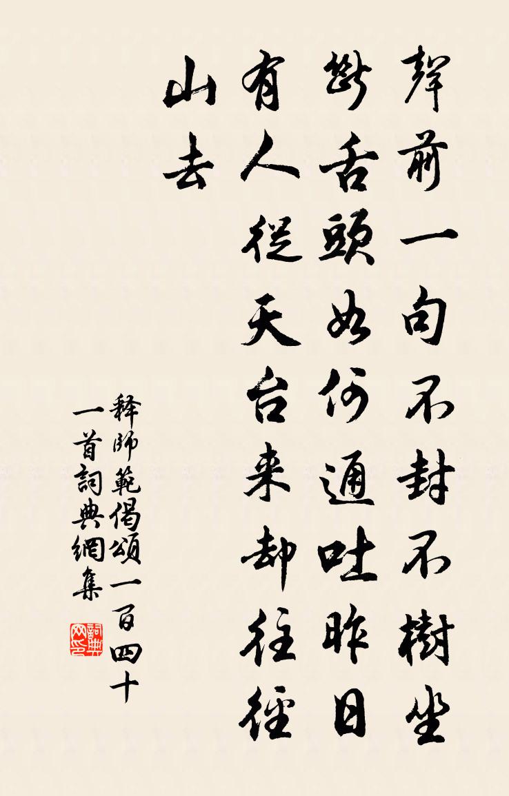 詩詞名句歷史字典書法欣賞書法字典國語詞典說文解字康熙字典古漢語字典標 題 作 者 詩 句 偈頌一百四十一首作者:釋師範 朝代:宋代偈頌一百四十一首原文聲前一句,不封不樹。坐斷舌頭,如何通吐。昨日有人從天台來,卻往徑山去。詩詞問答問:偈頌一百四十一首的作者是誰?答:釋師範問:偈頌一百四十一首寫於哪個朝代?答:宋代釋師範偈頌一百四十一首書法欣賞偈頌一百四十一首書法作品詩詞推薦秋日送客梁山道中晁公溯〔宋代〕白露下木末,寒蜩抱枝鳴。道帝幾官樹,稍稍棲烏驚。不知何為爾,蕭瑟來秋聲。遙山斂暝色,涼月含空明。吾其詠宣律和尚袈裟張希復〔唐代〕共覆三衣中夜寒,披時不鎮尼師壇。無因蓋得龍宮地,畦里塵飛葉相殘。奉和聖制幸韋嗣立山莊應制武平一〔唐代〕鳴鑾赫奕下重樓,羽蓋逍遙向一丘。漢日唯聞白衣寵,唐年更睹赤松游。次諸公詩韻陳造〔宋代〕牆圍護風煙,檐影納紅綠。城西百弓地,論價指和玉。滄浪取具體,輞川儼遺躅。年時得小憩,振衣休汗足。山靈偶成葉茵〔宋代〕醉敲牛角過前村,此世應無利祿昏。有水可漁田可稼,即松而徑竹而門。賓朋連屬琴書樂,亭榭參差鳥雀喧。不假點絳唇葉夢得〔宋代〕高柳蕭蕭,睡餘已覺西風勁。小窗人靜。淅瀝生秋聽。底事多情,欲與流年競。殘雲瞑。墜巾慵整。獨立芝蘭徑。投宿湘東趙蕃〔宋代〕霧雨雜炊煙,山巔復樹巔。初疑但紛若,有聽勿騷然。立馬看題壁,沖鷗喚渡船。莫嗟飢雁外,且及暮鴉前。留別司馬太守王昌齡〔唐代〕辰陽太守念王孫,遠謫沅溪何可論。黃鶴青雲當一舉,明珠吐著抱君恩。清平樂·春光欲暮毛熙震〔唐代〕春光欲暮,寂寞閒庭戶。粉蝶雙雙穿檻舞,簾卷晚天疏雨。含愁獨倚閨幃,玉爐煙斷香微。正是銷魂時節,東風滿感山十詠慈航姚勉〔宋代〕佛手撐慈航,尚欲濟我人。寄語作舟者,江濤渺無津。因在秀州寄王道夫詩三首葉適〔宋代〕潘君狂甚詩能古,葉子文高世莫驚。何處有田求二頃,向來三月決歸耕。夏日寄朴翁朴時在靈隱姜夔〔宋代〕風只松樹枝,懷念松間友。雲從北山來,令我屢回首。山靈夜放起,山雨侵人衣。遙知竹窗里,自吟新雨詩。循梅路口四首劉克莊〔宋代〕導吏倉忙乞調兵,未應機動遣鷗驚。傳聞老子腳踏車至,慚愧偷兒讓路行。示上元主簿釋心月〔宋代〕單提一字趙州無,三尺吹毛也不如。萬別千差齊斬斷,白雲不敢犯清虛。乾道七年恭上太上皇帝太上皇后尊號十一首佚名〔宋代〕斂福於郊,逢時之泰。揭名日月,侔德覆載。自我作古,域中有大。永言保之,眉壽無害。次韻張巨山正月十日游天竺朱翌〔宋代〕欲飯雲邊寺,先尋湖上春。山川良是舊,歲月又更新。草長煙如積,梅晴粉自勻。久留知不可,暫過卻須頻。寄故姬江陵士子〔唐代〕陰雲冪冪下陽台,惹著襄王更不回。五度看花空有淚,一心如結不曾開。纖蘿自合依芳樹,覆水寧思返舊杯。惆悵題靈岩洞李知已〔宋代〕三岩九洞絕塵寰,問訊真人得縱觀。丹就已乘仙鶴去,雲深元有老龍蟠。鐵船泛海源流遠,玉柱擎天星斗寒。劈破離郡五絕劉克莊〔宋代〕赫赫戎衣定,區區扣馬非。如何孤竹子,嫌粟不嫌薇。偈十三首釋慧空〔宋代〕低頭不見地,仰面不見天。欲知白牛處,但看髑髏前。名句推薦遮莫圓明似前度,不知誰續廣寒游。慧霖《閏中秋玩月》 空山松子落,幽人應未眠。韋應物《秋夜寄邱員外 / 秋夜寄丘二十二員外》 古人不見今時月,今月曾經照古人。佚名《增廣賢文·上集》 故知之始己,自知而後知人也。王詡《鬼谷子·反應》 忽如一夜春風來,千樹萬樹梨花開。岑參《白雪歌送武判官歸京》 終日兩相思。為君憔悴盡,百花時。溫庭筠《南歌子·倭墮低梳髻》 朕以天下為憂,豈直一 方耶?脫脫《宋史·本紀·卷六》 愛人者此為博焉,利人者此為厚焉。墨子《墨子·26章 天志(上)》 幽徑無人獨自芳,此恨憑誰訴。曹組《卜運算元·蘭》 夸而有節,飾而不誣劉勰《文心雕龍·誇飾》