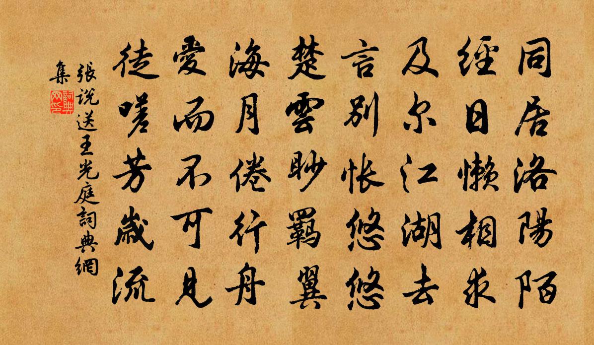 詩詞名句歷史字典書法欣賞書法字典國語詞典說文解字康熙字典古漢語字典標 題 作 者 詩 句 送王光庭作者:張說 朝代:唐代送王光庭原文同居洛陽陌,經日懶相求。及爾江湖去,言別悵悠悠。楚雲眇羈翼,海月倦行舟。愛而不可見,徒嗟芳歲流。詩詞問答問:送王光庭的作者是誰?答:張說問:送王光庭寫於哪個朝代?答:唐代問:送王光庭是什麼體裁?答:五古張說送王光庭書法欣賞送王光庭書法作品注釋全唐詩:卷86_16詩詞推薦約訪王卿已而中輟次韻樓鑰〔宋代〕歸來親戚話通情,準擬流花得再行。已荷適齋容接武,敢從酌古遽渝盟。烏衣門巷我非遠,綠野樽罍計未成。官已和資政侍郎湖亭雜詠絕句十首小橋梅堯臣〔宋代〕伐桂向芳洲,跨波灣勢小。時愛遊人渡,遊人在林杪。知縣再次韻不作平側體複次韻二首曹彥約〔宋代〕步出山前坂,遙望徒驚心,下無百尺流,上無千歲林。至人有遺言,三嘆金玉音。莫飲盜泉水,莫息惡木陰。重午王鎡〔宋代〕絲絲梅雨濕榴花,處處釵符裊鬢鴉。醉聽畫樓思遠曲,艾枝簪滿碧巾紗。挽知容詐明請陶公羅一鶚〔宋代〕月旦爭推重,邦人得范模。官資雖刺史,氣味一寒儒。簡淡根真性,清廉律薄夫。不知收卓行,曾入史編無。憶帝京(贈彈琵琶妓)黃庭堅〔宋代〕薄妝小靨閒情素。抱著琵琶凝佇。慢拈復輕攏,切切如私語。轉撥割朱弦,一段驚沙去。萬里嫁、烏孫公主。對易懷紫閣隱者杜荀鶴〔唐代〕紫閣白雲端,雲中有地仙。未歸蓬島上,猶隱國門前。洞口人無跡,花陰鹿自眠。焚香賦詩罷,星月冷遙天。月岩方岳〔宋代〕怪石堆雲矗大空,女媧練出廣寒宮。一輪常滿陰晴見,萬古無虧晝夜同。搗藥聲繁驅白兔,漏天孔正透清風。光明金盞子(水仙)趙以夫〔宋代〕得水能仙,似漢皋遺珮,碧波涵月。藍玉暖生煙,稱縞袂黃冠,素姿芳潔。亭亭獨立風前,照冰壺澄徹。當時事,題九仙宮高獻民〔宋代〕迢遞尋真到紫壇,參差樓閣倚層巒。三株樹古巢玄鶴,五粒松低下素鸞。煙暖芝田應有玉,樹封藥灶已無丹。昔人和光亭何耕〔宋代〕枯木倚寒岩,三冬無暖氣。達人定汝笑,胸中太涇渭。不妨聲色海,徑造佛祖地。所以亦樂翁,花前時一醉。答徐耘朝散李復〔宋代〕昔年汾水上,曾遇海南翁。欲問三山路,先知一溉功。萬紛銷寂默。一氣抱沖融。更約丹砂訣,他時訪葛洪。張宛丘寄衣曲艾性夫〔宋代〕衷甲蔥河不記春,何須更比小郎身。只消狹剪征衫去,塞雪邊風最瘦人。龍游八景雙港明月鄭得彝〔宋代〕沄沄逝水夾滄洲,金耀浮光碎碧流。夜半漁歌聲再起,一天明月兩溪秋。和劉後村梅花百詠方蒙仲〔宋代〕含章遺蹟杳難詳,漢苑唐都更可傷。說與詩人莫嘲詠,梅花眼見幾興亡。題曾運使水亭張明中〔宋代〕笥山之水磨銅綠,秀氣都在山之麓。就中卜築小仙居,面面軒亭看不足。主人倒屣浮春容,囊詩拶破古錦紅。書生楚辭三章送郭教授趨朝陳造〔宋代〕昔尚父之之國,嘗寢甘而見譏。懷與安其費日,亦館人之或知。豈以抱當世之志,而常後可為之時耶。有美一人兮朱橋早行方回〔宋代〕田間夜打稻,茅茨耿明燈。客行過籬外,吠犬似可憎。放馬齧露草,小憩寒塘塍。坐念今民間,貪吏無與繩。幸此帝城秋望寇準〔宋代〕登臨秋向盡,千里見王畿。過雨山逾翠,經霜菊漸稀。平原夕靄起,高樹宿禽歸。一望關河道,空令詠式微。題黃唐伯一經堂楊萬里〔宋代〕人言天地生仲尼,不知仲尼生兩儀。易中先自有太極,生天生地誰得知。一經以後脈為六,六經以前一經足。學子名句推薦山雪河冰野蕭瑟,青是烽煙白人骨。杜甫《悲青坂》 扶桑已在渺茫中,家在扶桑東更東。韋莊《送日本國僧敬龍歸》 竹塢無塵水檻清,相思迢遞隔重城。李商隱《宿駱氏亭寄懷崔雍崔袞》 誰道投鞭飛渡,憶昔鳴髇血污,風雨佛狸愁辛棄疾《水調歌頭·舟次揚州和人韻》 明月隨良掾,春潮夜夜深。王昌齡《送郭司倉》 勸君莫惜花前醉,今年花謝,明年花謝,白了人頭。趙秉文《青杏兒·風雨替花愁》 丈夫志,當景盛,恥疏閒。蘇舜欽《水調歌頭·滄浪亭》 為政不難,不得罪於巨室。孟子《孟子·離婁章句上·第六節》 亂山殘雪夜,孤燭異鄉人。崔塗《除夜 / 巴山道中除夜書懷 / 除夜有懷》 高齋今夜雨,獨臥武昌城。徐禎卿《在武昌作》